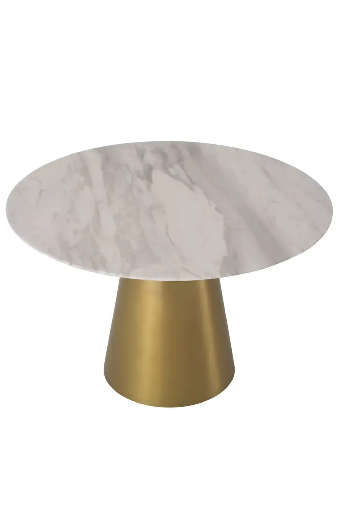 With its round marble top of white marble and tapered brass base. This sophisticated piece pairs a lustrous brushed brass finish with a unique travertine top, radiating timeless luxury. Dining Table Nathan encapsulates the essence of a contemporary design. Simple, elegant lines allow the noble material to take the spotlight. Decorate your home with this elegant piece for an undeniably distinguished look.