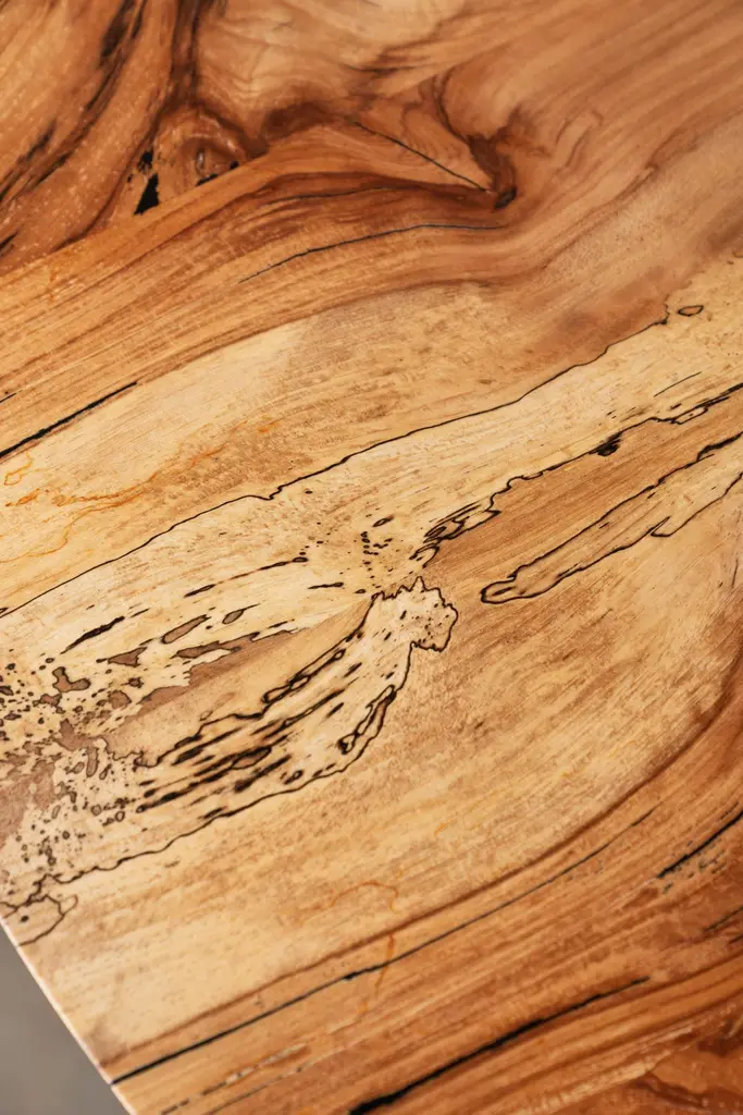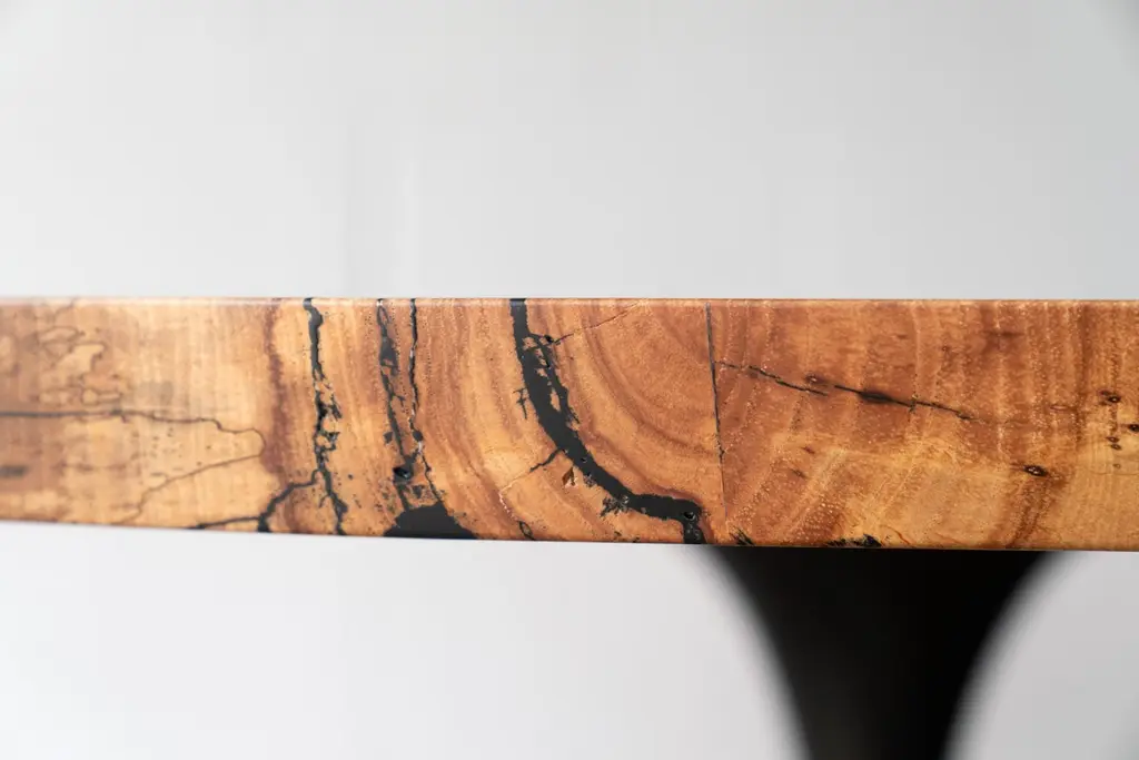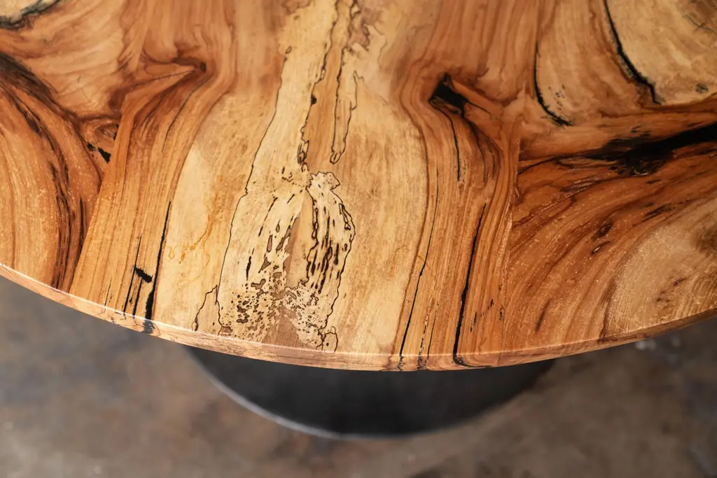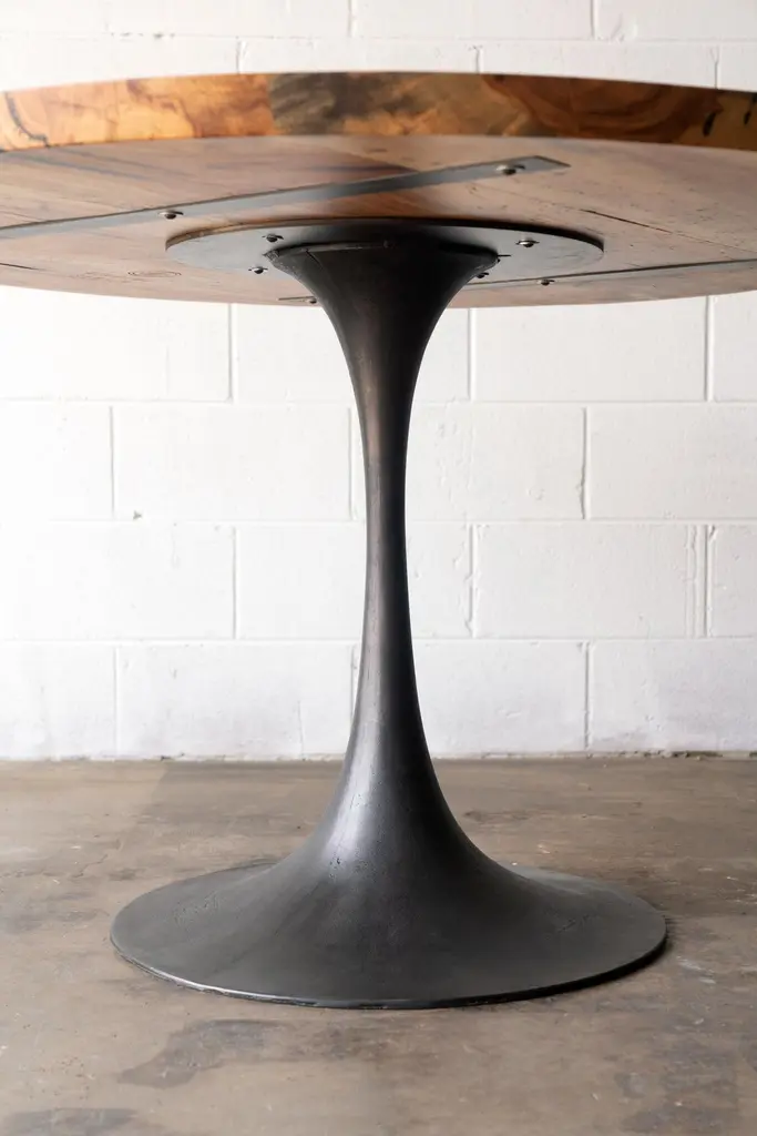 The Amicalola base captures the room set against a round or oval table top. Put it in your breakfast nook or display flowers in a grand entry. This pedestal base is hand cast by the artisans at Sloss Furnaces historic foundry in Birmingham to look beautiful and function out of the way of diner's feet. Rich with Mid-Century Modern inspiration, we conceived the name while hiking the 600 steel stairs that scale the face of Amicalola Falls, the gateway to the Appalachian Trail.Solid spalted pecan wood is finished with a durable, low-sheen urethane finish. Urban wood has character. Character can include variations in color and grain, small pin knots, evidence of historical intrusion. There may be cracks or knots that we fill, patch or join in a considered and artful way at the makers discretion. We look at every slab and decide what needs a patch or epoxy or both. Case by case, one may be more effective and better for the furniture, aesthetically, structurally, and for our process. If a specific tool, like a patch, is not desired, please specify this when ordering. This may require procuring different lumber which can alter costs.