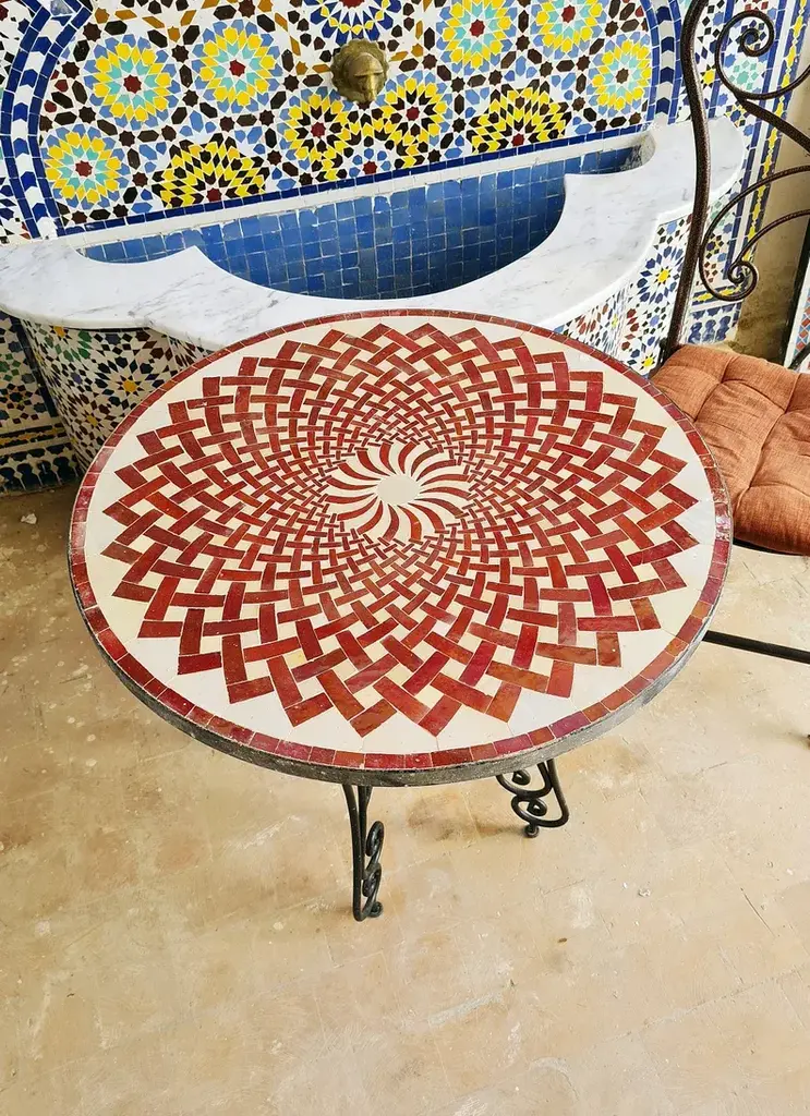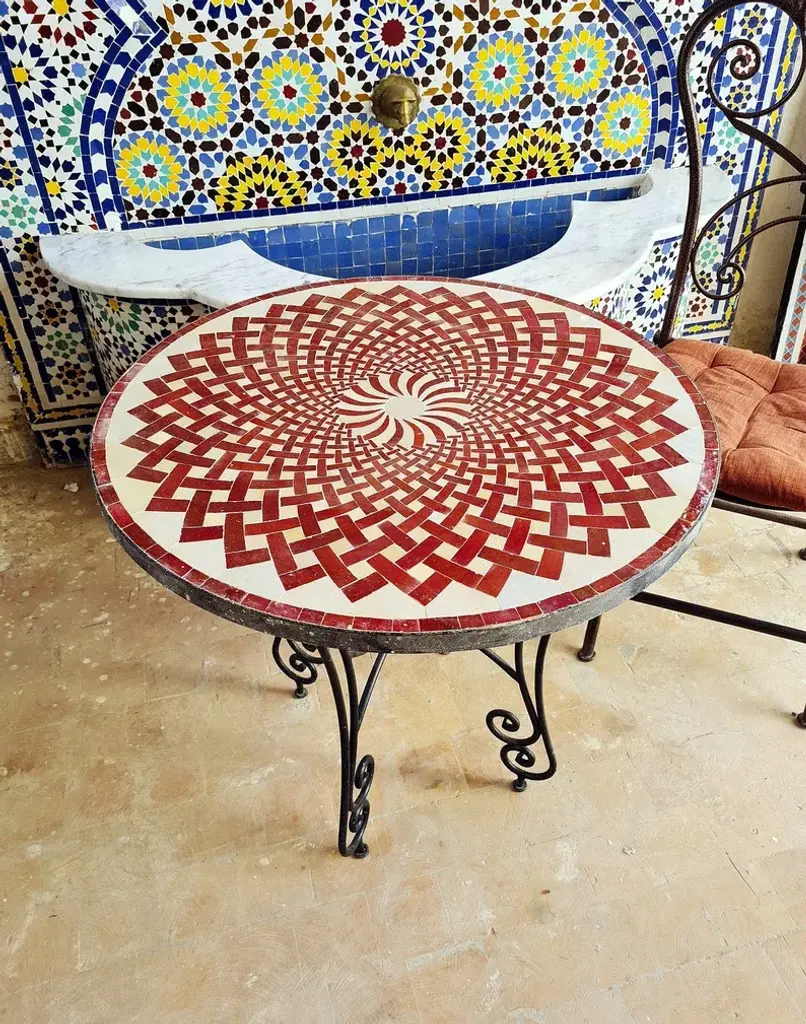 tiles table for An indoor / outdoor glazed Moroccan mosaic table, A very simple style, but with great handcraftsmanship. The tile table sit on an iron hand-forged base in black color. Great to use indoor or outdoor as a dining table or kitchen table. This patio, garden table will last a lifetime, tiles are inlaid into concrete. Zellij is a craft that has been passed down through the generations, Zellige craftsmens named as Maallems are true artists, most of them learn their crafts from family, fathers teach sons and so on, hopefully continuing for many years to come.