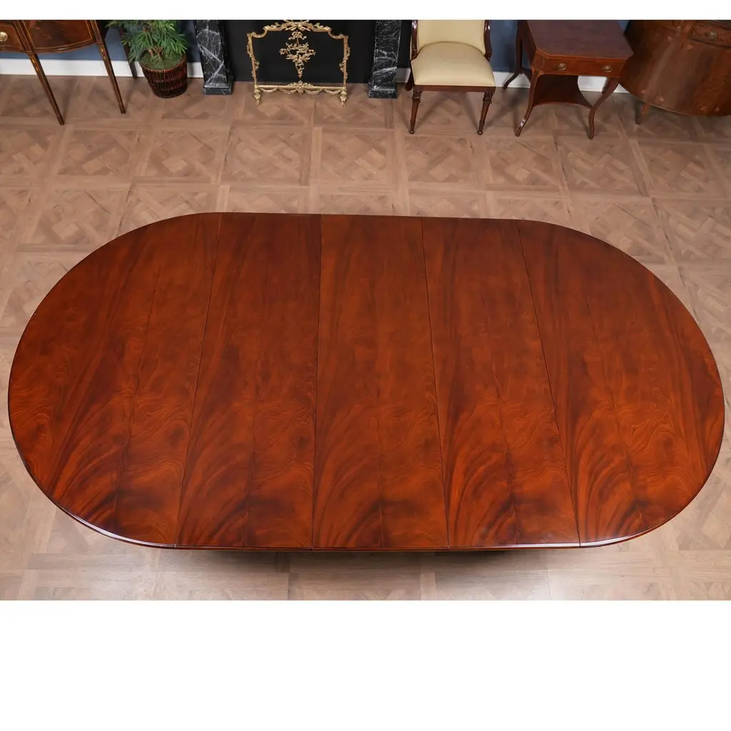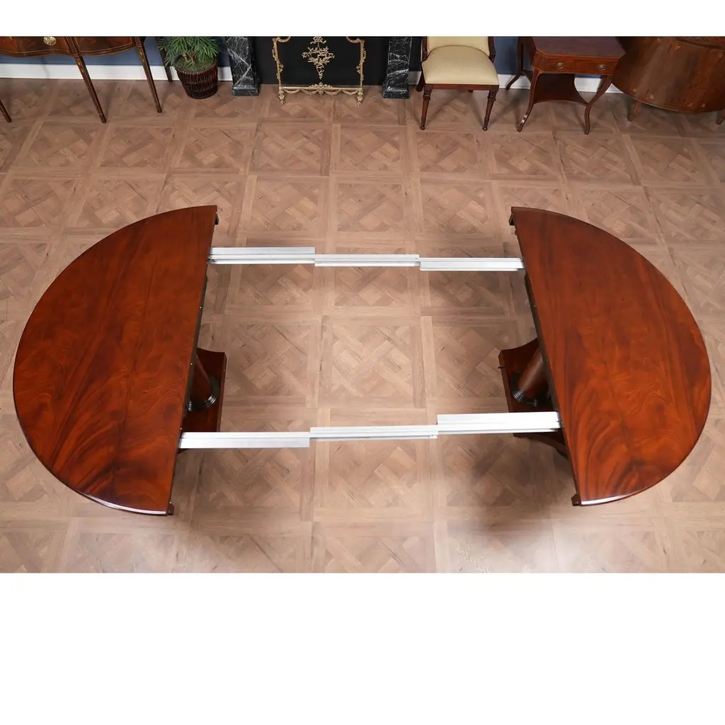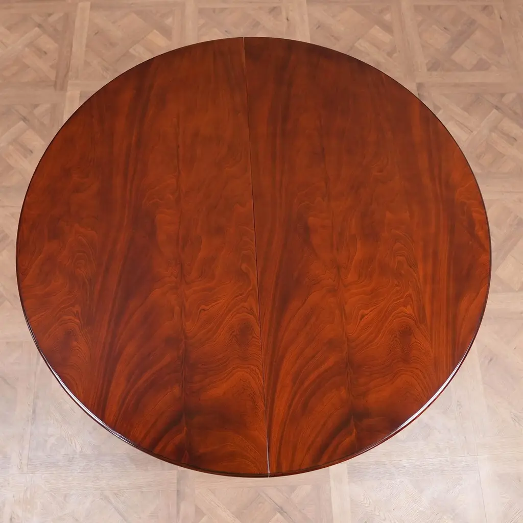 The Round Table with Empire Bases 60-115 inch is a high quality 60 inch round table when closed. The field of the table top being produced from the finest figural mahogany veneers and surrounded with a bull nose shaped molding. Three leaves can be inserted to extend the table to a maximum length of 115 inches. The leaves are held in place with solid metal fasteners and the table opens using metal rails. All of this is supported on two pedestals which bolt securely to the bottom of the table top. The pedestal details are hand carved from solid mahogany.A versatile dining table of high quality that can be used for smaller intimate dining parties without the leaves but large enough with the leaves in place for entertaining on a grand scale.Stock Photo for reference only. We take every measure to ensure that all of our dining tables are created to the highest standard using materials of similar quality but each table will appear slightly different due to the use of naturally occurring materials such as wood in the creation of our products.Measures 60″W x 60″L – 115″L x 31″H metric: 152 x 152-292 x 79
