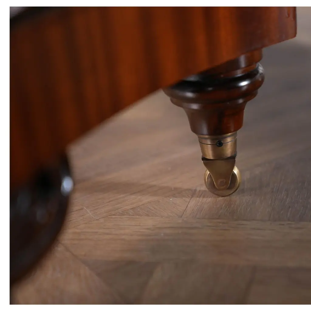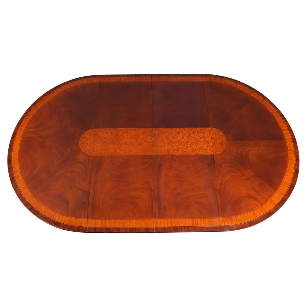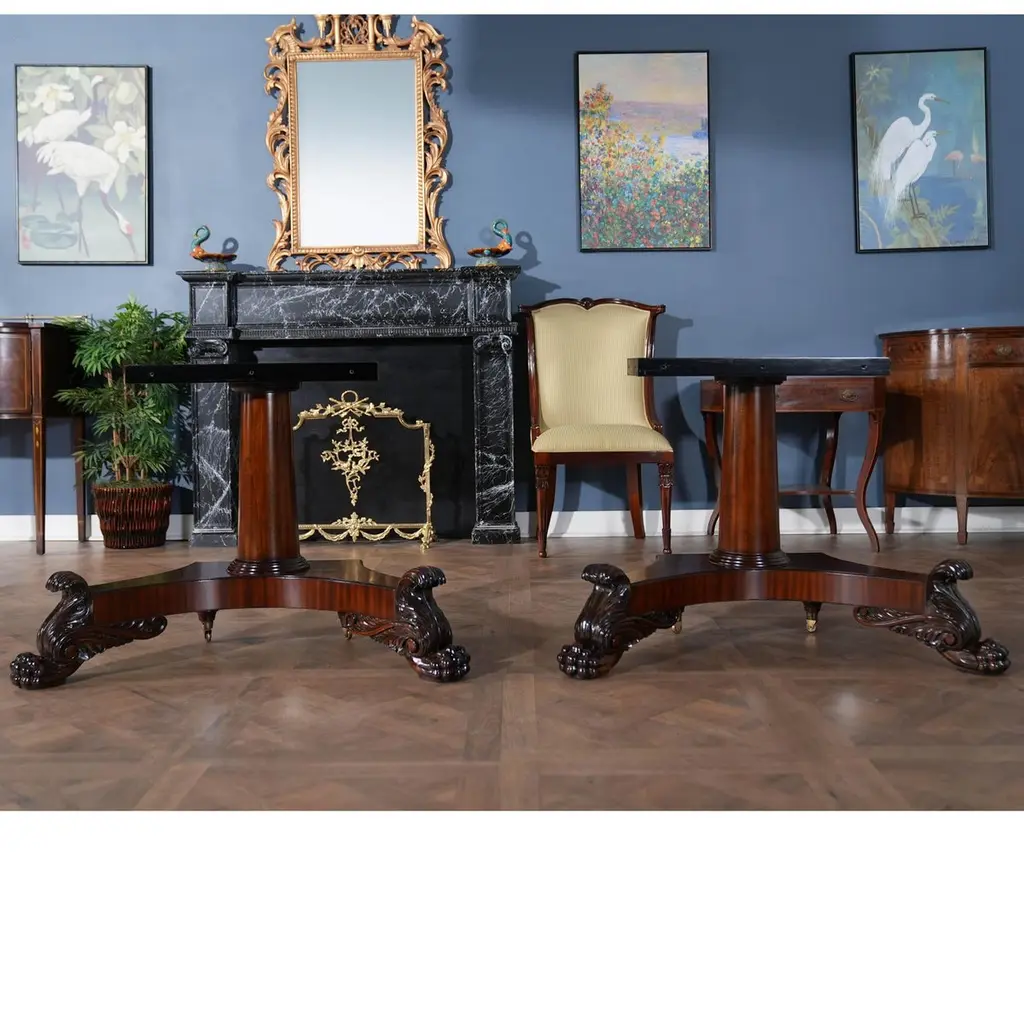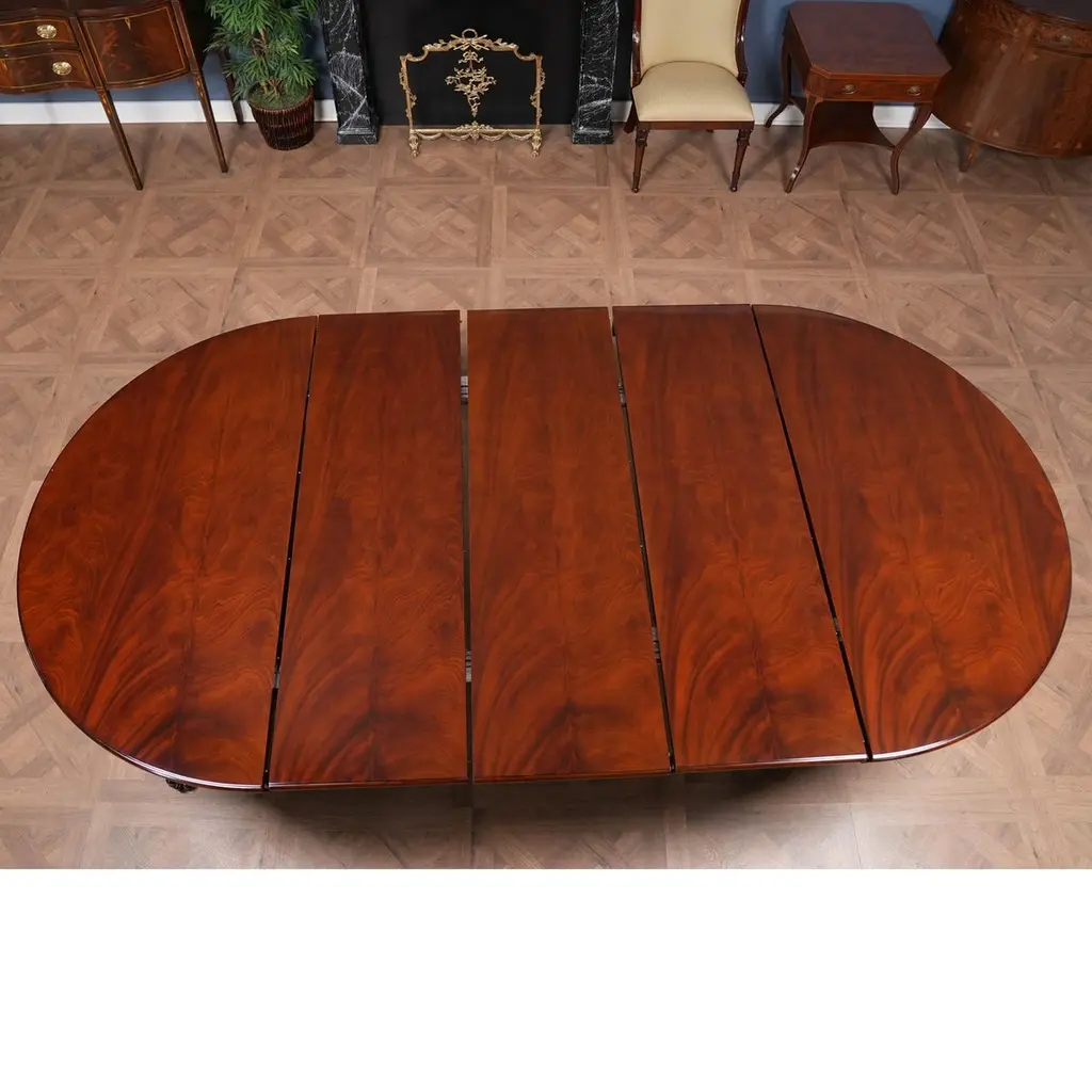 The Round Table with Empire Bases 60-115 inch is a high quality 60 inch round table when closed. The field of the table top being produced from the finest figural mahogany veneers and surrounded with a bull nose shaped molding. Three leaves can be inserted to extend the table to a maximum length of 115 inches. The leaves are held in place with solid metal fasteners and the table opens using metal rails. All of this is supported on two pedestals which bolt securely to the bottom of the table top. The pedestal details are hand carved from solid mahogany.A versatile dining table of high quality that can be used for smaller intimate dining parties without the leaves but large enough with the leaves in place for entertaining on a grand scale.Stock Photo for reference only. We take every measure to ensure that all of our dining tables are created to the highest standard using materials of similar quality but each table will appear slightly different due to the use of naturally occurring materials such as wood in the creation of our products.Measures 60″W x 60″L – 115″L x 31″H metric: 152 x 152-292 x 79