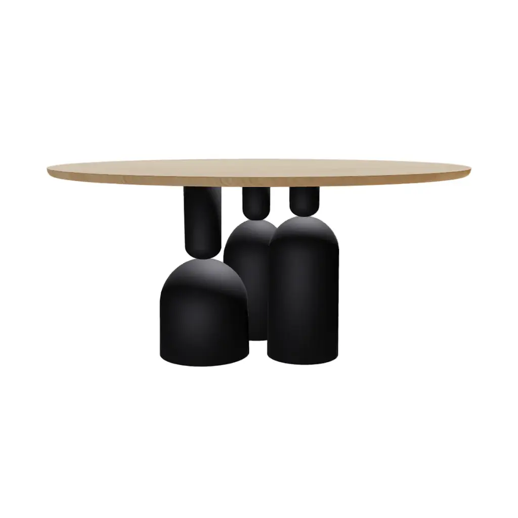In everyday life, tables are normally covered with various objects but the surface of the Cop tabletop, with its innovative table leg design, is like a stretch of water on which the objects are upturned to form its unusual base. Stylized elements inspired by bottles, precious chalices and champagne glasses, appear in various shapes and sizes and are immediately striking, even in their unusual position. The top is a neutral element yet, at the same time, it is the dividing line of the world that it reflects. Flexible lines and careful formal research create a table intended to bring people and ideas together. The base of the Cop table is in painted metal, in a single color or in burnished, matt brass or matt copper finishes. The fixed top is available in wood, ceramic or marble and can be round or with rounded edges.
