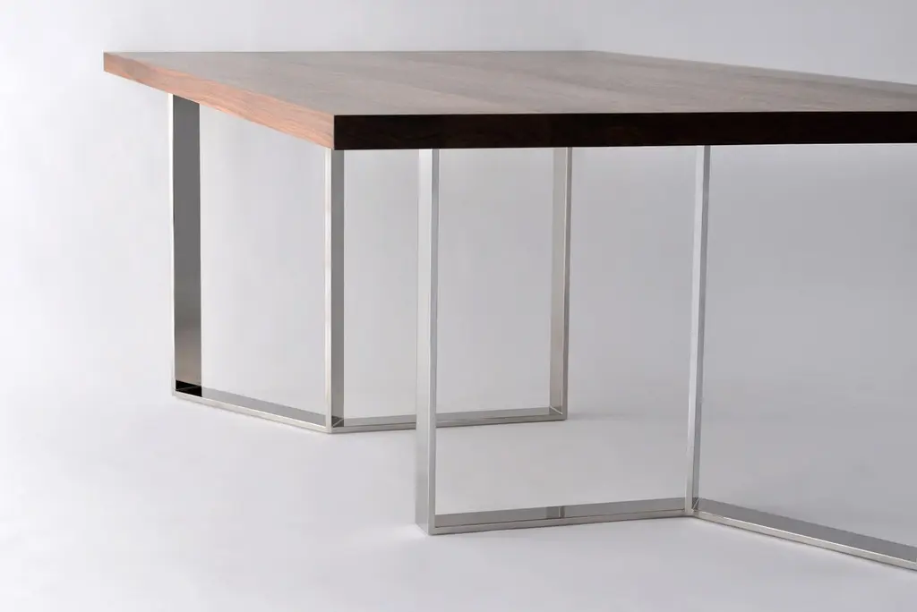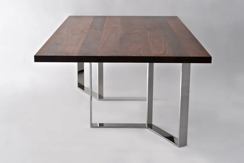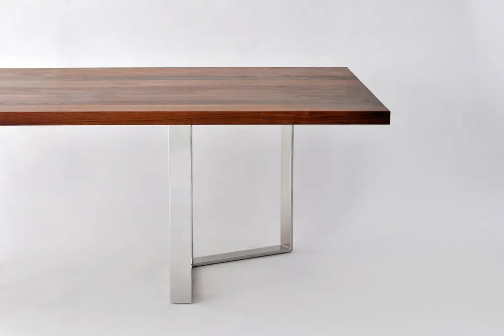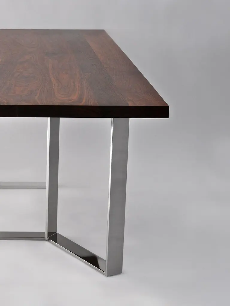 Roundhouse Table by Phase DesignDimensions: D 116.8 x W 243.8 x H 73.7 cm. Materials: Polished chrome and walnut. Solid steel bar with solid wooden top, available in walnut, white oak, ebonized oak. Steel bar available in polished chrome, smoked brass, burnt copper or powder coat finish. Prices may vary. Please contact us.A multipurpose table suitable for meeting, conference, dining, or personal use with solid lumber top and solid steel asymmetrical legs. The legs afford this table a very dynamic gesture and commanding presence.Autodidact award-winning designer Reza Feiz has always been drawn to the strength in simplicity. Lured to Southern California by its inventive, creative spirit, he quickly discovered his true calling among the vast community of creators and artisans whose skills and ingenuity expertly transform imagination into reality.Inspired by Los Angeles’ iconic landscape and the compelling beauty of the places and spaces he encountered, he envisioned furniture, lighting and tabletop accessories, fabricating them from contemporary materials with the help of a tightly knit coterie of craftspeople.The resulting restrained yet revolutionary pieces have garnered enthusiasm from an international audience.He’s been lauded as “An American designer who influences world design”, a “Style Pioneer” and “One of a group of select young designers who represent the leading edge of discovery in design.” Architectural Digest’s Mayer Rus noted that his “wide-ranging collections make a strong case for the enduring appeal of restrained modern design.” Surface Magazine raved that he “imbues his work with a 21st-century edge. His astute sense of restraint keeps the designs relevant in a constantly evolving industry, without needing to subscribe to trends.”“Reza Feiz imbues his work with a 21st-century edge. His astute sense of restraint keeps the designs relevant in a constantly evolving industry, without needing to subscribe to trends.”