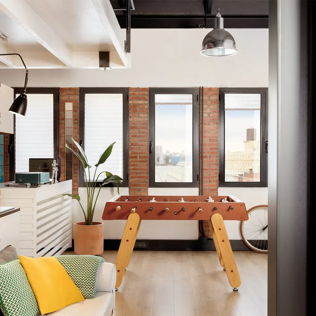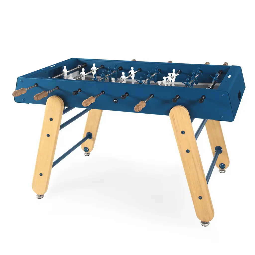 RS4 Home is the evolution of our foosball table to the demands of a market that is increasingly online. For that reason, we have modified some productions details to respond to those requirements without giving up design, high quality and our intense living concept. For all ages: the years don’t matter, as long as you have a playful attitude.For sharing with your loved ones: family, friends, neighbors … Anyone who dares to challenge you.For enjoying any time: a celebration, a party, a family reunion, on Saturday after lunch, on Wednesday when the homework is done … For all those moments that will not be forgotten.For indoors and outdoors: enjoy a good game both in the dining room as well as in the garden or in the patio. Wherever the shouts and laughter resonate best.For quick ship: finished, packed and ready to ship.For eco-friendly and easy delivery: improved packaging for easy delivery, and a better handling and thus to reduce the environmental impact.For doing it yourself: easy assembling. Putting it together makes it yours, and then, when the game starts, you love it even more.New colors: yellow, terracotta, navy blue and cream. Warm, cosy and subtle, inspired by the colour scheme of the autumn landscapes. And the wooden legs make it warm and harmonize with the space. Customization Note: The table can be further customized to order with additional colors. Please contact us for a quote: 800-762-5374 or customercare@frontera.com.