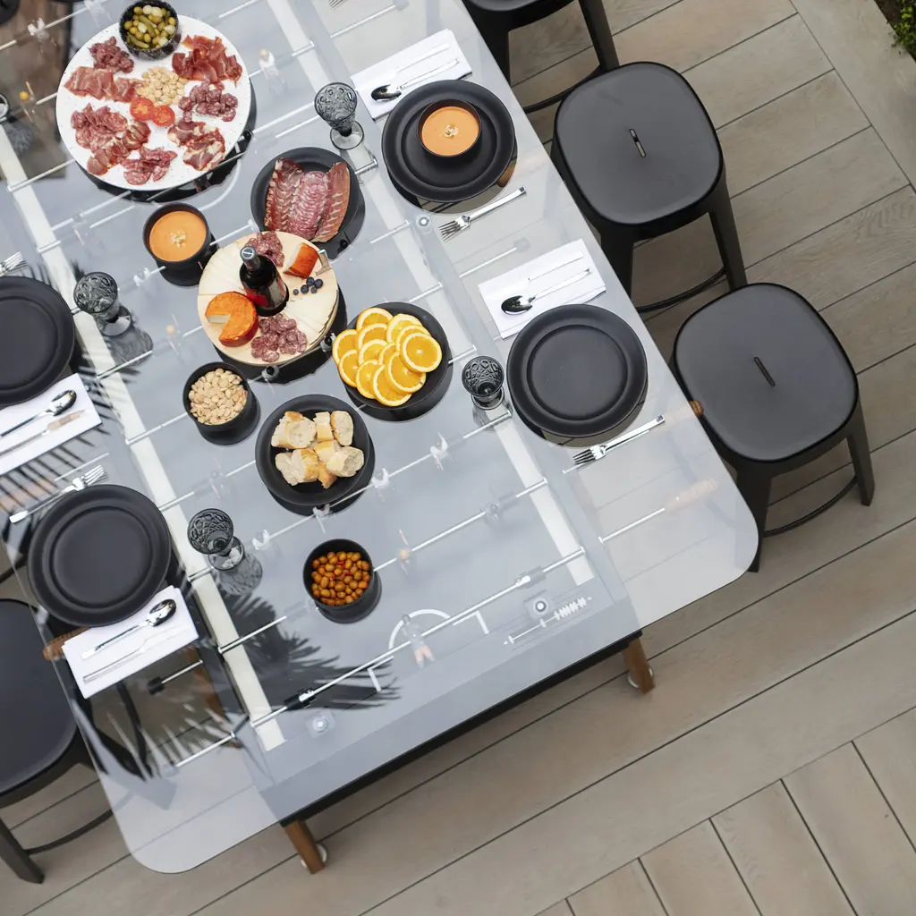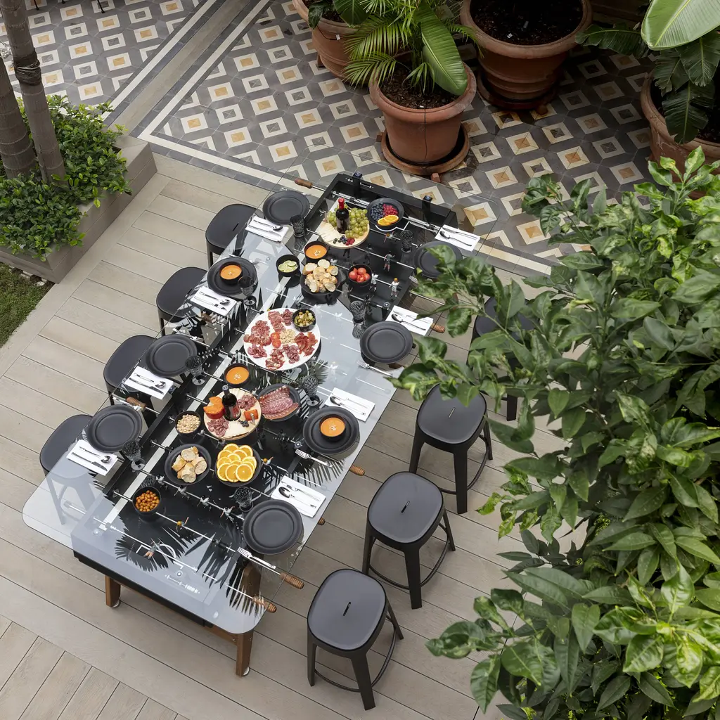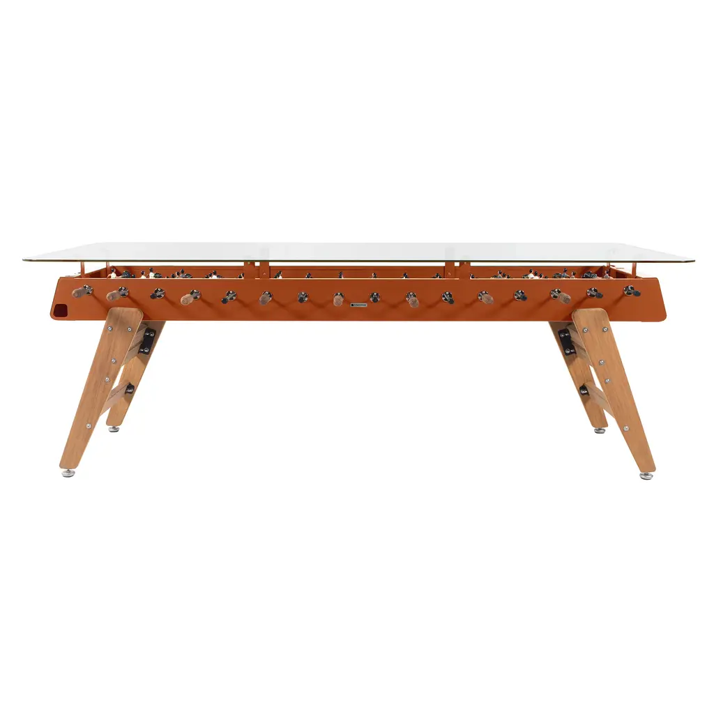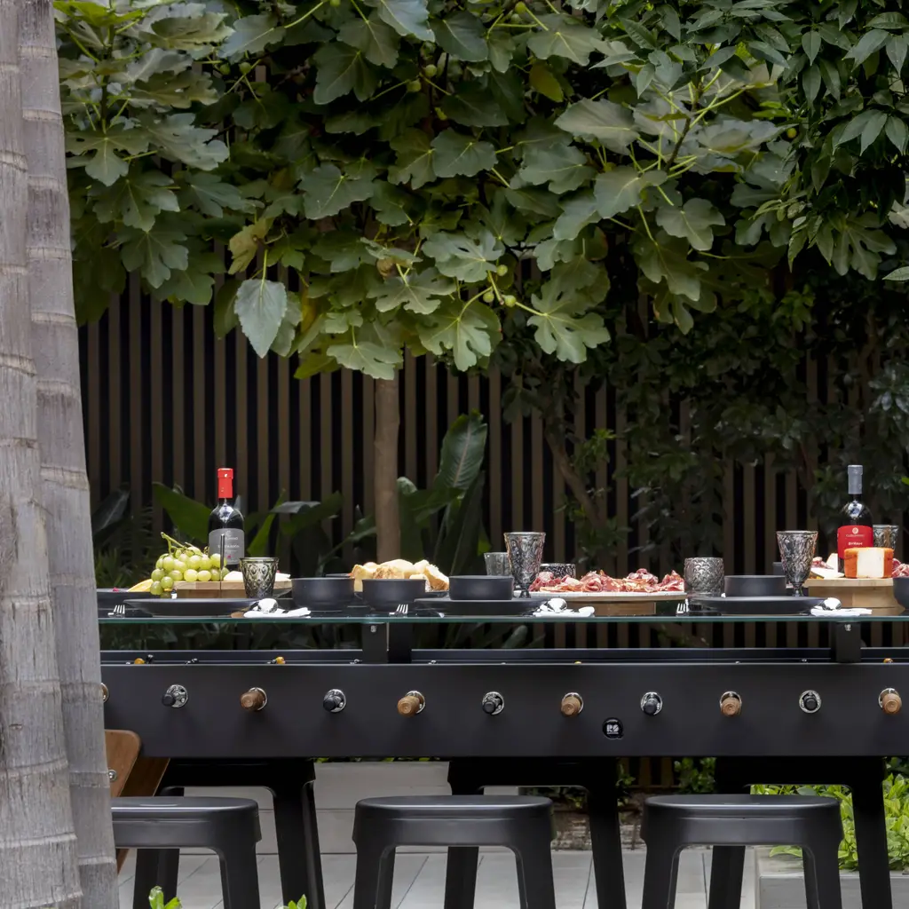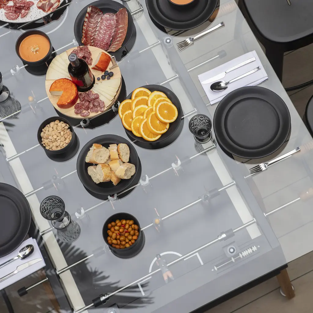Call it the new training table. Max Dining supersizes simultaneous gameplay and mealtime for a crowd with RS Barcelona’s longest dual-purpose table. Equally suited to hospitality, office or at-home environs, designer Rafael Rodriguez adds a tempered-glass tabletop to his extended version of brother RS#3 Wood. Stretched out and resized, it doubles the fun, for 8 players instead of 4. Rated for use inside or outdoors, Max comes in white, black or green—and stands up to intense play with its steel structure and cataphoretic coating process with a polyester paint finish. Iroko wood legs and handle. Players are rendered in cast aluminum (the set includes 5 standard and 2 silent balls and 4 extra players, 2 per team; customized players available).