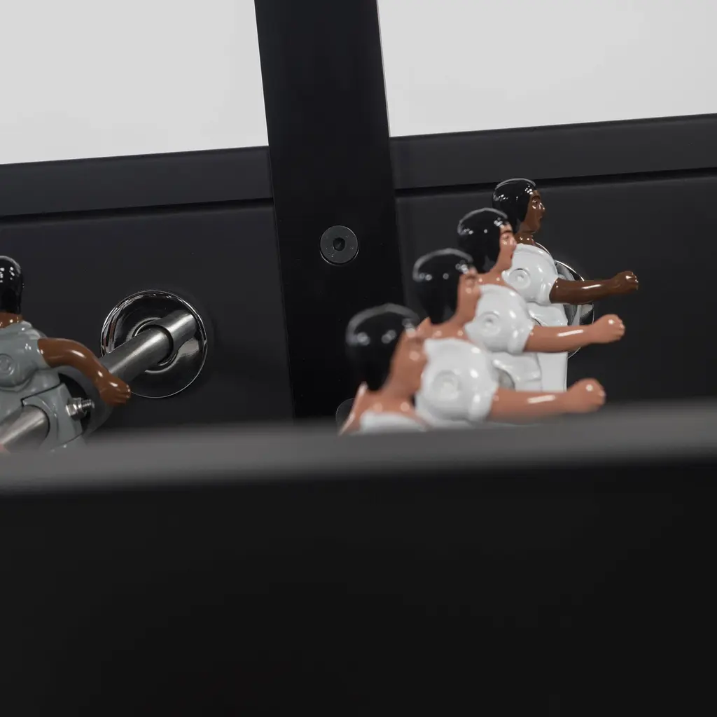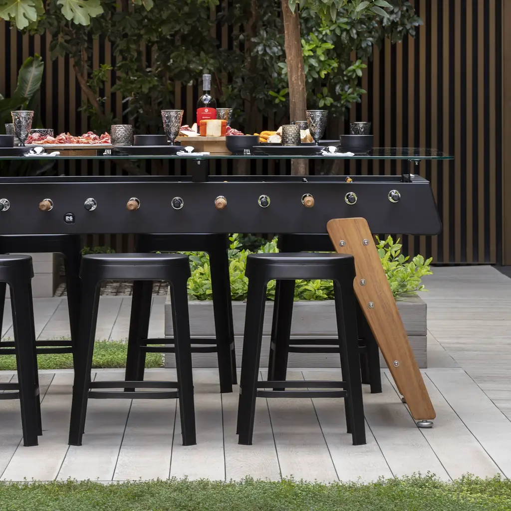 Call it the new training table. Max Dining supersizes simultaneous gameplay and mealtime for a crowd with RS Barcelona’s longest dual-purpose table. Equally suited to hospitality, office or at-home environs, designer Rafael Rodriguez adds a tempered-glass tabletop to his extended version of brother RS#3 Wood. Stretched out and resized, it doubles the fun, for 8 players instead of 4. Rated for use inside or outdoors, Max comes in white, black or green—and stands up to intense play with its steel structure and cataphoretic coating process with a polyester paint finish. Iroko wood legs and handle. Players are rendered in cast aluminum (the set includes 5 standard and 2 silent balls and 4 extra players,2 per team; customized players available).