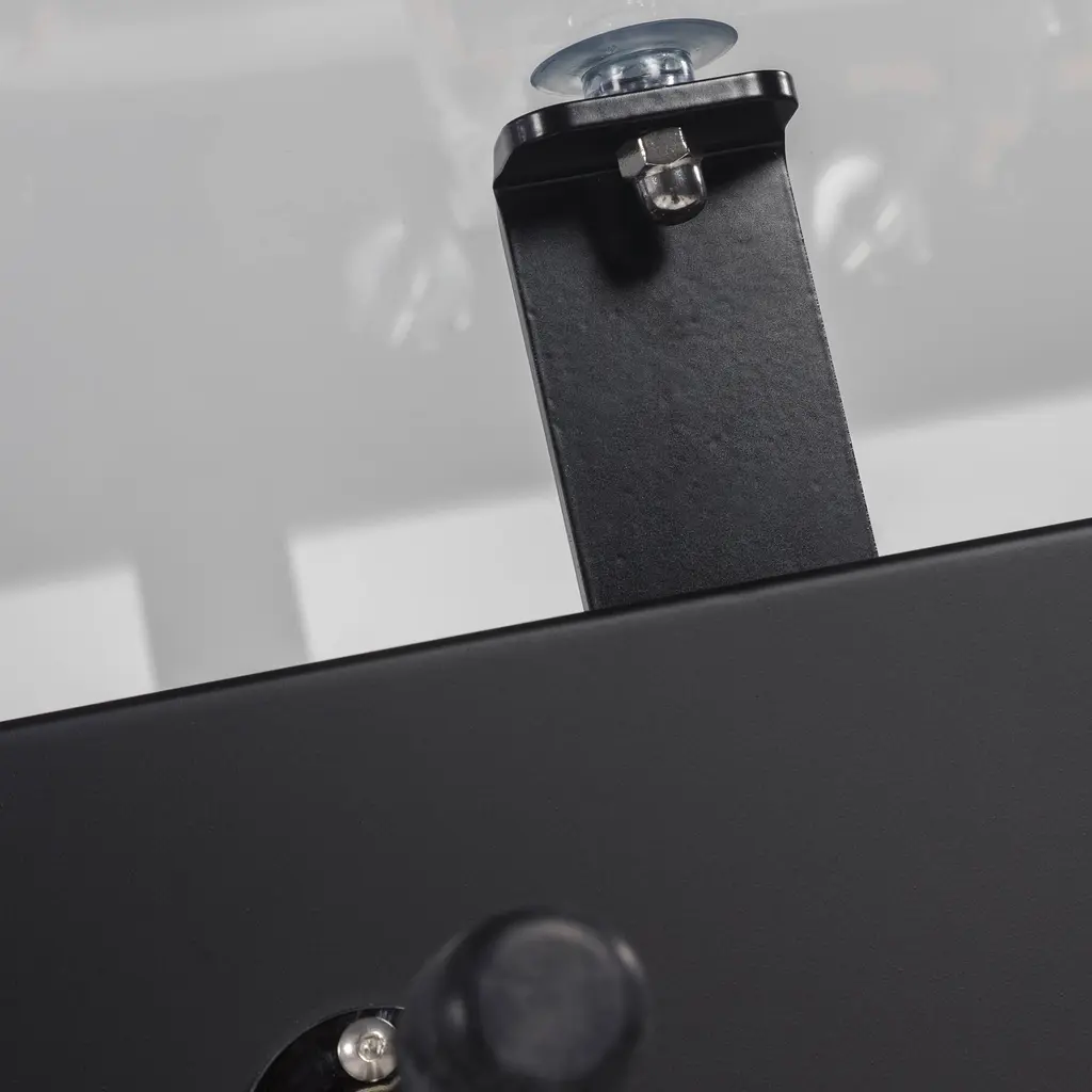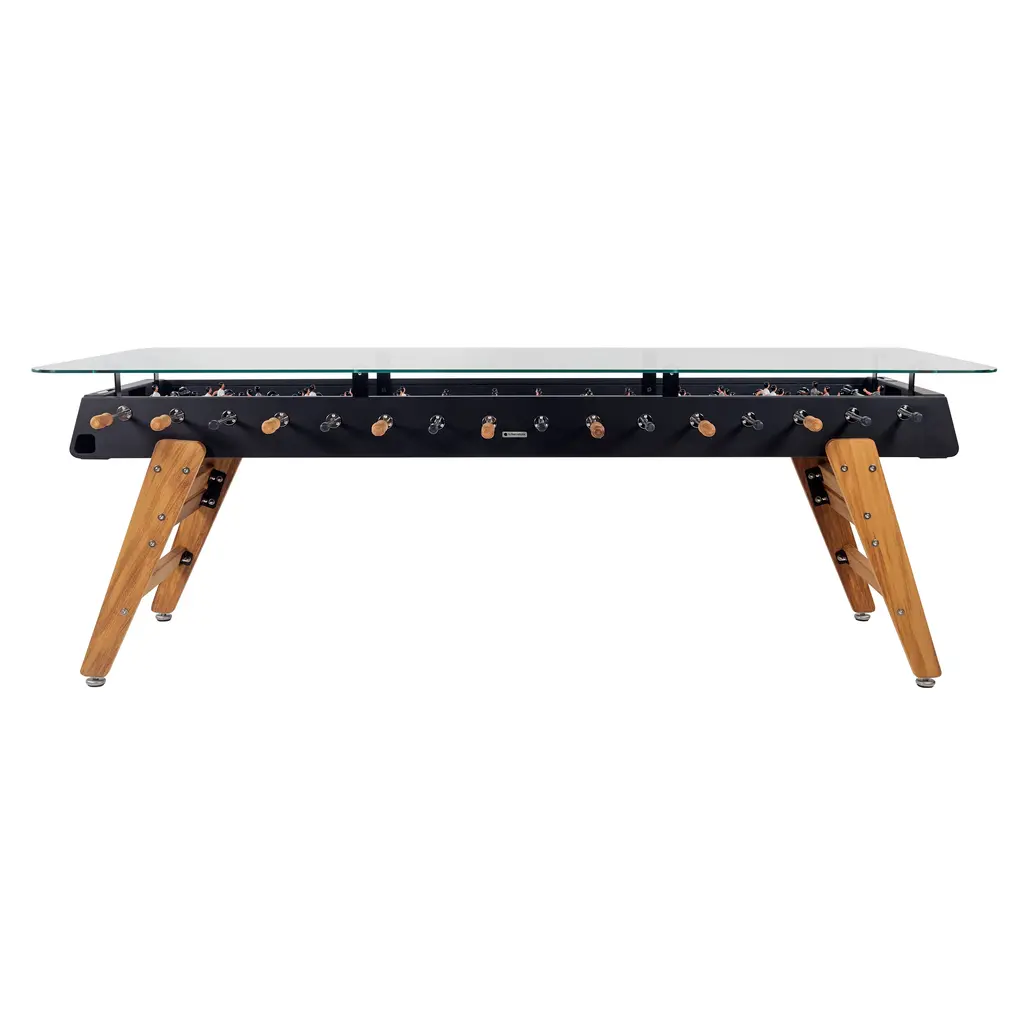 Call it the new training table. Max Dining supersizes simultaneous gameplay and mealtime for a crowd with RS Barcelona’s longest dual-purpose table. Equally suited to hospitality, office or at-home environs, designer Rafael Rodriguez adds a tempered-glass tabletop to his extended version of brother RS#3 Wood. Stretched out and resized, it doubles the fun, for 8 players instead of 4. Rated for use inside or outdoors, Max comes in white, black or green—and stands up to intense play with its steel structure and cataphoretic coating process with a polyester paint finish. Iroko wood legs and handle. Players are rendered in cast aluminum (the set includes 5 standard and 2 silent balls and 4 extra players,2 per team; customized players available).