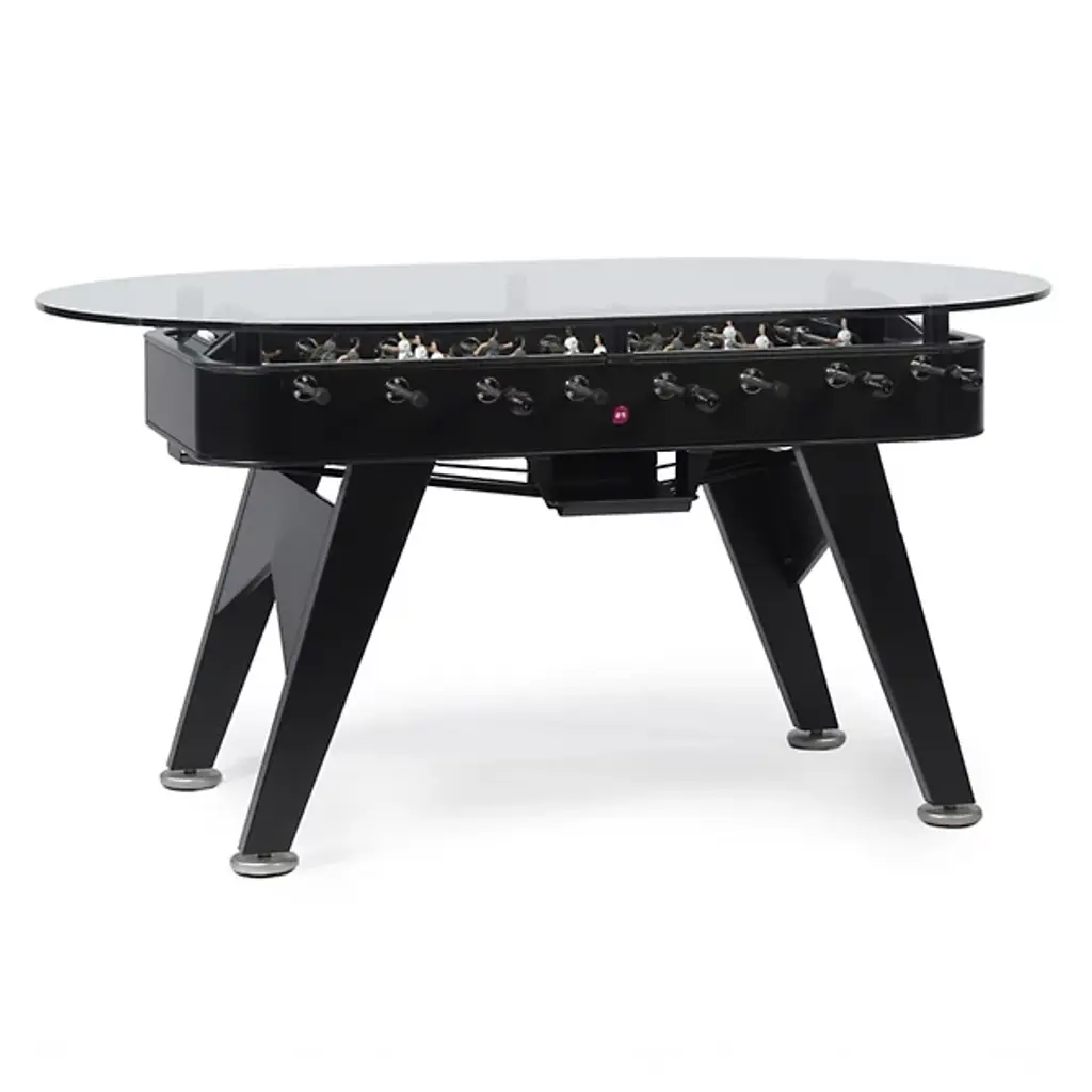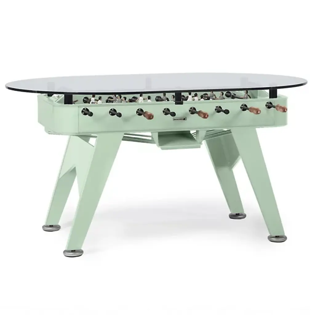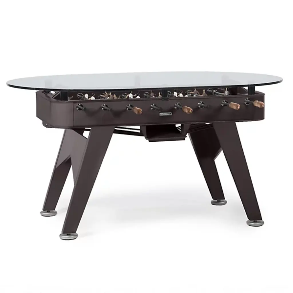 Settle it over a ball game. The RS2 Indoor Oval Dining Foosball Table from RS Barcelona is an ingenious piece, bringing a sophisticated yet lighthearted character to your room. The table reimagines the familiar football table with elegant modern lines. Made from iron, the table's structure looks and feels enduring. Natural beech handles lining the table spin your charming characters inside with precision and elegance. The painted field accentuates the vibrant colors and details of the characters. Once the score has been settled or a time out is called, share some refreshments over the table's glass tabletop. The durable tempered glass surface visually adds an elegant reflective touch.