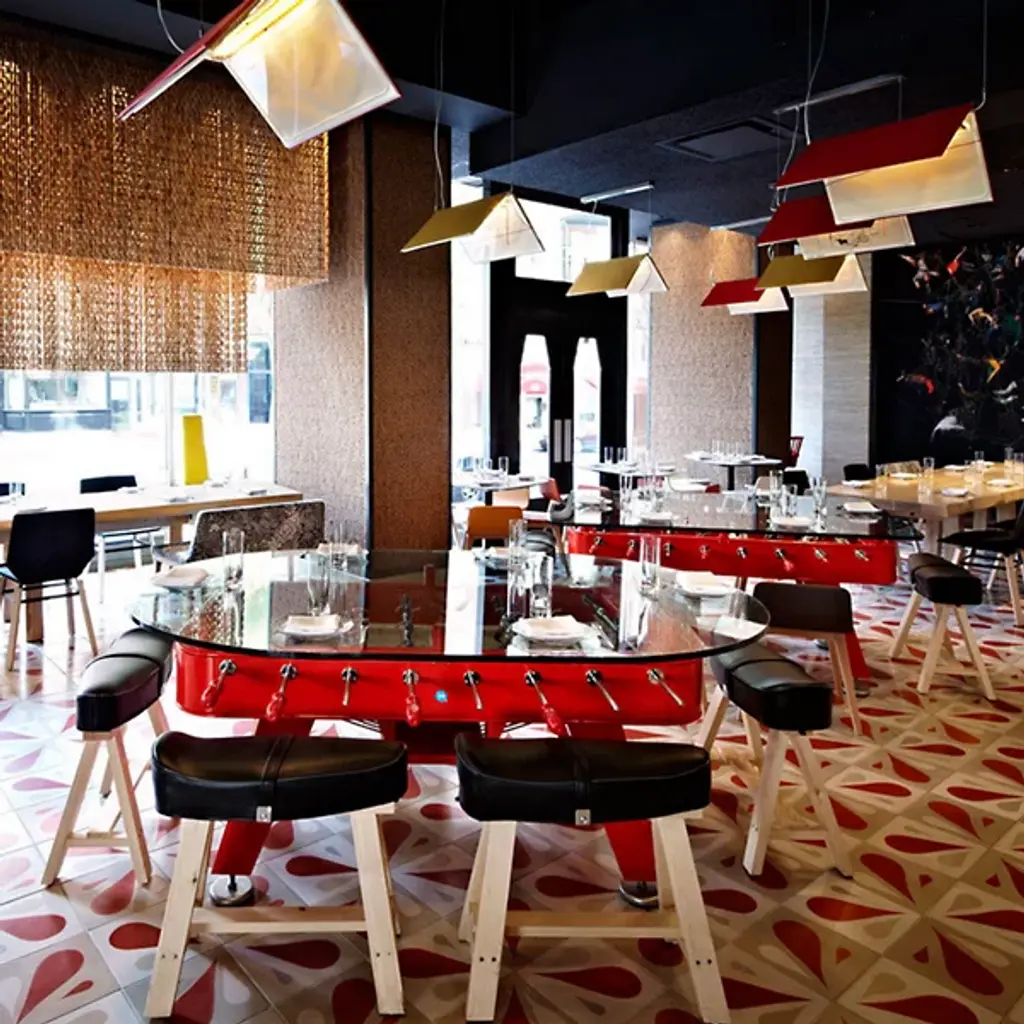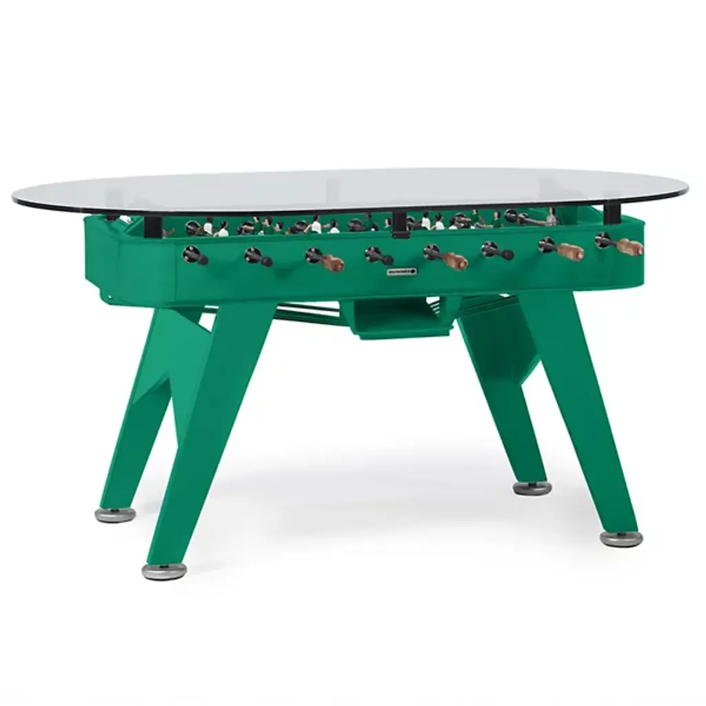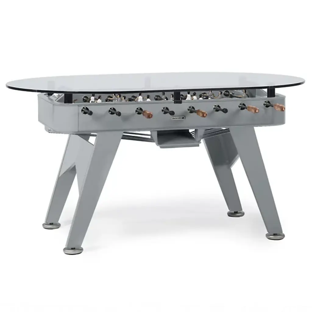 Settle it over a ball game. The RS2 Indoor Oval Dining Foosball Table from RS Barcelona is an ingenious piece, bringing a sophisticated yet lighthearted character to your room. The table reimagines the familiar football table with elegant modern lines. Made from iron, the table's structure looks and feels enduring. Natural beech handles lining the table spin your charming characters inside with precision and elegance. The painted field accentuates the vibrant colors and details of the characters. Once the score has been settled or a time out is called, share some refreshments over the table's glass tabletop. The durable tempered glass surface visually adds an elegant reflective touch.