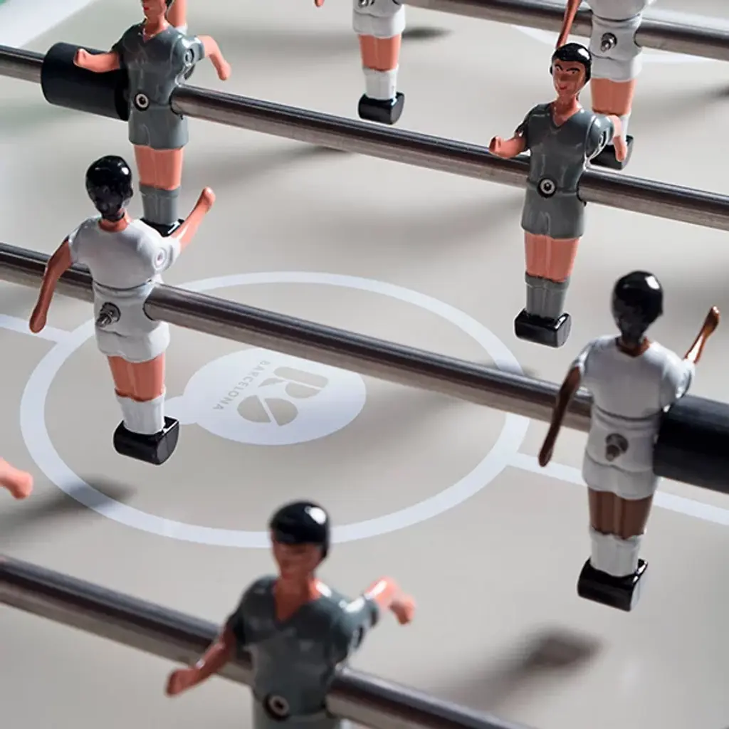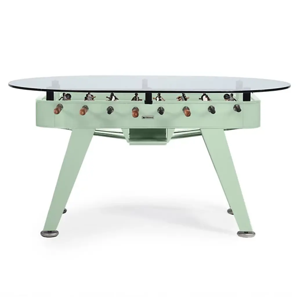 Settle it over a ball game. The RS2 Indoor Oval Dining Foosball Table from RS Barcelona is an ingenious piece, bringing a sophisticated yet lighthearted character to your room. The table reimagines the familiar football table with elegant modern lines. Made from iron, the table's structure looks and feels enduring. Natural beech handles lining the table spin your charming characters inside with precision and elegance. The painted field accentuates the vibrant colors and details of the characters. Once the score has been settled or a time out is called, share some refreshments over the table's glass tabletop. The durable tempered glass surface visually adds an elegant reflective touch.