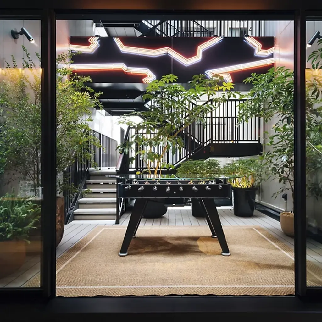 Settle it over a ball game. The RS2 Indoor Oval Dining Foosball Table from RS Barcelona is an ingenious piece, bringing a sophisticated yet lighthearted character to your room. The table reimagines the familiar football table with elegant modern lines. Made from iron, the table's structure looks and feels enduring. Natural beech handles lining the table spin your charming characters inside with precision and elegance. The painted field accentuates the vibrant colors and details of the characters. Once the score has been settled or a time out is called, share some refreshments over the table's glass tabletop. The durable tempered glass surface visually adds an elegant reflective touch.