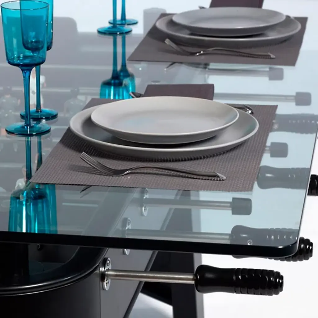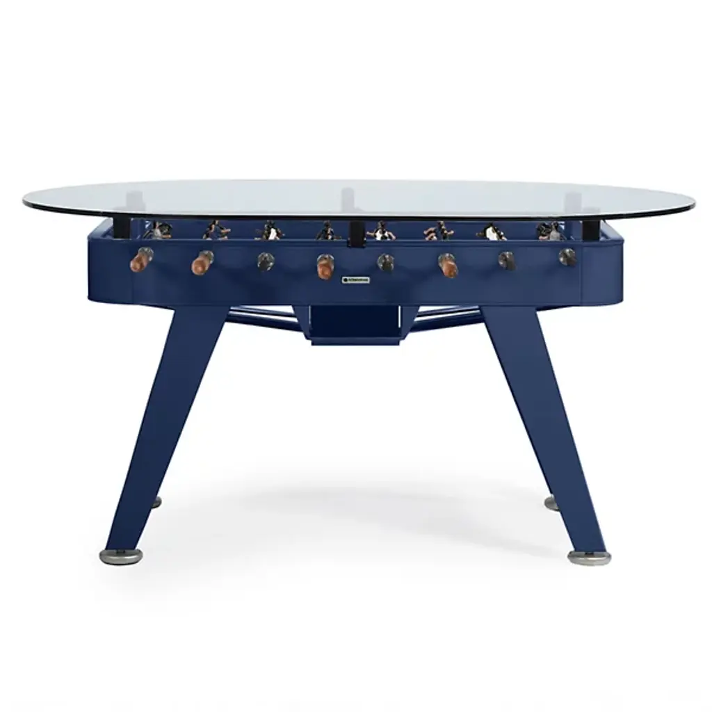 Settle it over a ball game. The RS2 Indoor Oval Dining Foosball Table from RS Barcelona is an ingenious piece, bringing a sophisticated yet lighthearted character to your room. The table reimagines the familiar football table with elegant modern lines. Made from iron, the table's structure looks and feels enduring. Natural beech handles lining the table spin your charming characters inside with precision and elegance. The painted field accentuates the vibrant colors and details of the characters. Once the score has been settled or a time out is called, share some refreshments over the table's glass tabletop. The durable tempered glass surface visually adds an elegant reflective touch.