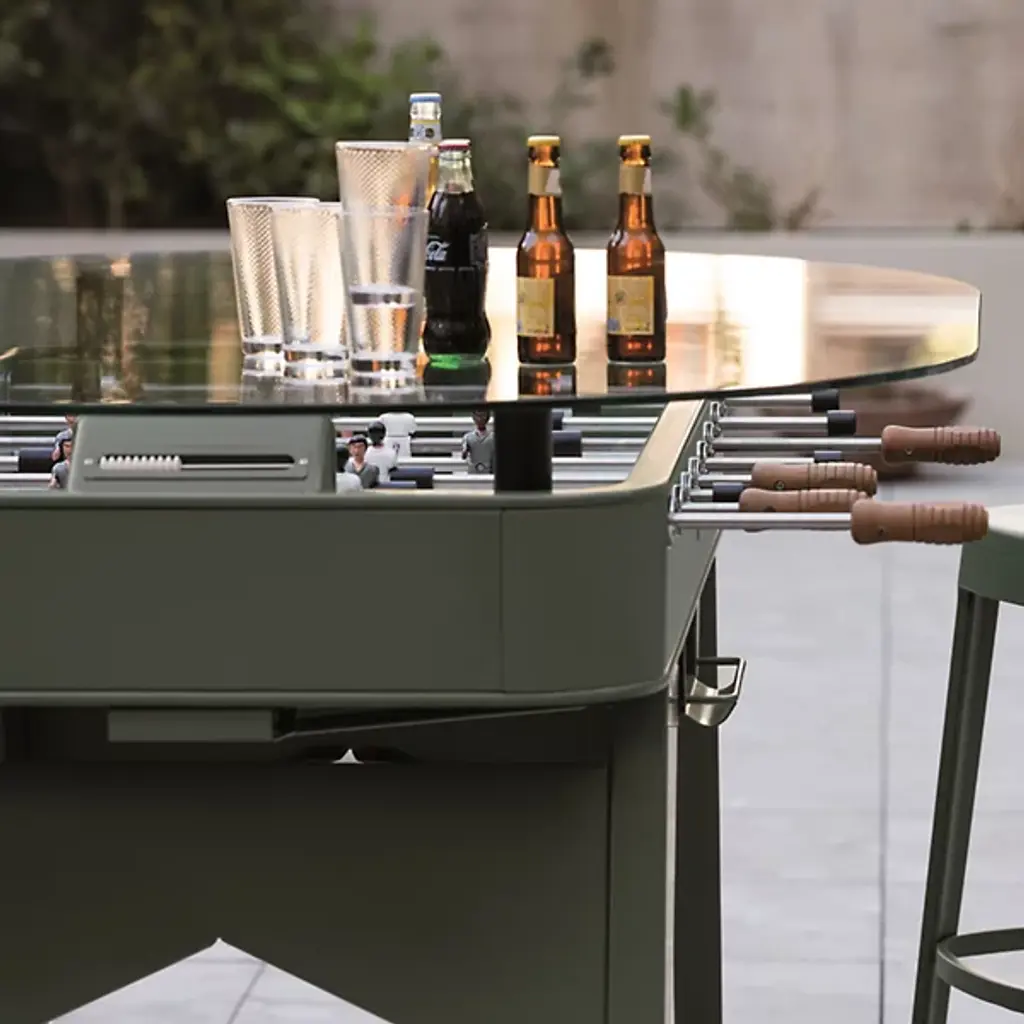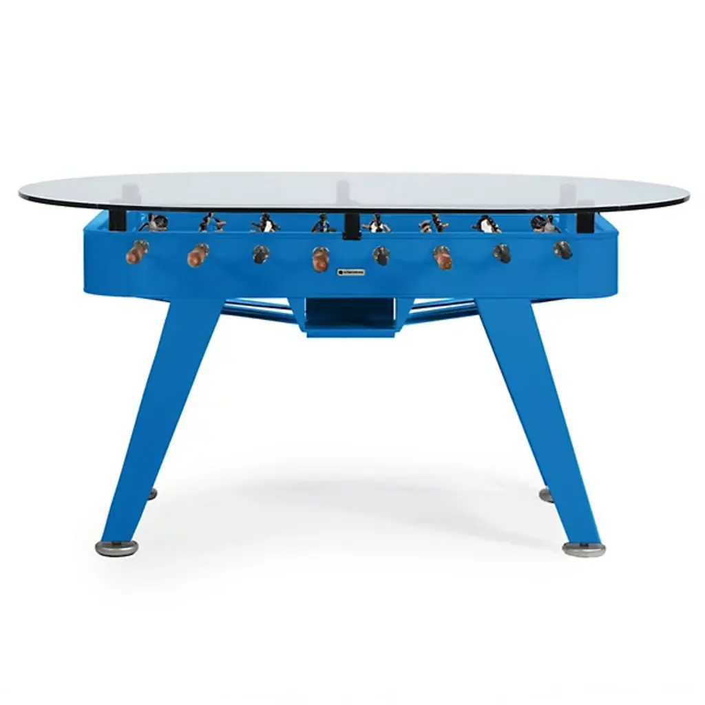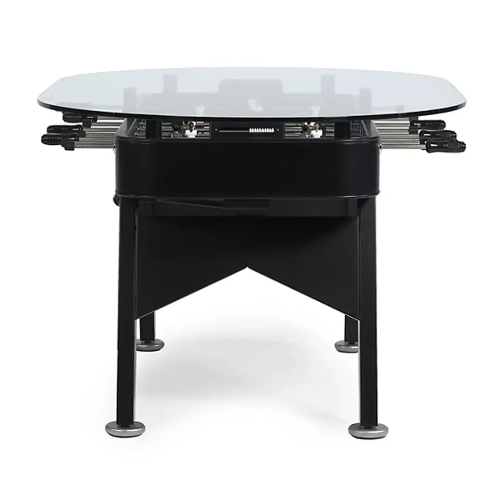 Settle it over a ball game. The RS2 Indoor Oval Dining Foosball Table from RS Barcelona is an ingenious piece, bringing a sophisticated yet lighthearted character to your room. The table reimagines the familiar football table with elegant modern lines. Made from iron, the table's structure looks and feels enduring. Natural beech handles lining the table spin your charming characters inside with precision and elegance. The painted field accentuates the vibrant colors and details of the characters. Once the score has been settled or a time out is called, share some refreshments over the table's glass tabletop. The durable tempered glass surface visually adds an elegant reflective touch.