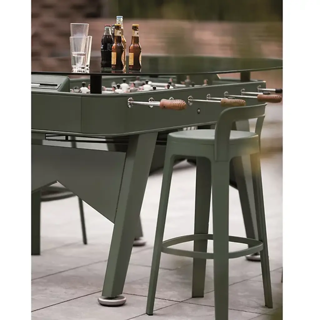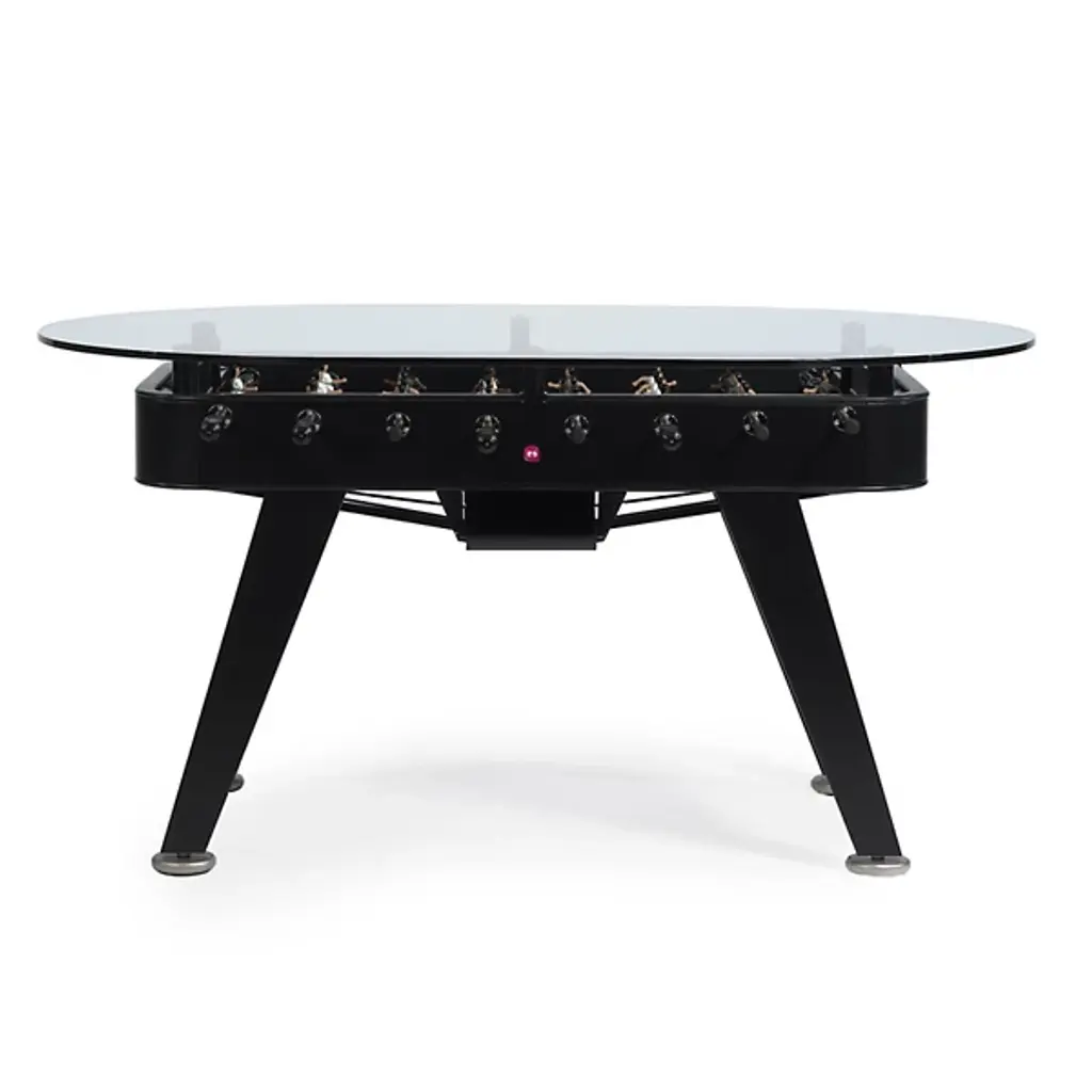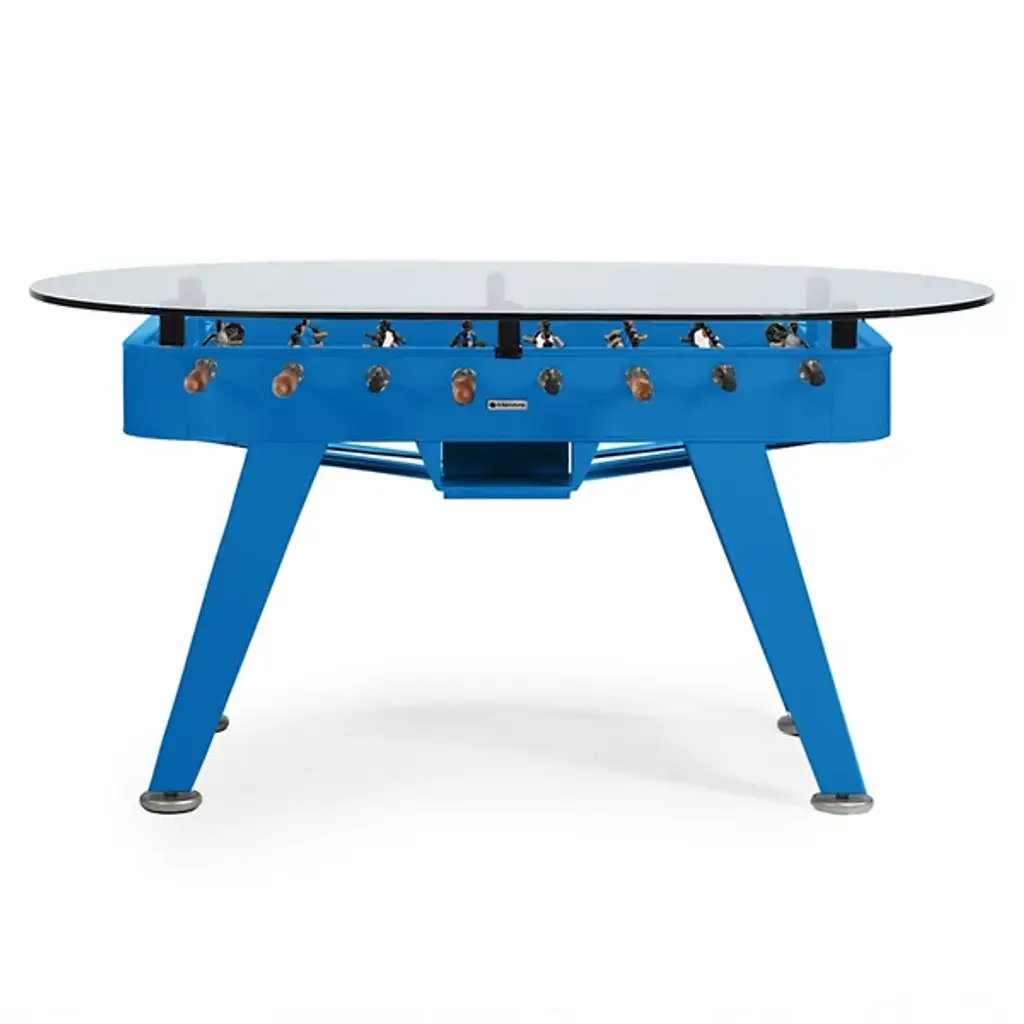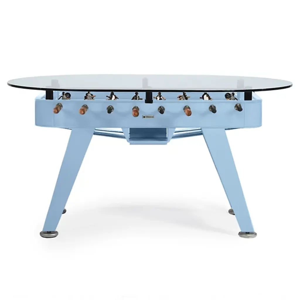 Add a stylish sense of fun to your gathering spaces with the smooth lines and elegant design of the RS2 Outdoor Oval Dining Foosball Table from RS Barcelona. A Rafael Rodriguez design implemented in collaboration with famous Spanish chef José Andrés, this delightful table blends gastronomy with game time, using angular leg on disc-shaped feet to place a round-cornered, fully functional, customizable football table beneath a transparent tabletop. The top is secured by a series of strong pillars so you can get some goals in between courses; just be careful when someone asks you to pass the salt.
