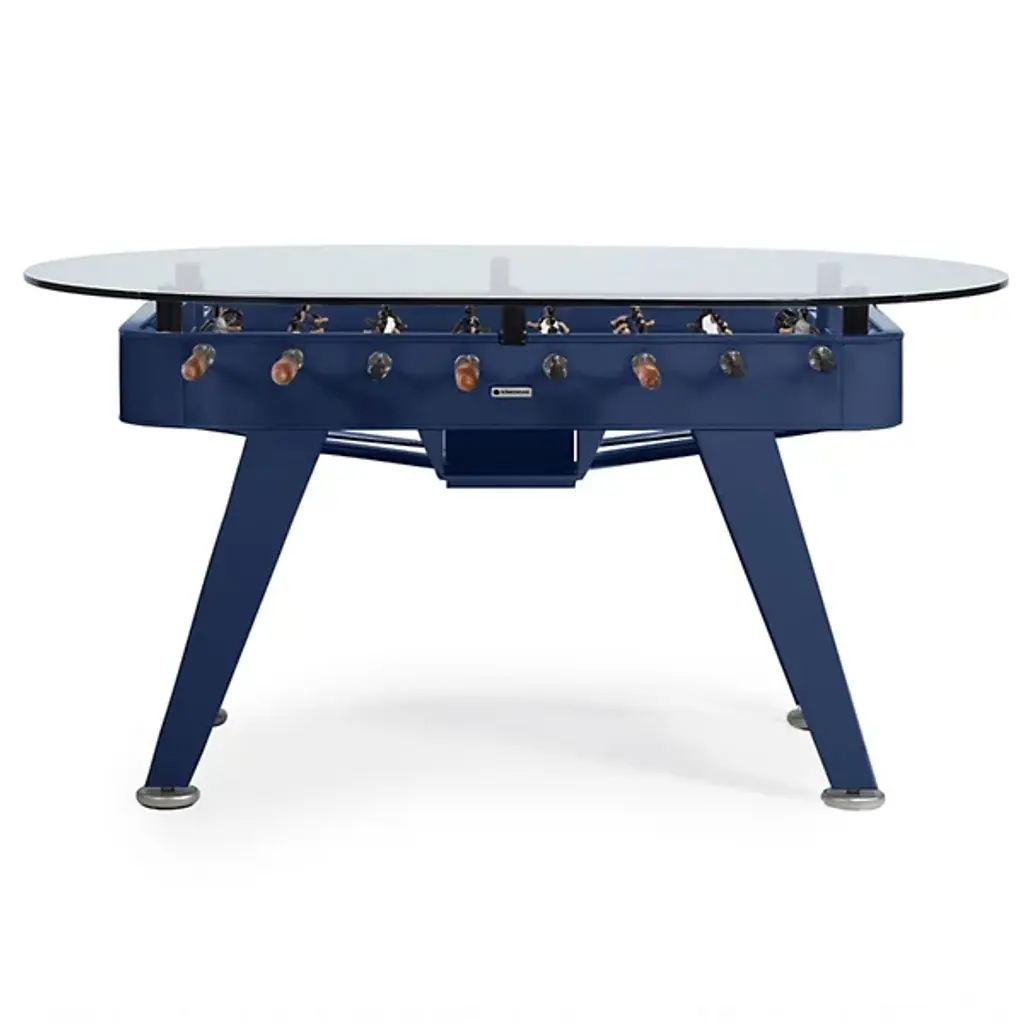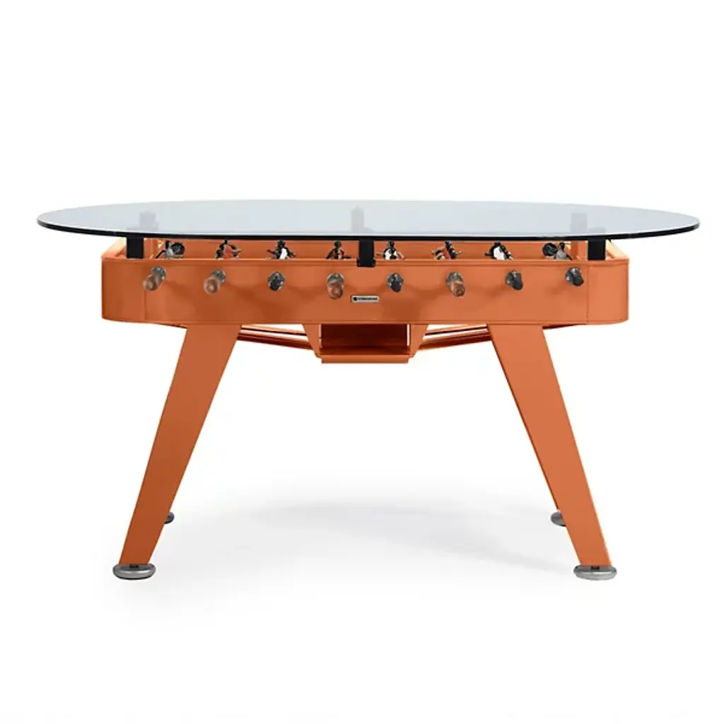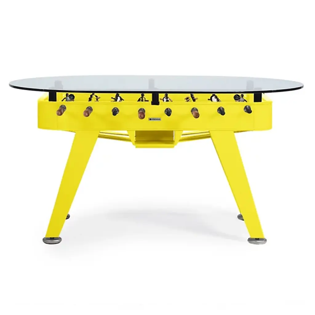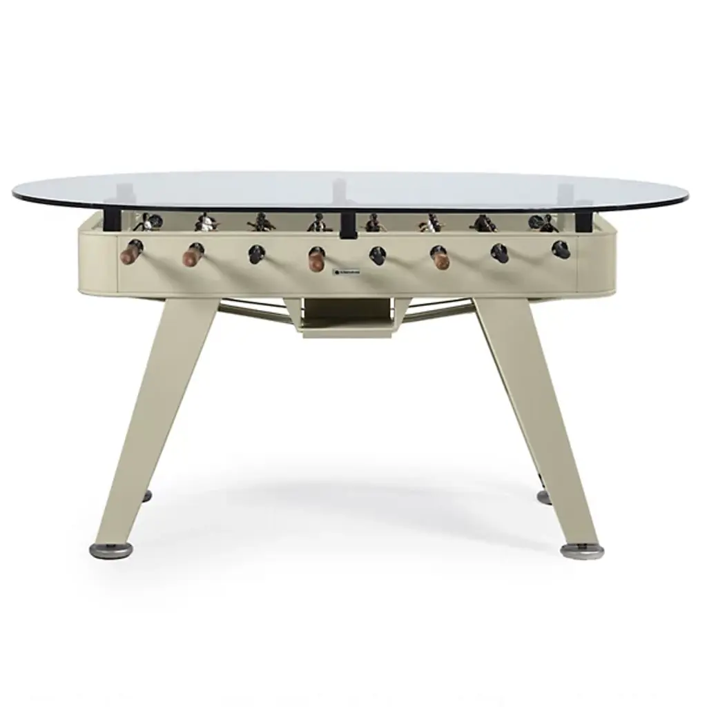 Add a stylish sense of fun to your gathering spaces with the smooth lines and elegant design of the RS2 Outdoor Oval Dining Foosball Table from RS Barcelona. A Rafael Rodriguez design implemented in collaboration with famous Spanish chef José Andrés, this delightful table blends gastronomy with game time, using angular leg on disc-shaped feet to place a round-cornered, fully functional, customizable football table beneath a transparent tabletop. The top is secured by a series of strong pillars so you can get some goals in between courses; just be careful when someone asks you to pass the salt.