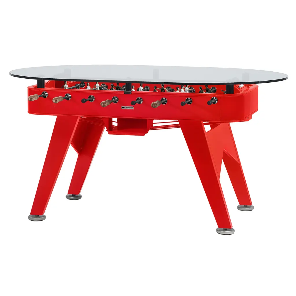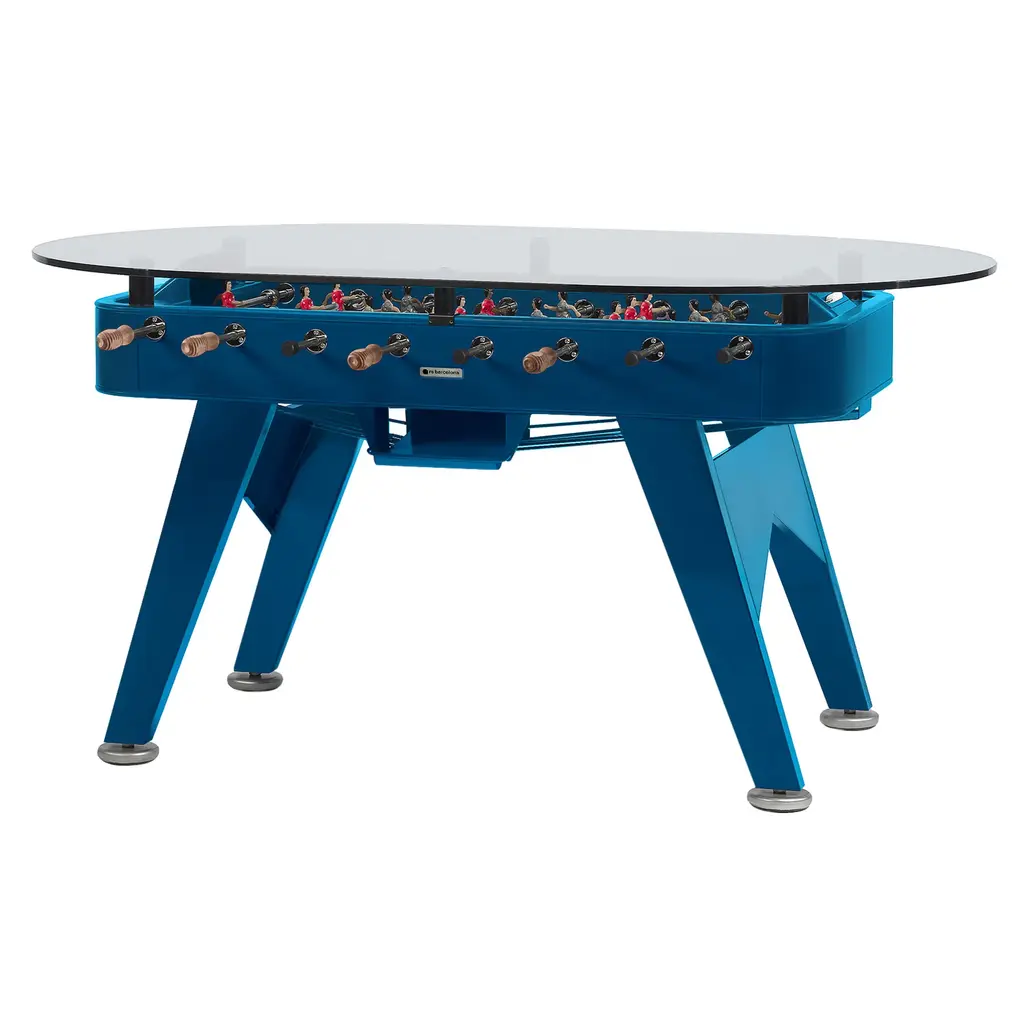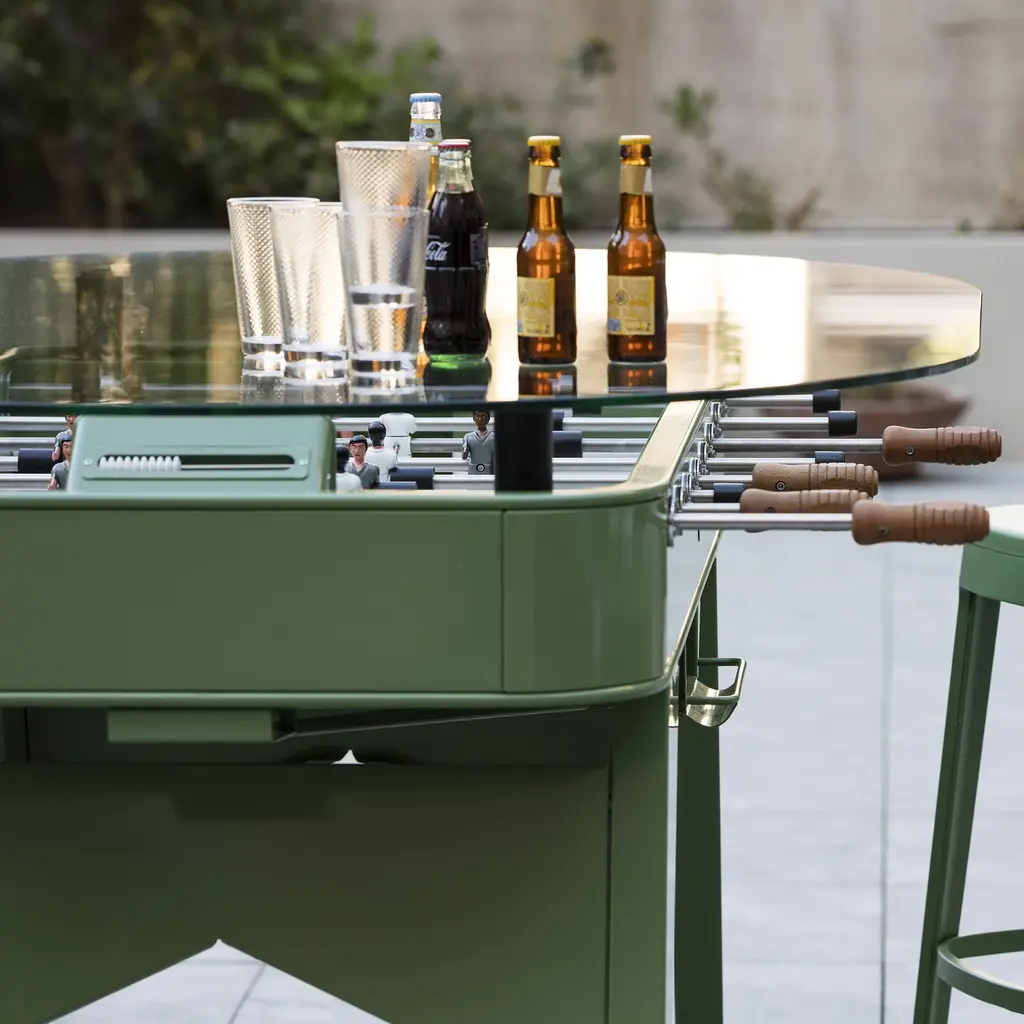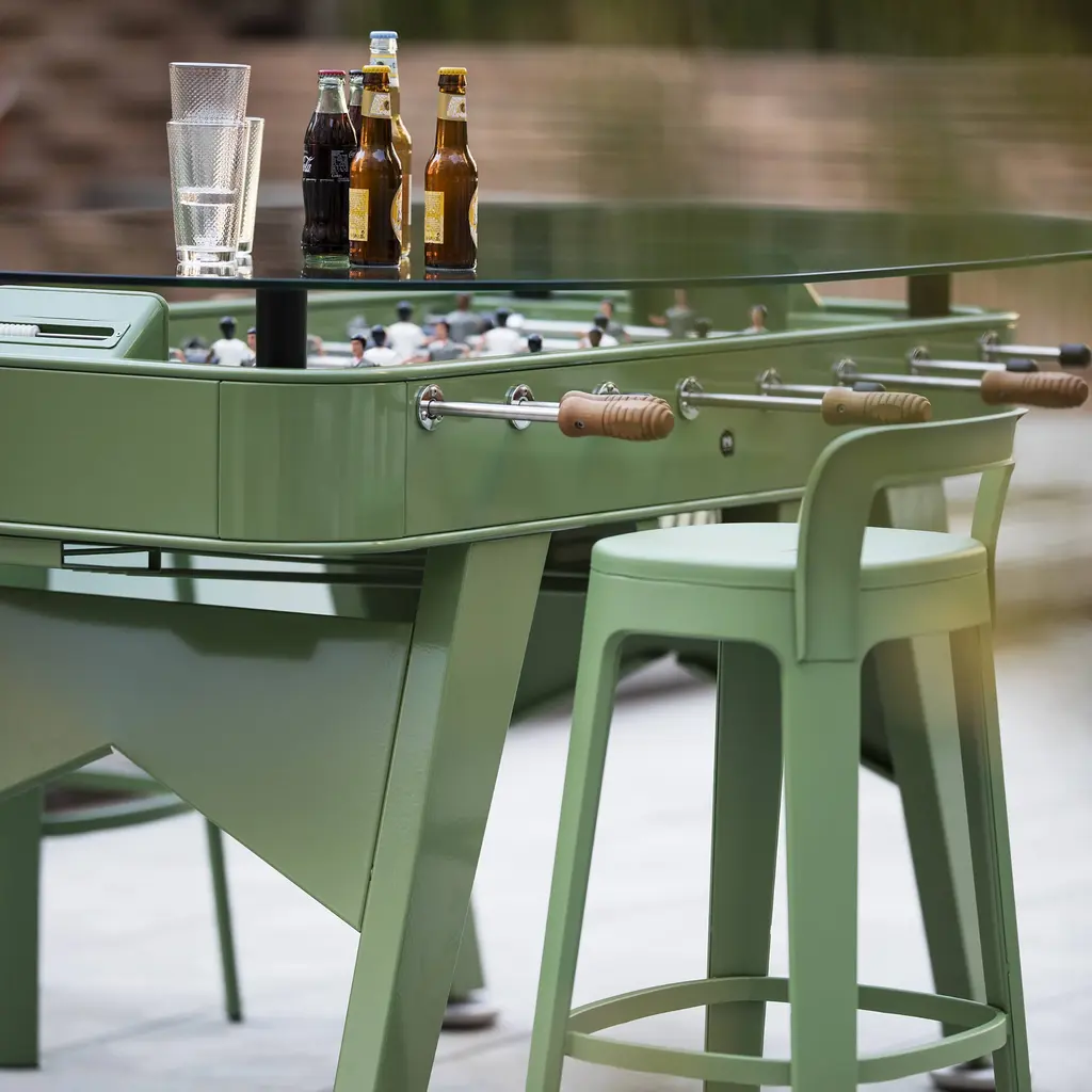 When Spanish superstar chef José Andrés wanted to add RS Barcelona’s football table to further spice up his restaurant interiors, the custom project inspired a sleek hybrid for lovers of the game and gastronomy. With its sturdy oval tempered-glass tabletop, RS2 Dining accommodates up to 6 guests for mealtime without having to interrupt the matchplay. Available in both seated standard and taller bar heights, the sleek metal table comes in a steel indoor version in a range of colors, an Indoor model in non-corrosive Inox stainless steel and an indoor stainless selection in protective polyester-paint hues. Custom players are also available.