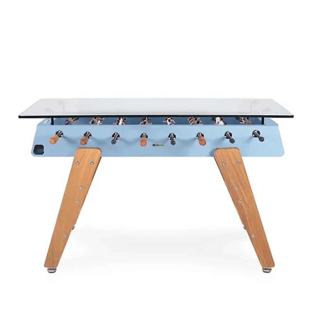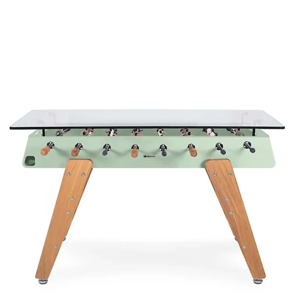 The RS3 Foosball Table/Rectangular Wood Dining Table by RS Barcelona is the perfect piece to stand around or pull up a set of your favorite stools to. Fun and functional, this foosball table was designed by José Andrés and Rafael Rodríguez and features a glass top that allows it to also act as a dining table. Between games, this piece is perfect to gather around for a meal or offers a space for snacks and drinks during gameplay. Suitable for both indoors and out, this table is fitted with beautiful wooden legs, and the neatly arranged players within are always ready for a match.