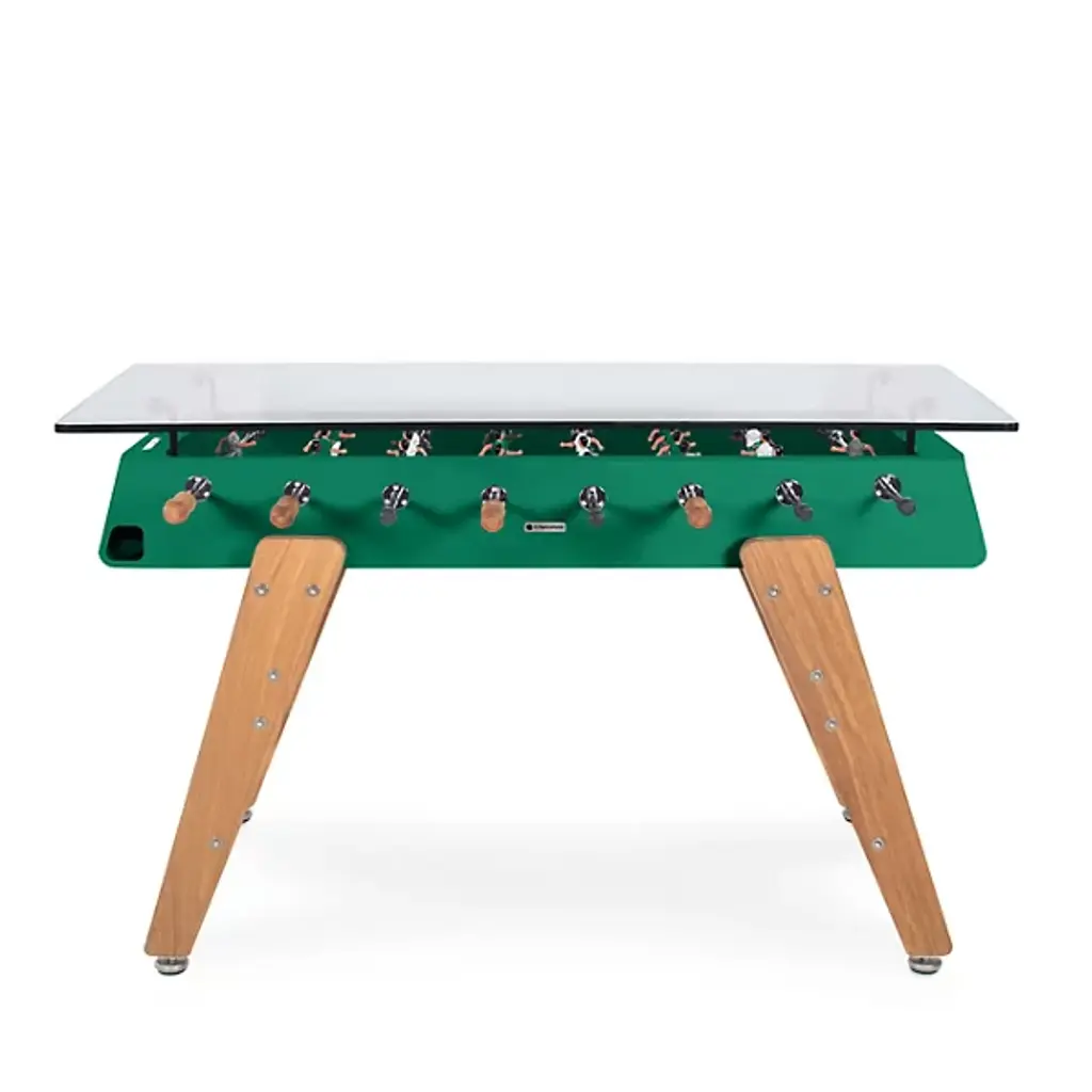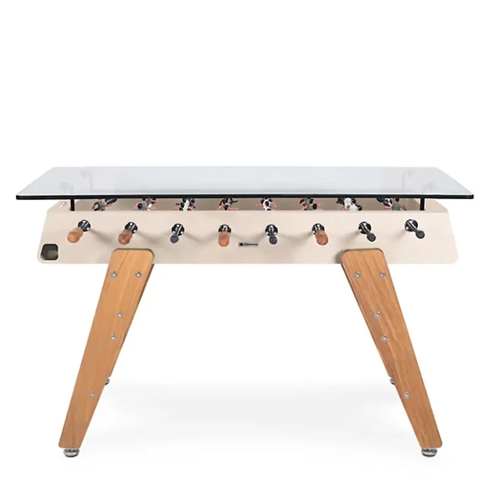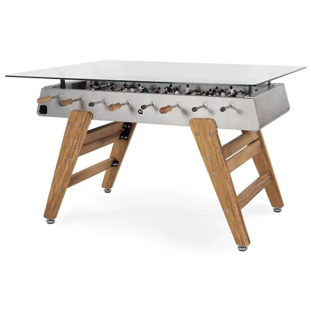 The RS3 Foosball Table/Rectangular Wood Dining Table by RS Barcelona is the perfect piece to stand around or pull up a set of your favorite stools to. Fun and functional, this foosball table was designed by José Andrés and Rafael Rodríguez and features a glass top that allows it to also act as a dining table. Between games, this piece is perfect to gather around for a meal or offers a space for snacks and drinks during gameplay. Suitable for both indoors and out, this table is fitted with beautiful wooden legs, and the neatly arranged players within are always ready for a match.