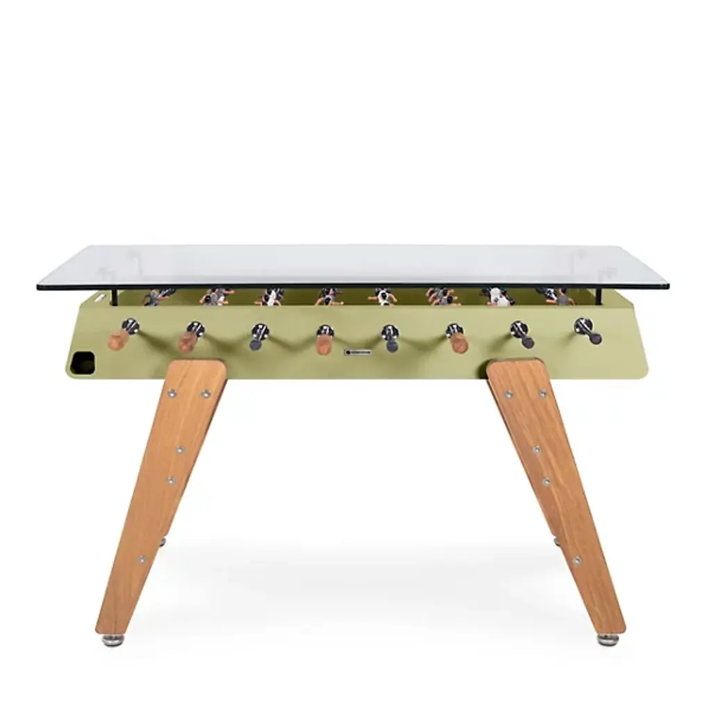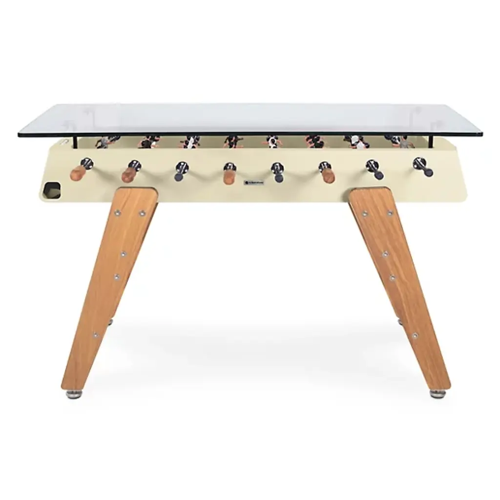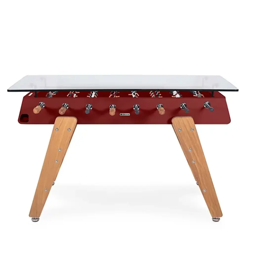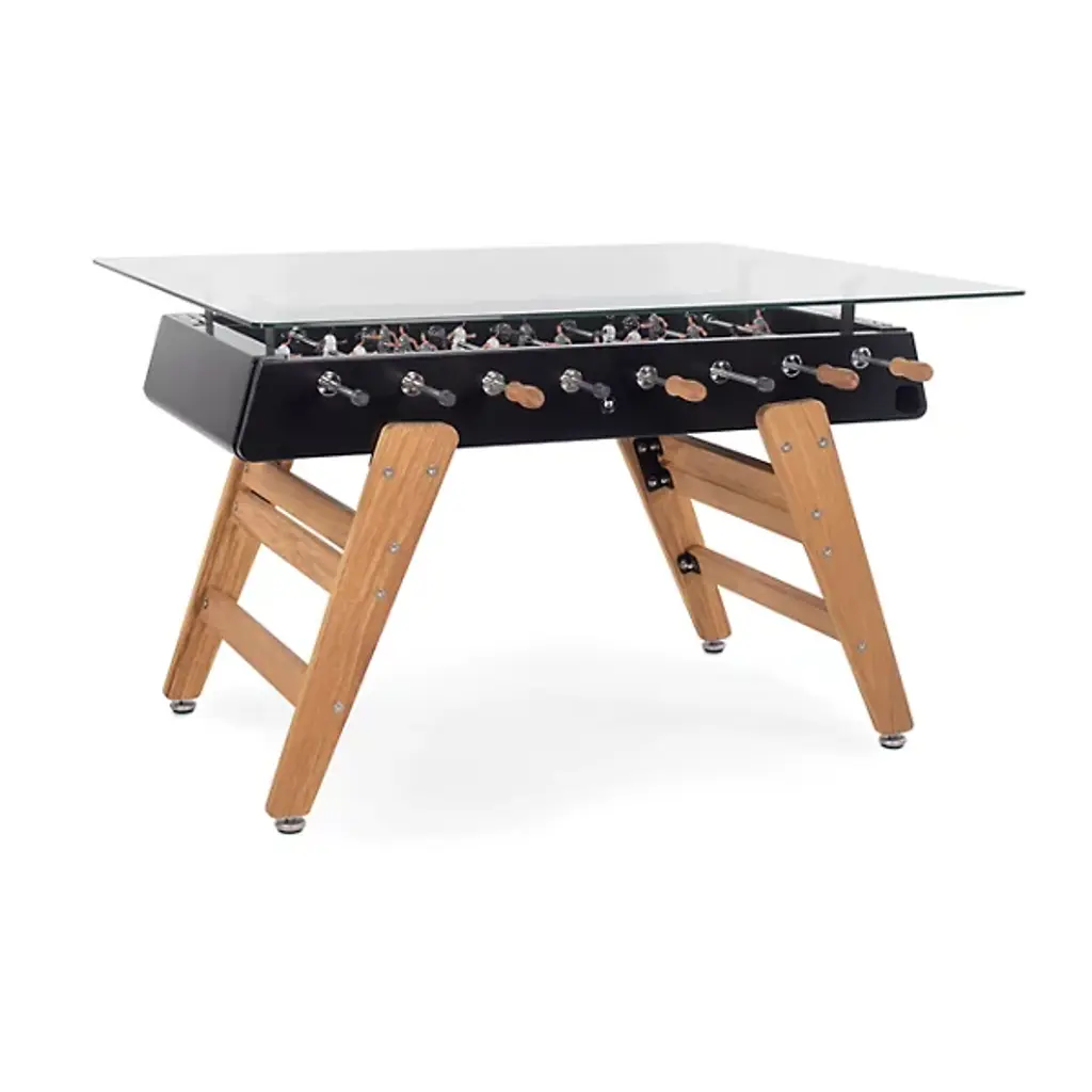 The RS3 Foosball Table/Rectangular Wood Dining Table by RS Barcelona is the perfect piece to stand around or pull up a set of your favorite stools to. Fun and functional, this foosball table was designed by José Andrés and Rafael Rodríguez and features a glass top that allows it to also act as a dining table. Between games, this piece is perfect to gather around for a meal or offers a space for snacks and drinks during gameplay. Suitable for both indoors and out, this table is fitted with beautiful wooden legs, and the neatly arranged players within are always ready for a match.