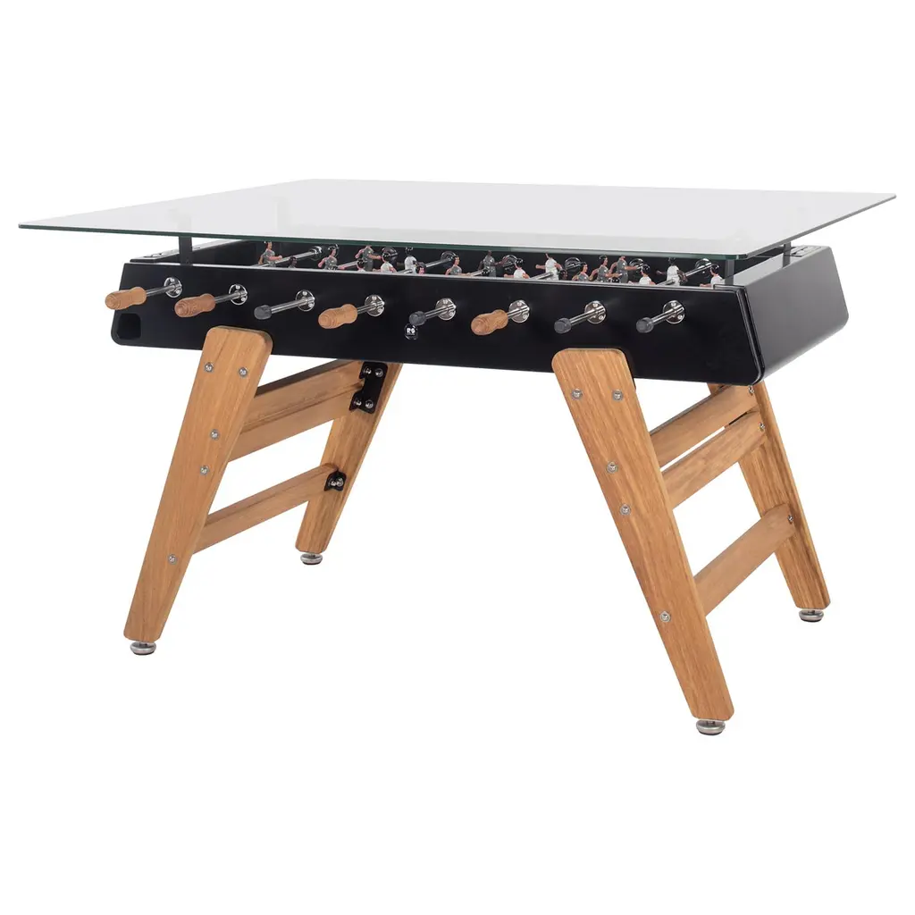 The RS3 Foosball Table/Rectangular Wood Dining Table by RS Barcelona is the perfect piece to stand around or pull up a set of your favorite stools to. Fun and functional, this foosball table was designed by José Andrés and Rafael Rodríguez and features a glass top that allows it to also act as a dining table. Between games, this piece is perfect to gather around for a meal or offers a space for snacks and drinks during gameplay. Suitable for both indoors and out, this table is fitted with beautiful wooden legs, and the neatly arranged players within are always ready for a match.