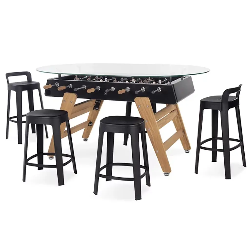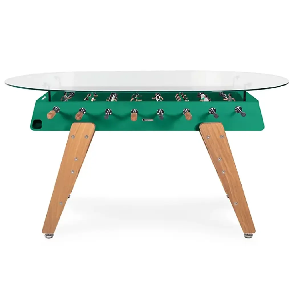 The RS3 Wood Oval Dining Foosball Table by RS Barcelona updates the ever-fun football table by designers José Andrés and Rafael Rodríguez by placing a glass top over the field. With enough room for six people to gather around, the idea for this playful table came from chef José Andrés, who wanted to bring this game into his culinary universe and create an eclectic dining experience. Splayed legs support a field of players, aligned for a game that can be paused for dinnertime or continue through drinks and snacks, making this design a central part of rooms where friends and family spend time together.