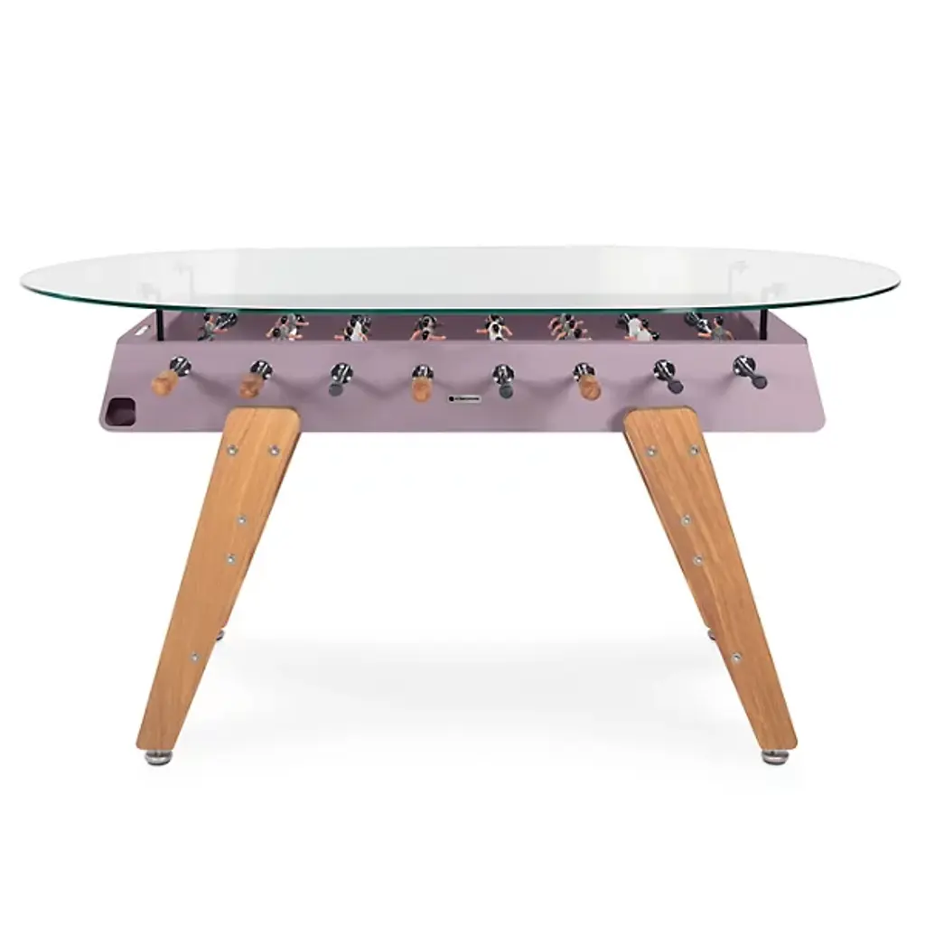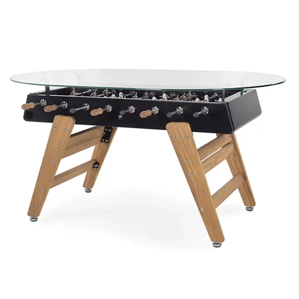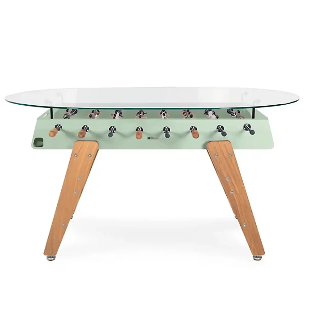 The RS3 Wood Oval Dining Foosball Table by RS Barcelona updates the ever-fun football table by designers José Andrés and Rafael Rodríguez by placing a glass top over the field. With enough room for six people to gather around, the idea for this playful table came from chef José Andrés, who wanted to bring this game into his culinary universe and create an eclectic dining experience. Splayed legs support a field of players, aligned for a game that can be paused for dinnertime or continue through drinks and snacks, making this design a central part of rooms where friends and family spend time together.