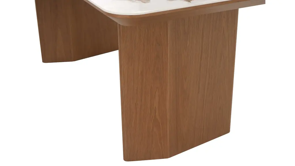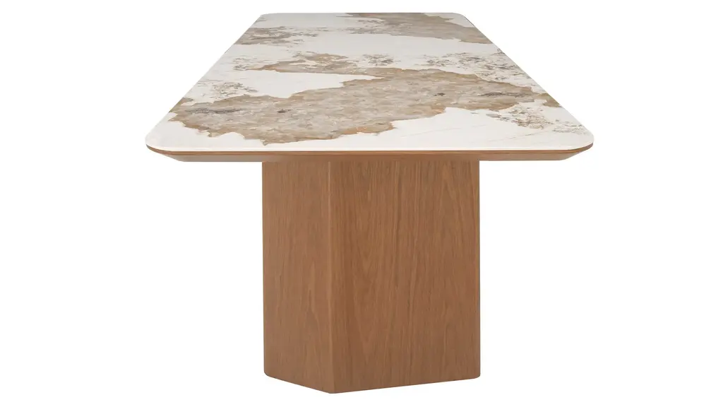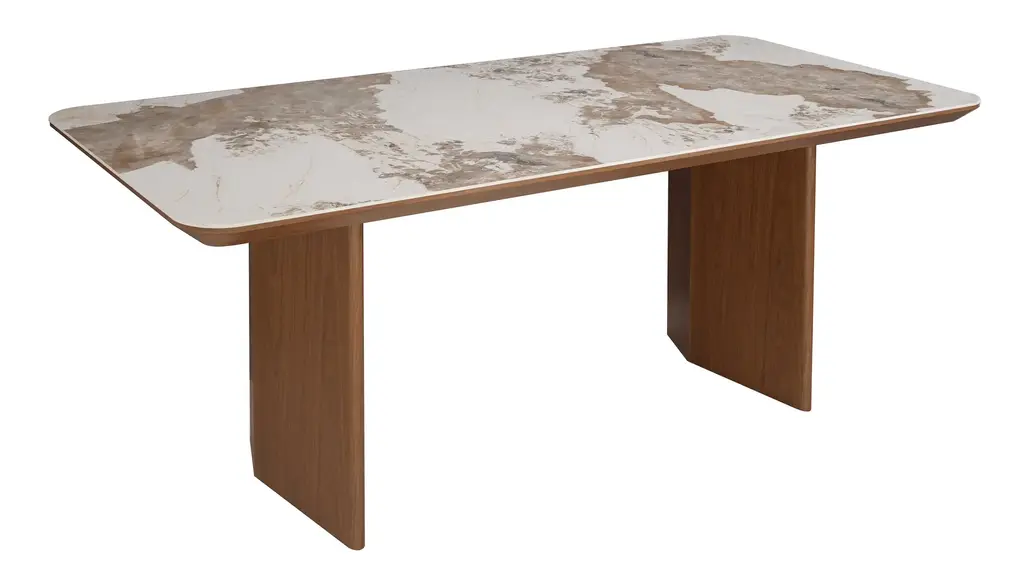 Ruby Dining Table with a unique taupe ceramic pattern. Gaze down on a beautiful marbleized ceramic top, supported by and blending effortlessly with a wooden double pedestal base in a warm walnut veneer.