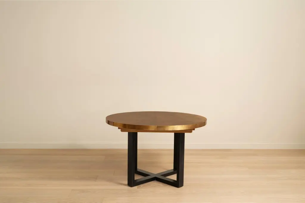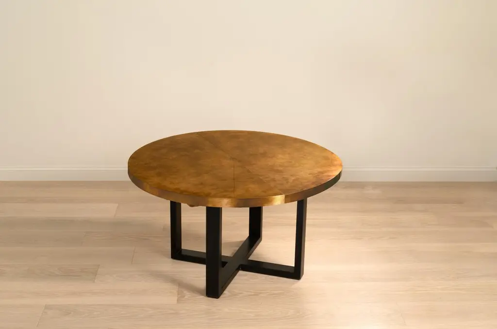 The Orlando Dining Table features a brass, copper or zinc wrapped table top with a 'x' frame steel base, in a powder coated steel finish.