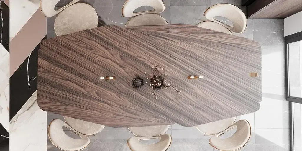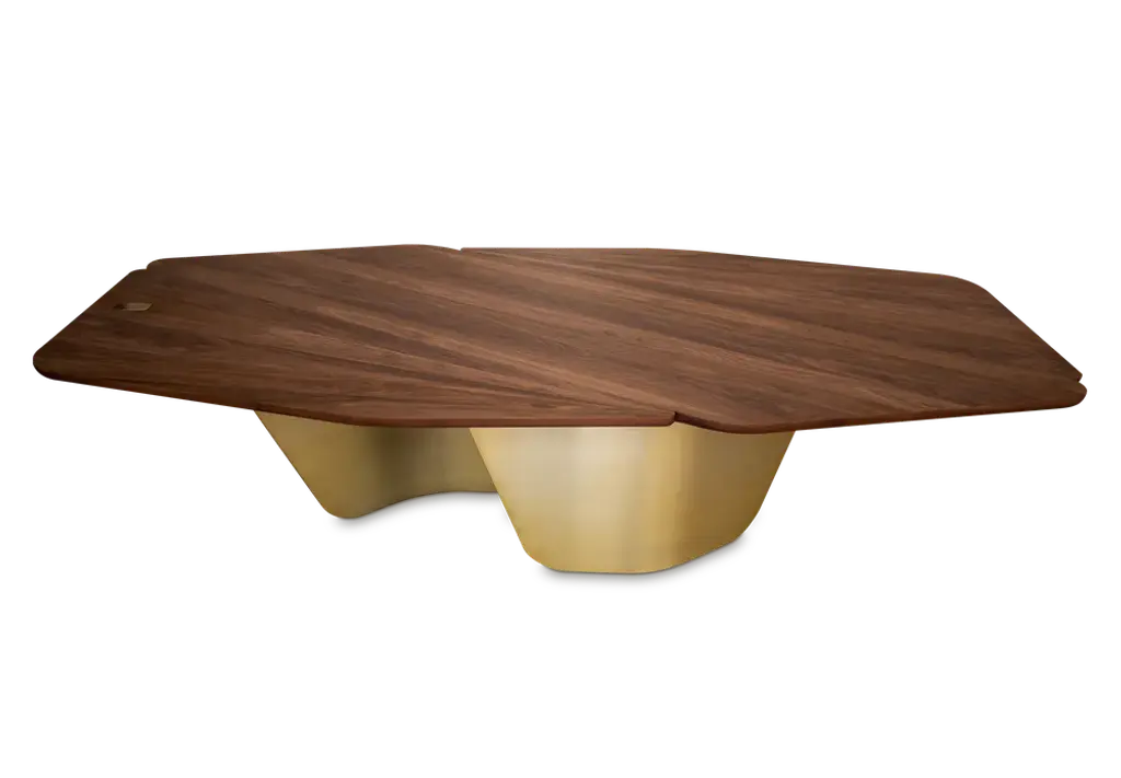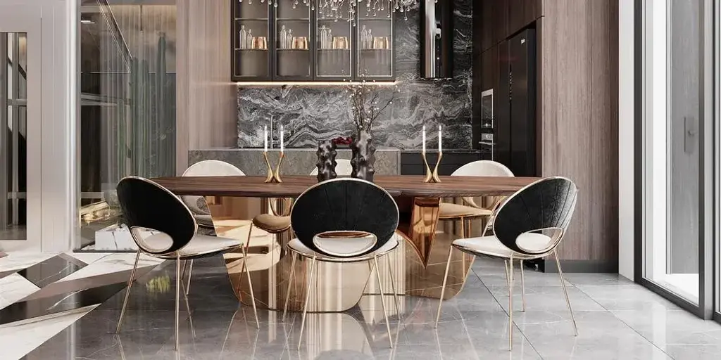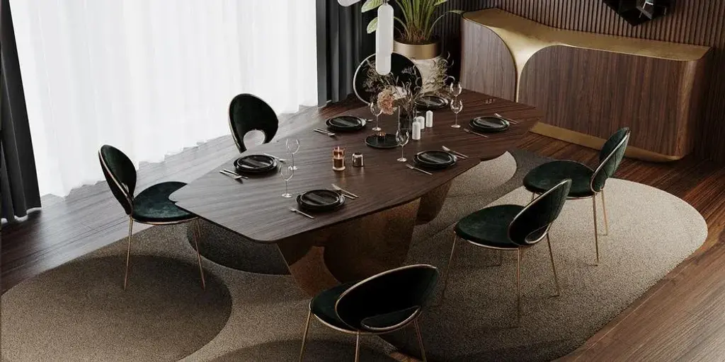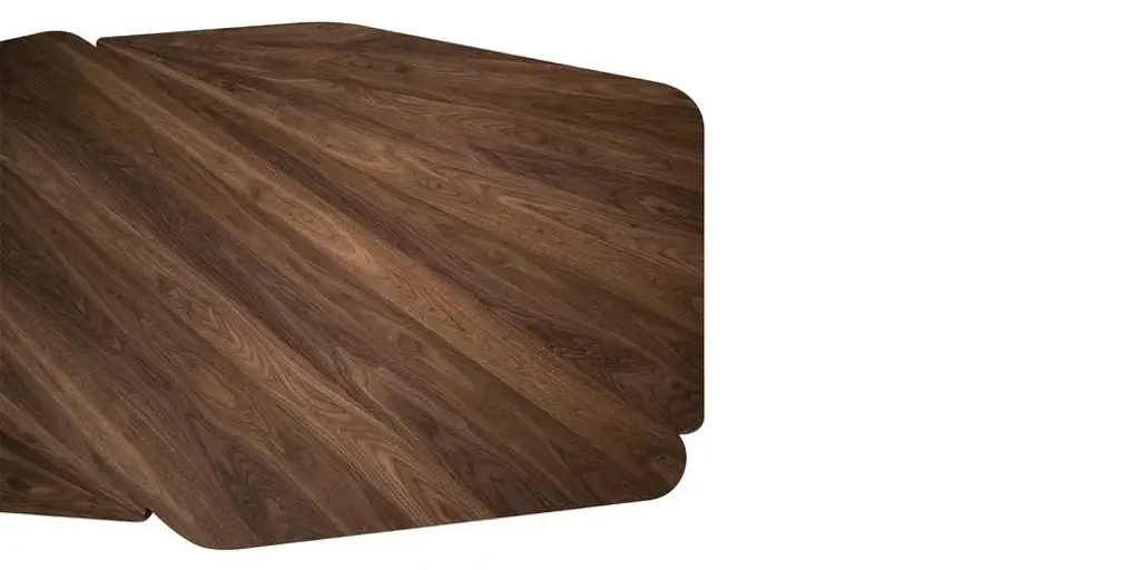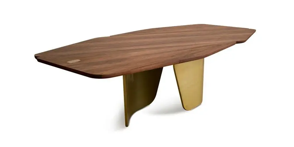 The Rusak dining table features a fascinating marquetry set of walnuts on the tabletop that matches the darkened nickel or metal brass finish leg. This piece promises to elevate your dining room space to another level, to luxury and glamour. Labeled by Maker