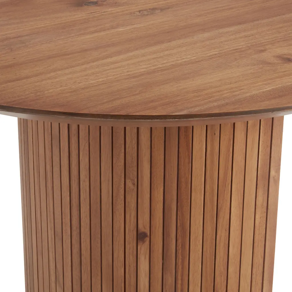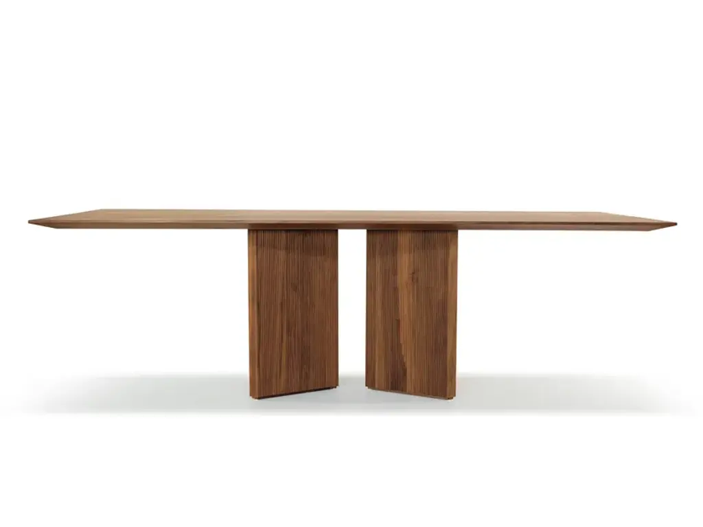Our large Russo dining table features a long oval surface with a tapered base, half-circle pedestal legs with textured fluting and your choice of finishes. Skillfully constructed by Vietnamese artisans, its architectural style showcases the beauty of the wood's natural grain patterns. A modern classic for formal entertaining and casual family meals, it pairs with a wide range of dining chairs.
