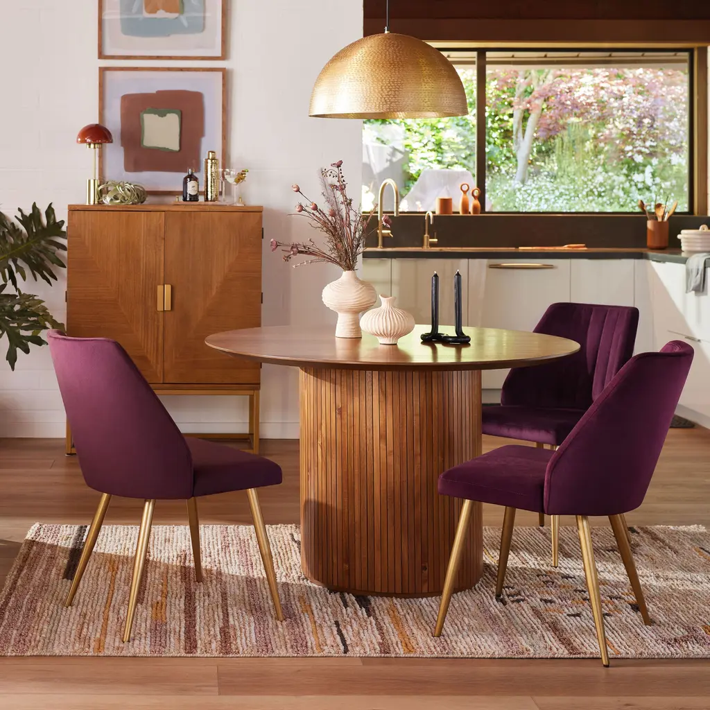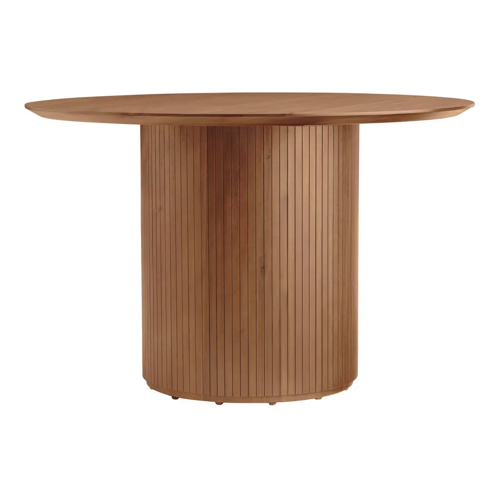 A small-space stunner, our Russo wood dining table balances a beveled round tabletop on a circular pedestal embellished with vertical fluting. Skillfully crafted by Vietnamese artisans, this architectural kitchen table showcases chic texture and organic grain patterns in your choice of distinctive finishes. A modern classic for dining rooms of all sizes, its streamlined symmetry seats four in traditional, farmhouse and contemporary settings.