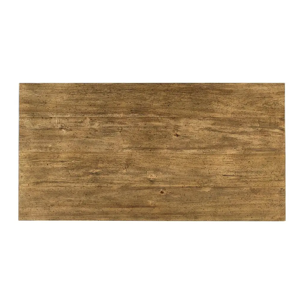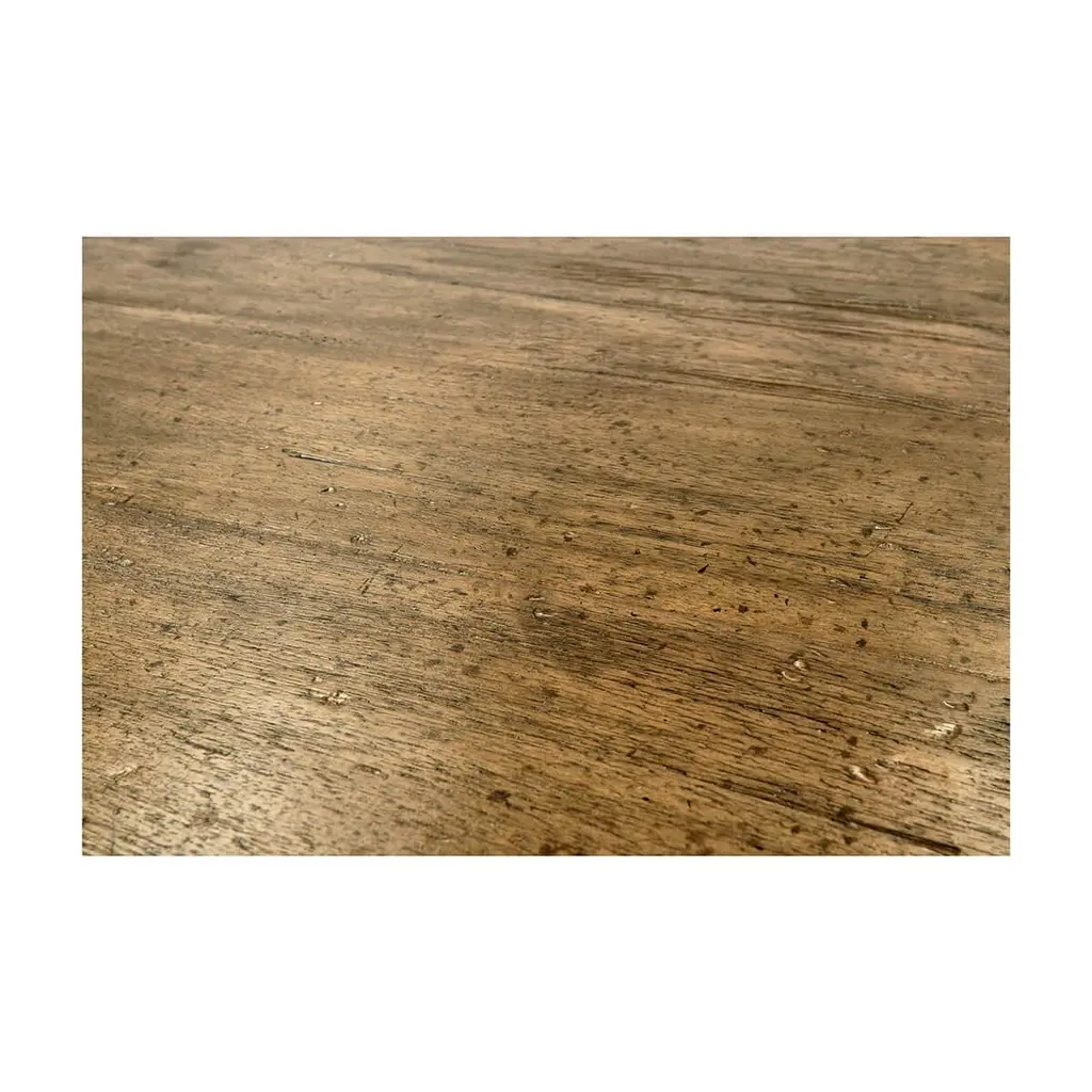 Rustic country dining table with a solid distressed top, the medium driftwood rustic finish shows exposed saw marks and the trestle end base with mortice and tenon joints to the stretcher and supports.Dimensions: 54" W x 28" D x 30" H.