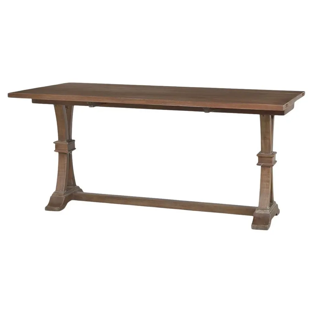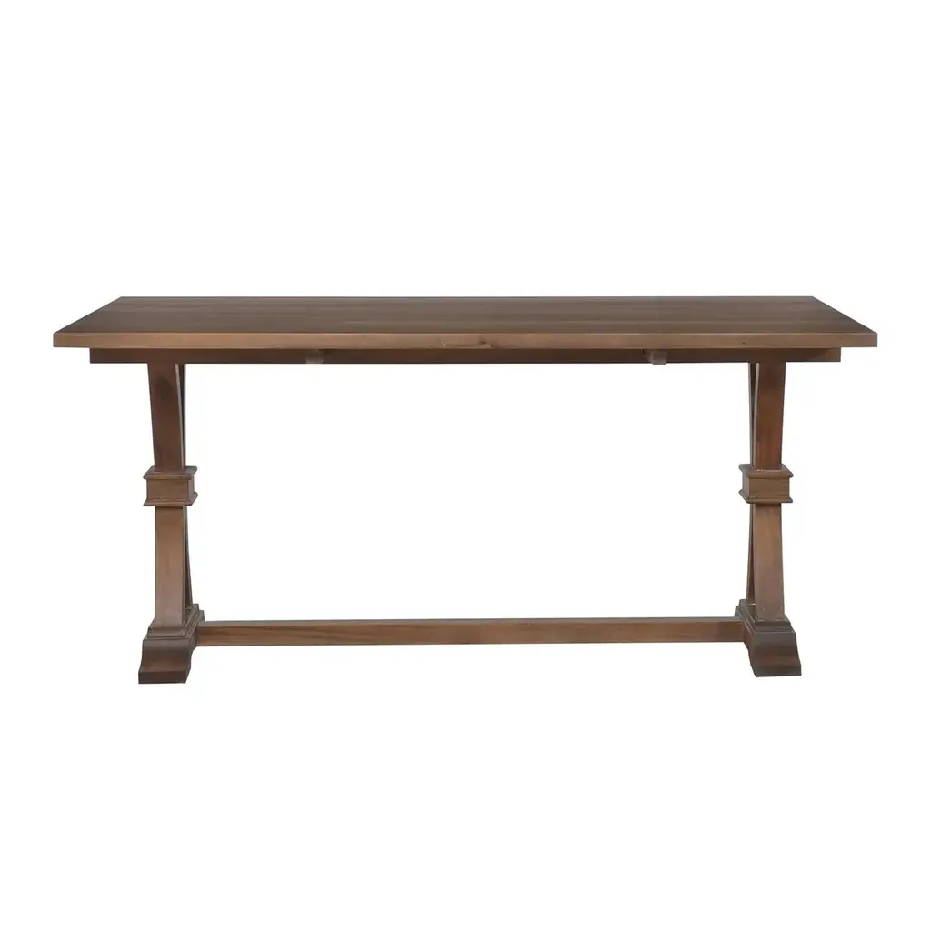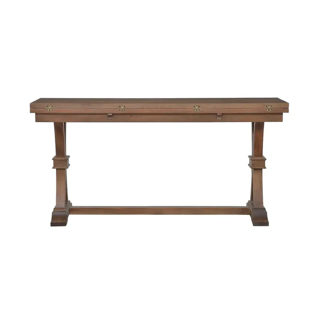 A perfect blend of functionality and timeless charm. Crafted from solid mahogany, this table features a fold-out design, offering versatility to suit your needs. Whether you use it as a compact console table or extend it for additional dining or workspace, its classic rustic finish adds a warm, inviting touch to any room. Finished in our hand-rubbed Straw wash finish, this table's sturdy construction ensures durability, while its elegant design complements a variety of decor styles. The robust trestle end legs provide stable support, and the spacious tabletop offers ample room for your decor items, books, or dining essentials. Ideal for smaller spaces or multifunctional rooms, this fold-out console table is a practical and stylish addition to your home. Open Dimensions: 64" W x 36" D x 30" H Closed Dimensions: 64" W x 18" D x 31" H