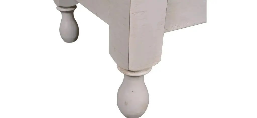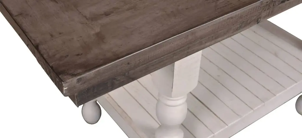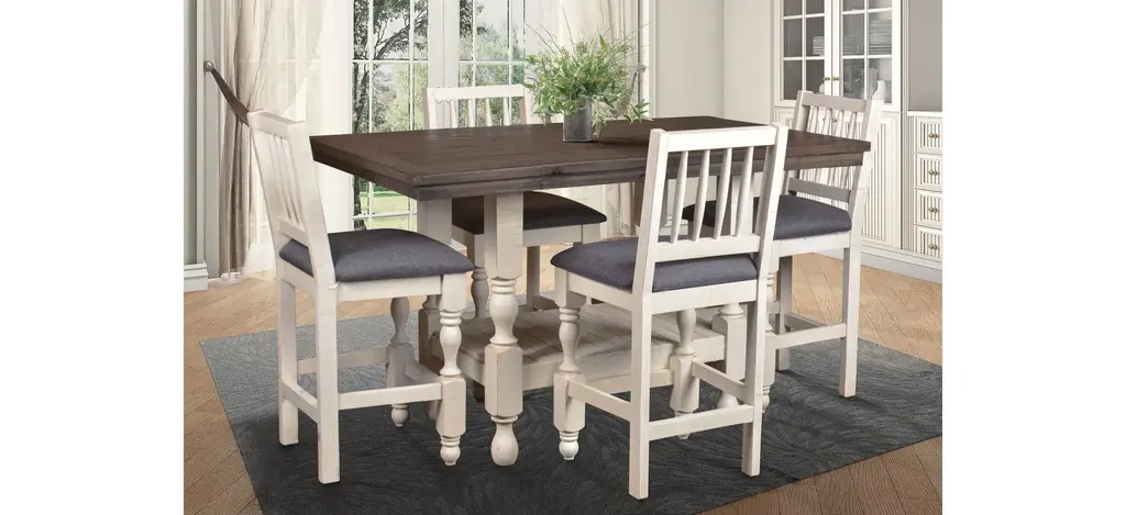 Enjoy luxury with a conscience, crafted with solid sustainable pine wood from renewable tree farms, the rectangle shaped Rustic French 60" Counter Height Table is beautiful for your home and the planet. Convenient authentic wood blanked storage shelf is oh so handy for your dining and entertaining needs. French rustic combined with Hamptons style, this quality dining room or kitchen furniture will add coastal living decor to your lake house, country chic cottage or high rise. Romantic antique white finish brightens your living space while the brown planked top and elegant turned ball feet will blend with your traditional decor. Thick balusters legs provide sturdy support with a contemporary vibe. Like the surf hitting the sand, have one room drift into the other.