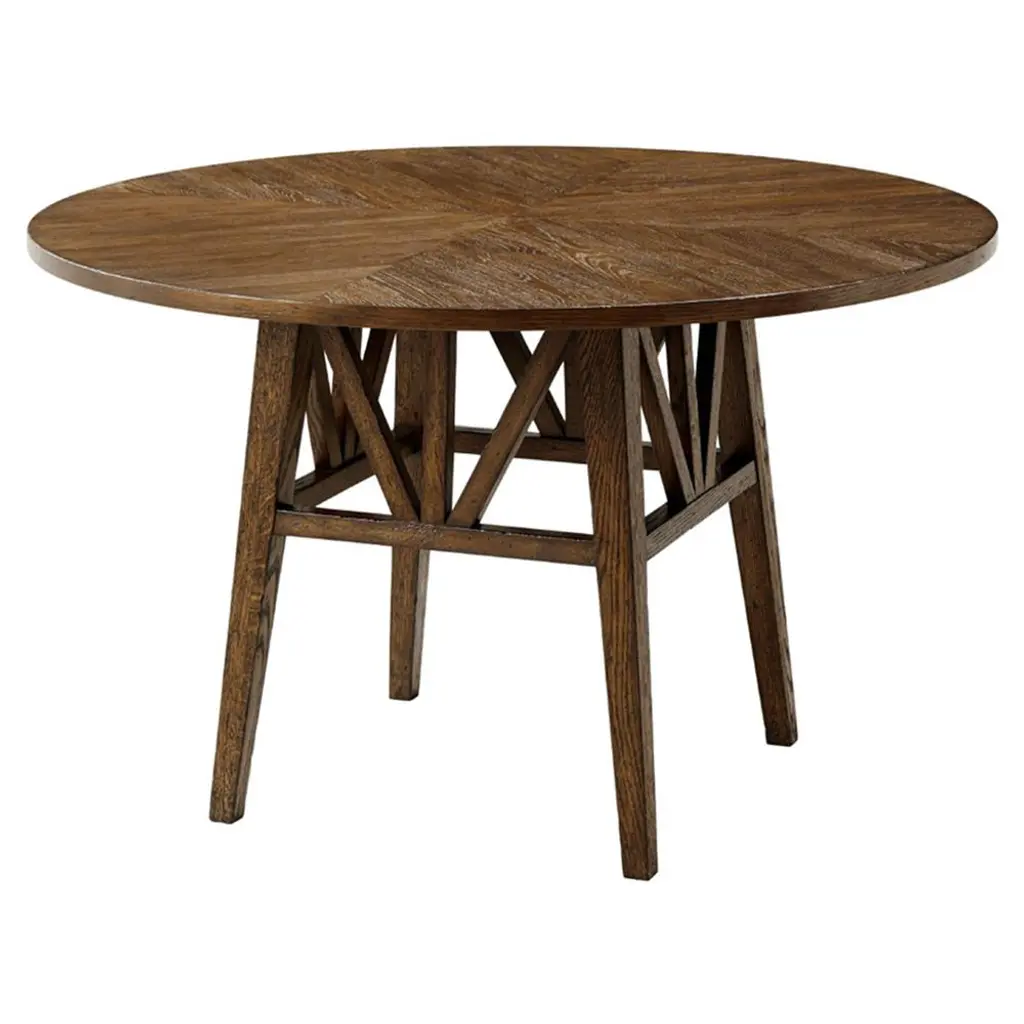 A rustic oak round dining table with tapered legs. This beautiful table has a radial-designed oak parquetry top and is raised on a tapered cage frame pedestal base.Shown in dawn finishDIMENSIONS48" W x 48" D x 30" H.