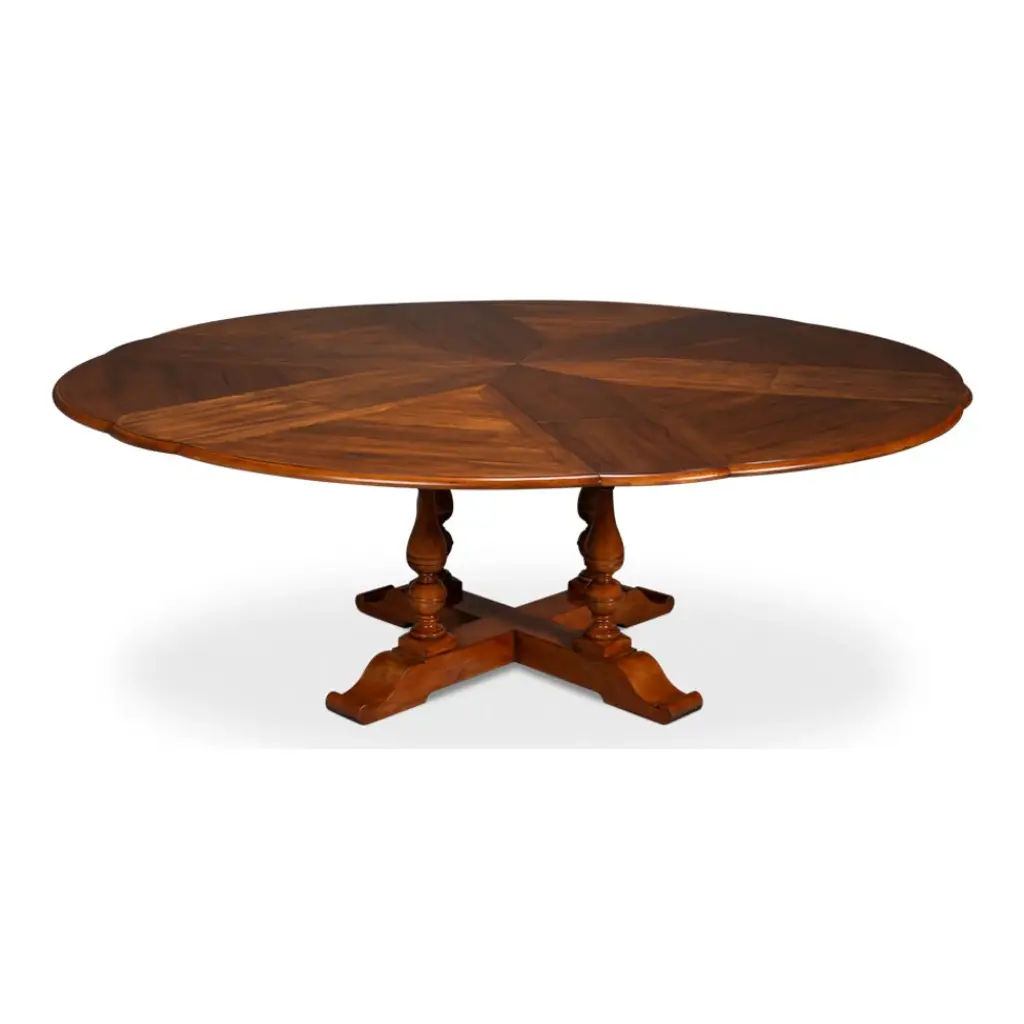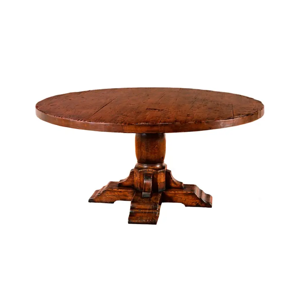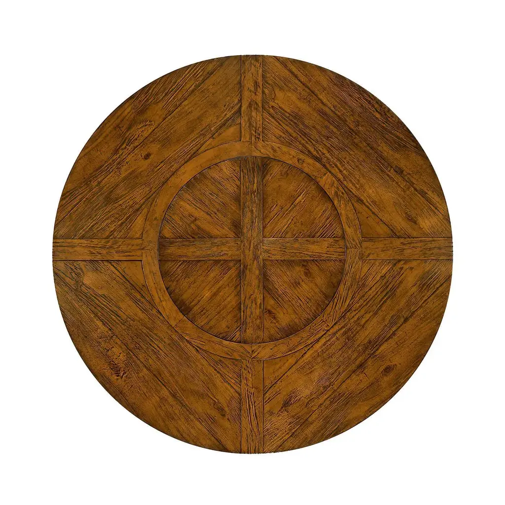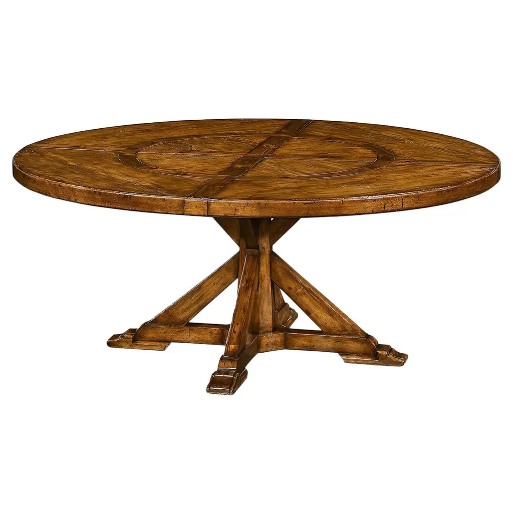 A round dining table in a walnut finish with a rustic finish showing exposed saw marks and set on a bracketed country kitchen base, the table also has a built-in self-storing lazy susan. Dimensions: 72" W x 72" D x 30" H