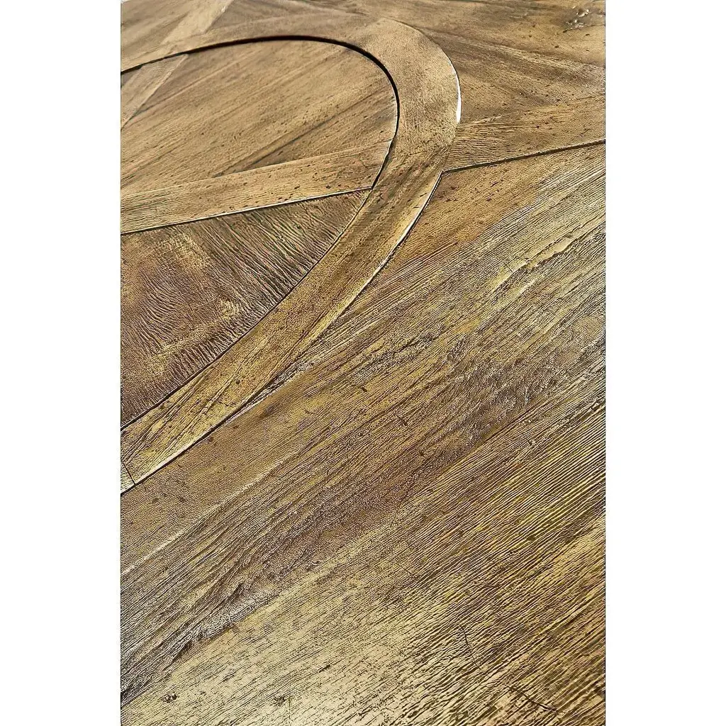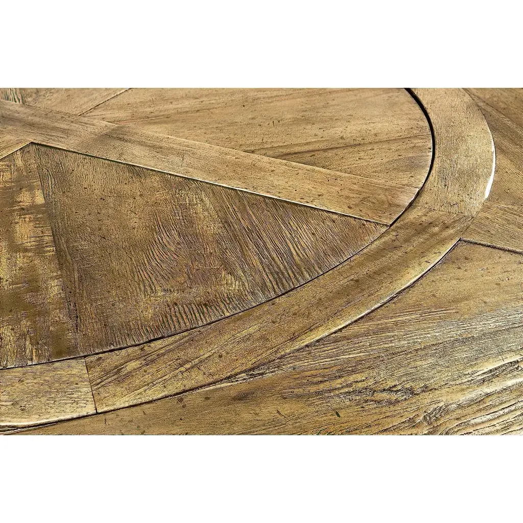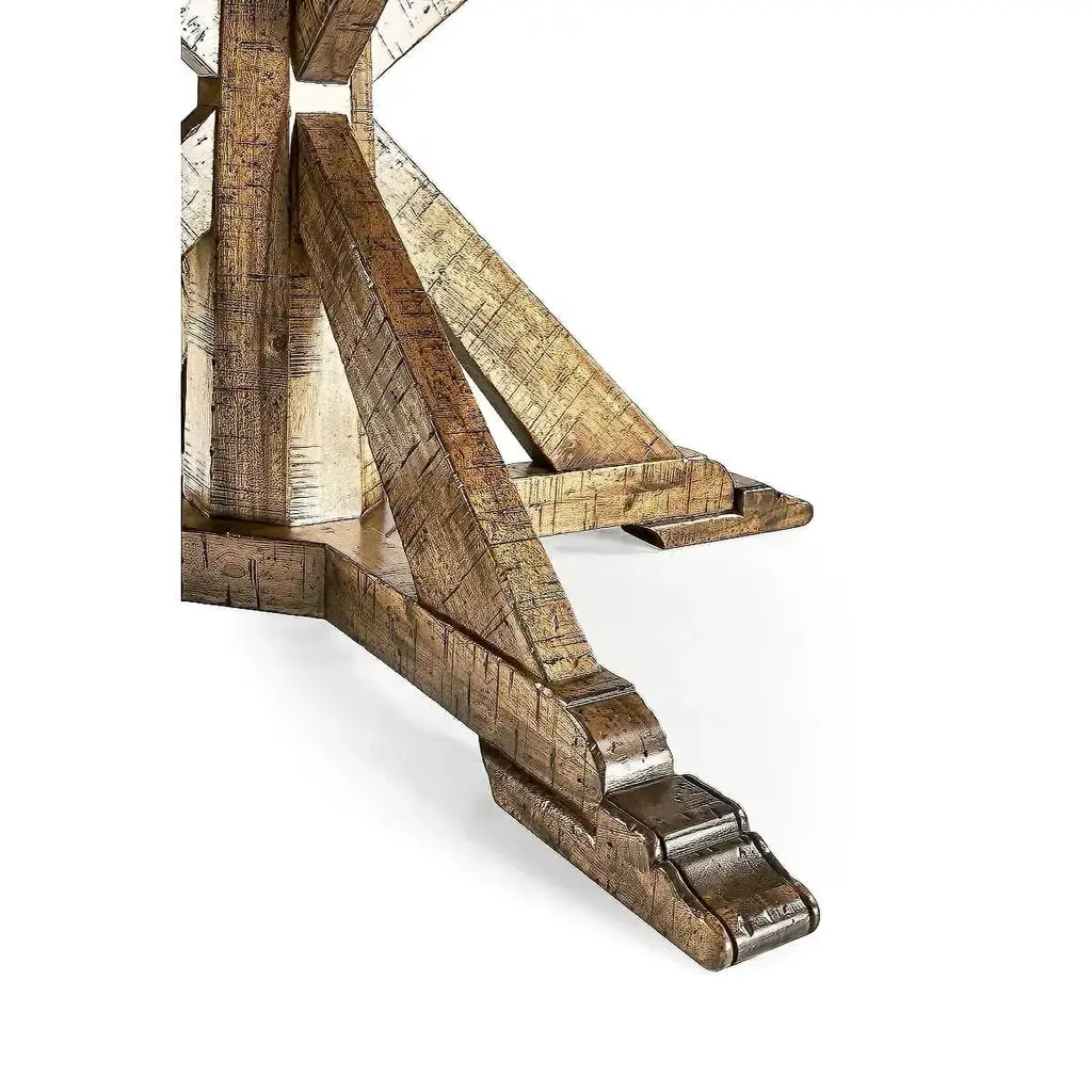 A large round dining table in a medium brown finish with a rustic finish showing exposed saw marks and set on a bracketed country kitchen base, the table also has a built-in self-storing lazy susan. Dimensions: 72" W x 72" D x 30" H