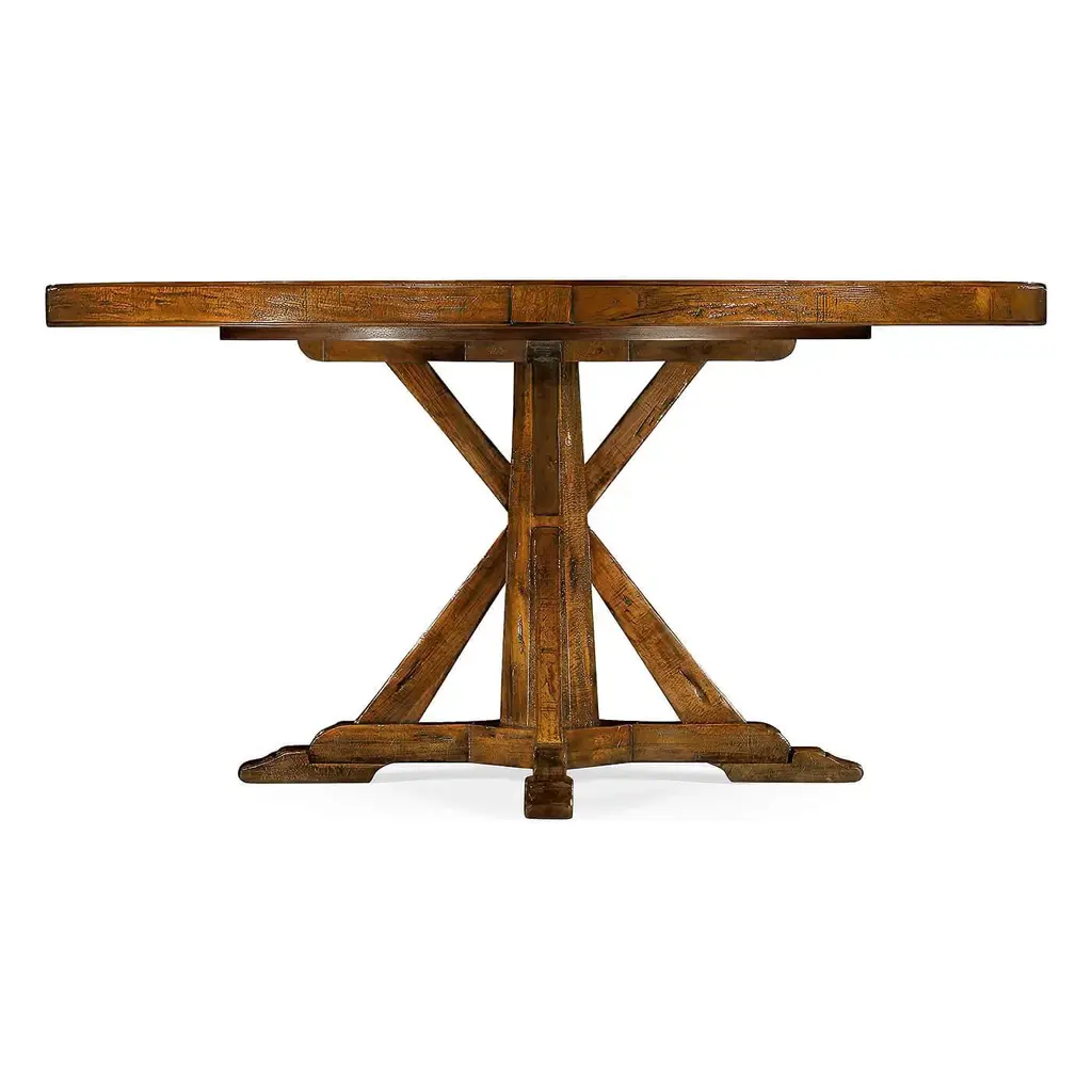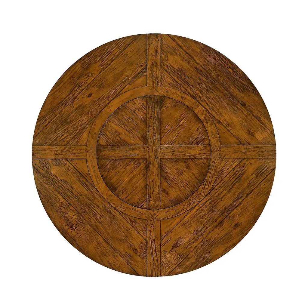 A round dining table finished in a warm walnut color with a rustic finish showing exposed saw marks and set on a bracketed country kitchen base, the table also has a built-in self-storing lazy susan. Dimensions: 60" W x 60" D x 30" H Lead time 16 - 20 weeks.