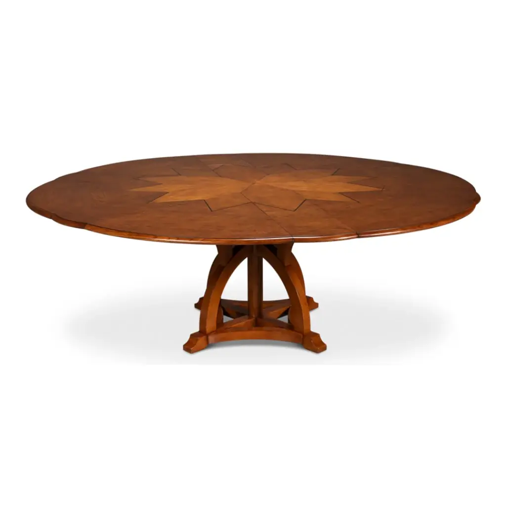 A large round dining table finished in our dark ale color with a rustic finish showing exposed saw marks and set on a bracketed country kitchen base, the table also has a built-in self-storing lazy Susan.Dimensions: 72" W x 72" D x 30" H.