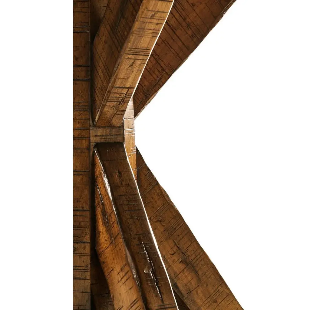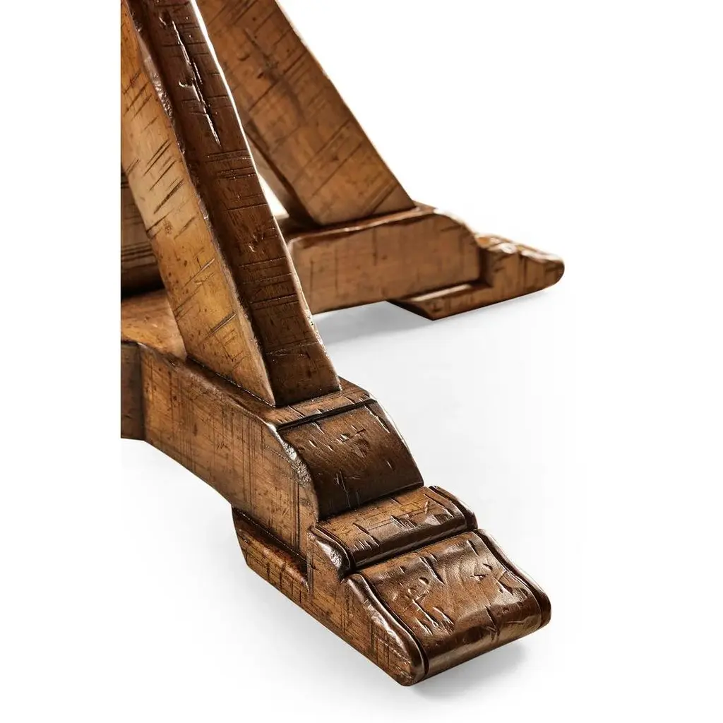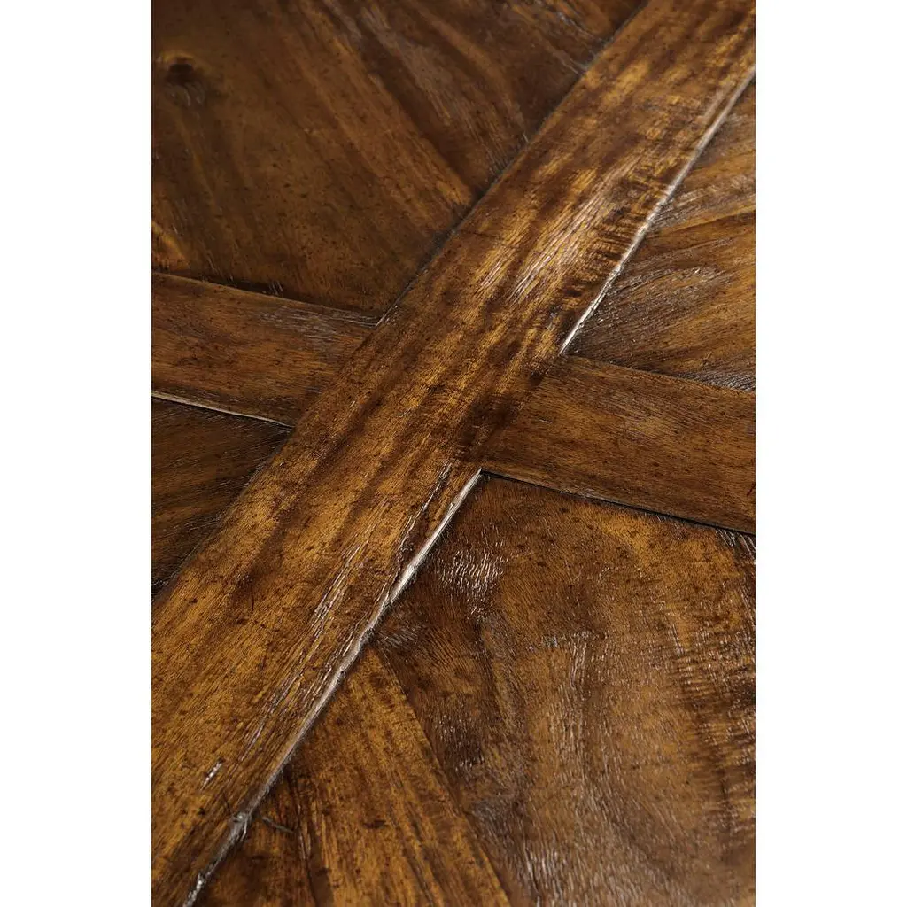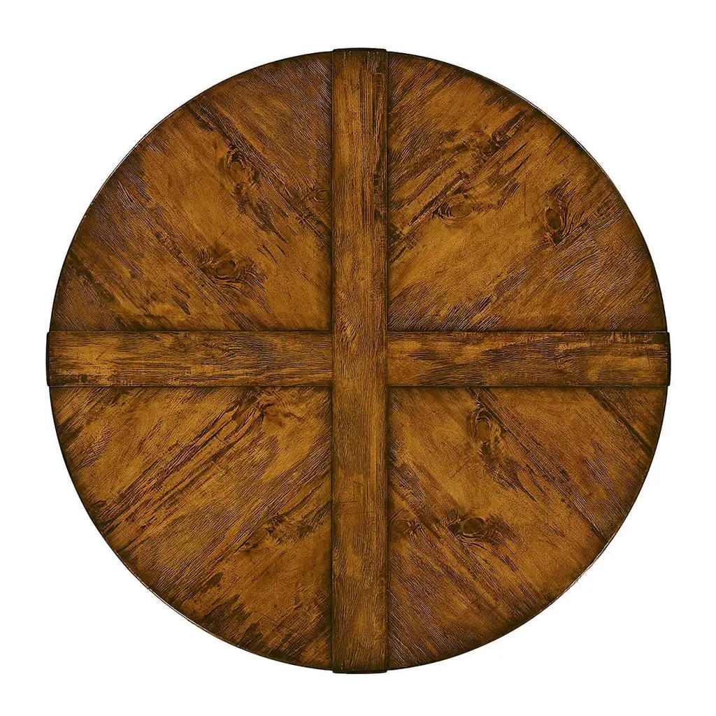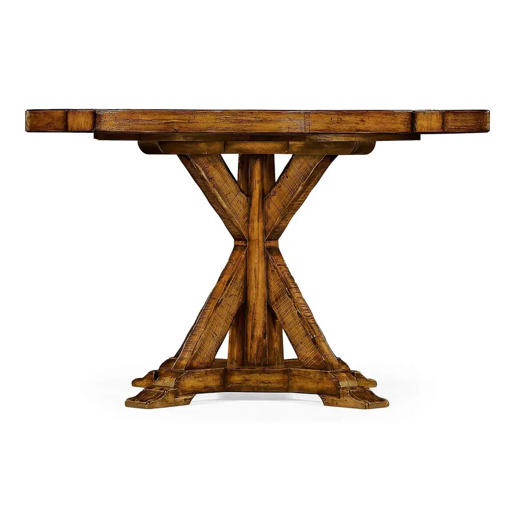 A round dining table finished in a warm walnut color with a rustic finish showing exposed saw marks and set on a bracketed country kitchen base. Dimensions: 48" W x 48" D x 30" H