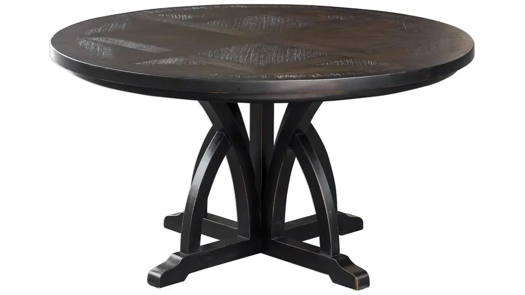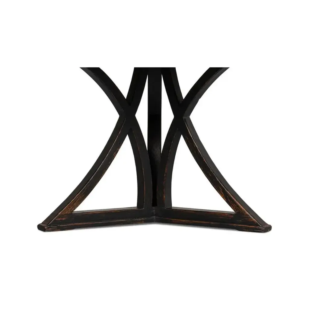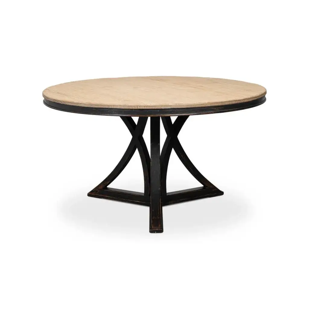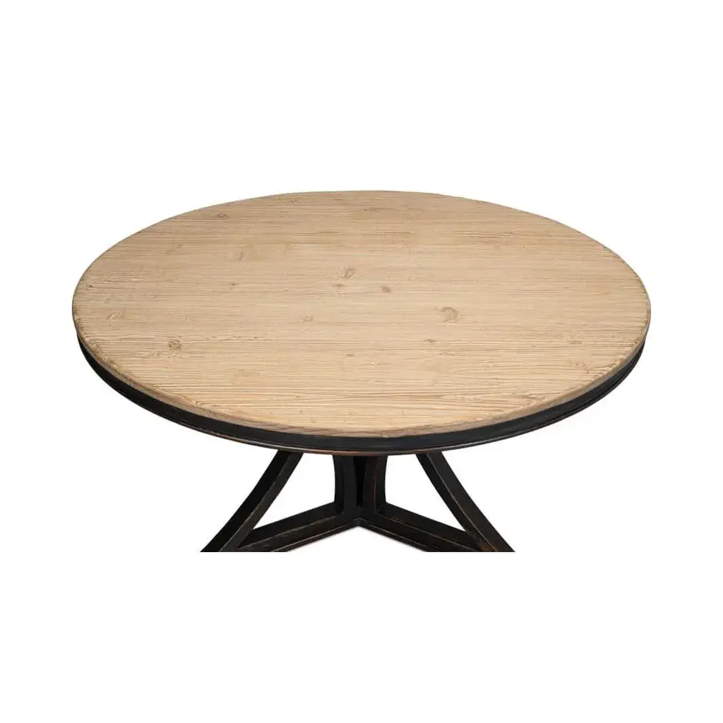 A perfect marriage of contemporary design and rustic flair. Measuring 54 inches in width and depth, and standing at 30 inches in height, this table offers ample space for intimate gatherings and family meals. The table features a beautiful natural pine top, showcasing the rich and warm grain of the wood. This element brings an inviting, organic feel to any dining space. Contrasting the natural pine is an unusual form distressed black base. This distinctive base not only supports the table securely but also adds a unique aesthetic appeal with its distressed finish. The white base offers a modern twist to the rustic top, making the table a versatile piece that fits seamlessly into various interior decors. Dimensions: 54" W x 54" D x 30" H