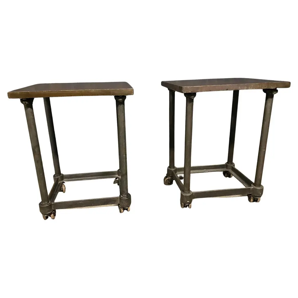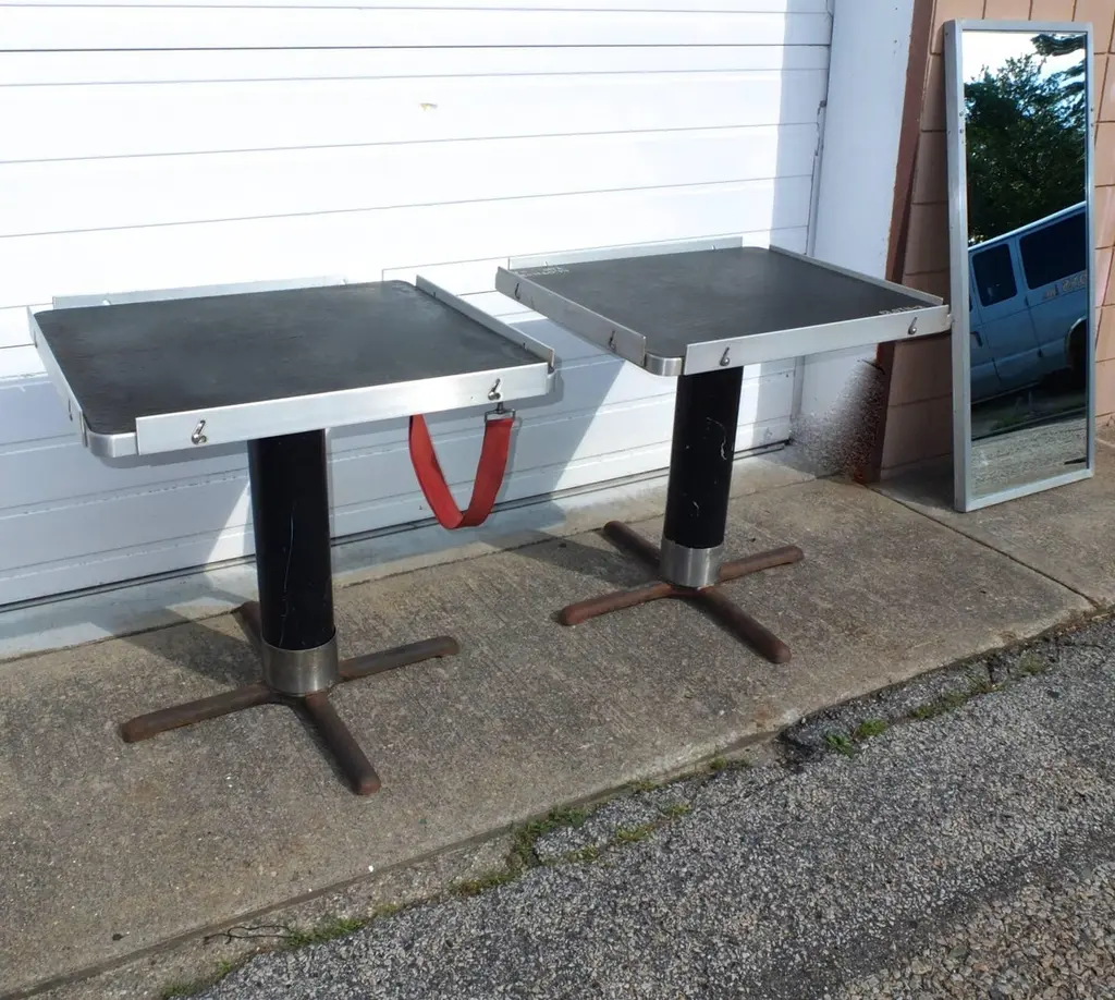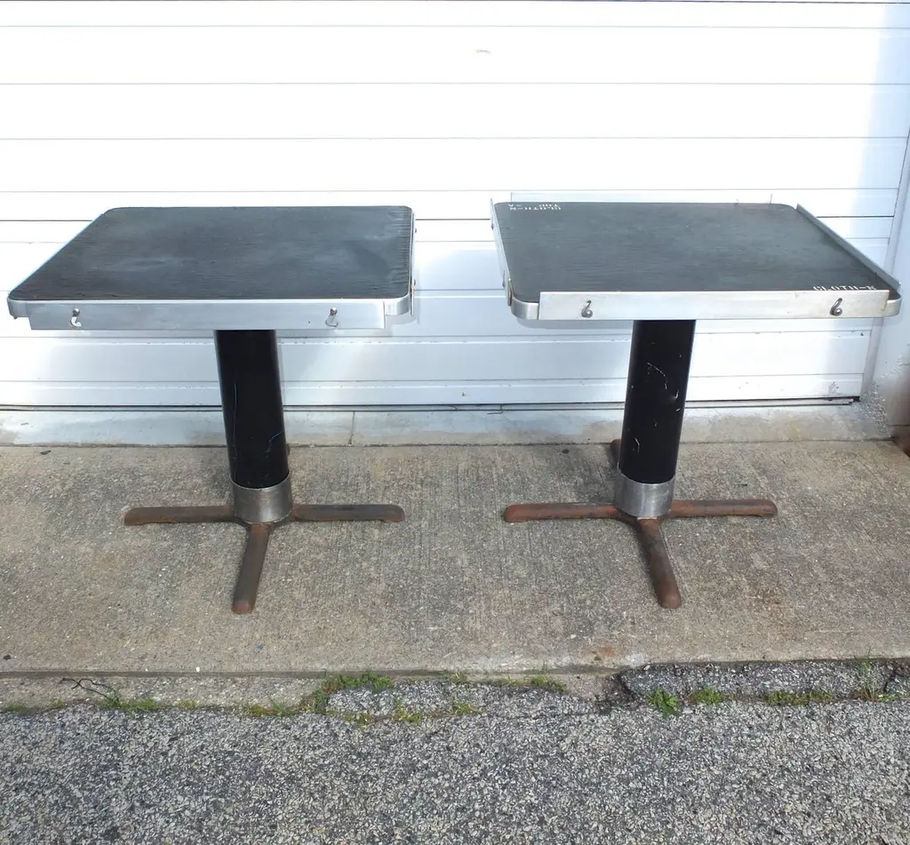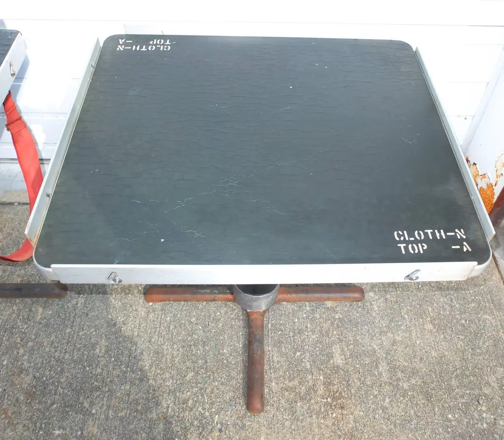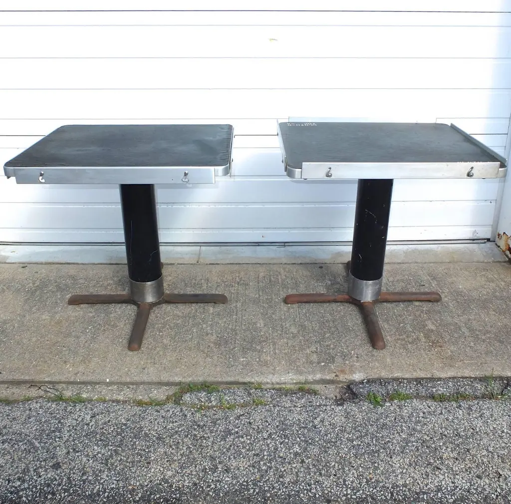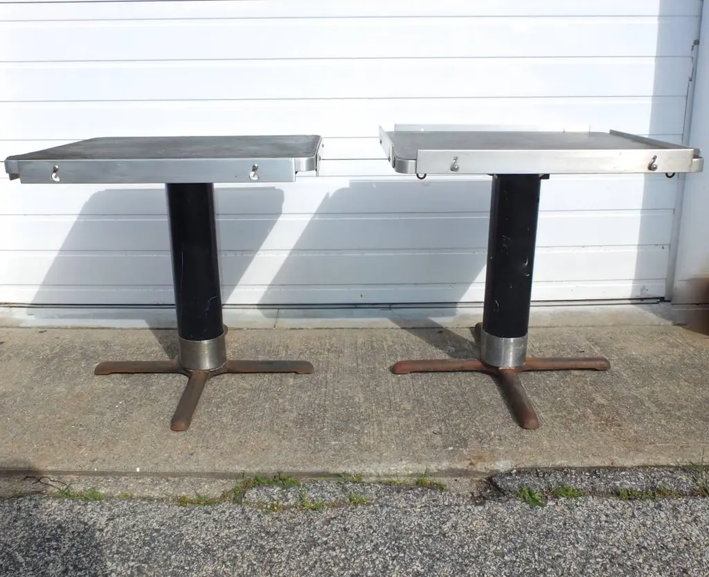 BG GALLERIES END OF SUMMER SALEWe have five original rectangular pedestal dining tables from the first class dining room of the SS United States transatlantic ocean liner.Note the adjustable aluminum guard rails on each side which would be raised to prevent your dinner plates from flying off during rough seas.On the underside are four metal D hooks to which would clip a safety strap to go around the back of each chair to hold it secured.One of the six tables is mounted to a four-star steel bases which allow the tables to be freestanding.Four of the five have a single threaded bolt for screwing the table bases securely to the floor. Image 11 shows the floor mounts in the 1st class dining room of the SSUS. These are available from a good marine supply store.The tops of all these tables are a sheet of black micarta or bakelite which has by now crackled throughout. In most cases table linens would always have covered the tops. If desired it would be possible to replace the top with black Formica laminate or apply a self-leveling epoxy coating. Another idea would be to use a sheet of glass or plexiglas.The pedestals are tubular aluminum which were enameled either black or blue. We can re-enamel these the color you choose.SS United States is a retired luxury passenger liner built in 1952 for United States Lines. Built at a cost of $79.4 million ($733 million in today's dollars) the ship is the largest ocean liner constructed entirely in the US and the fastest ocean liner to cross the Atlantic in either direction. She was designed by American naval architect William Francis Gibbs and could be turned into a troopship should the need arise. The United States never was involved in any wars but was operated uninterrupted in transatlantic passenger service until 1969. In the following two decades she went through several different owners, all of whom tried unsuccessfully to make the liner profitable. Over time the ships fittings were sold at auction, and repairs were made that left her almost completely stripped by 1994. Two years later she was towed to Pier 82 on the Delaware River in Philadelphia where she remains today.Since 2009, a group called SS United States Conservancy has been trying to raise funds to save the ship. The group ended up purchasing her in 2011 but has had a few of its plans fall through which included a "multi-purpose waterfront complex". As the group ran out of money in 2015 it began looking at potentially scrapping the ship, but more donations came in which extended fundraising. This has happened more than once since as the group continues to look at redevelopment plans. The United States still retains the Blue Riband for crossing the Atlantic Ocean as a passenger liner in regular service with the highest average speed.These can be used as single bistro cafe tables or grouped together. The Big U. #oceanliner #ssus #ssunitedstates