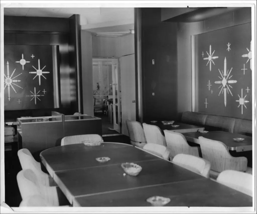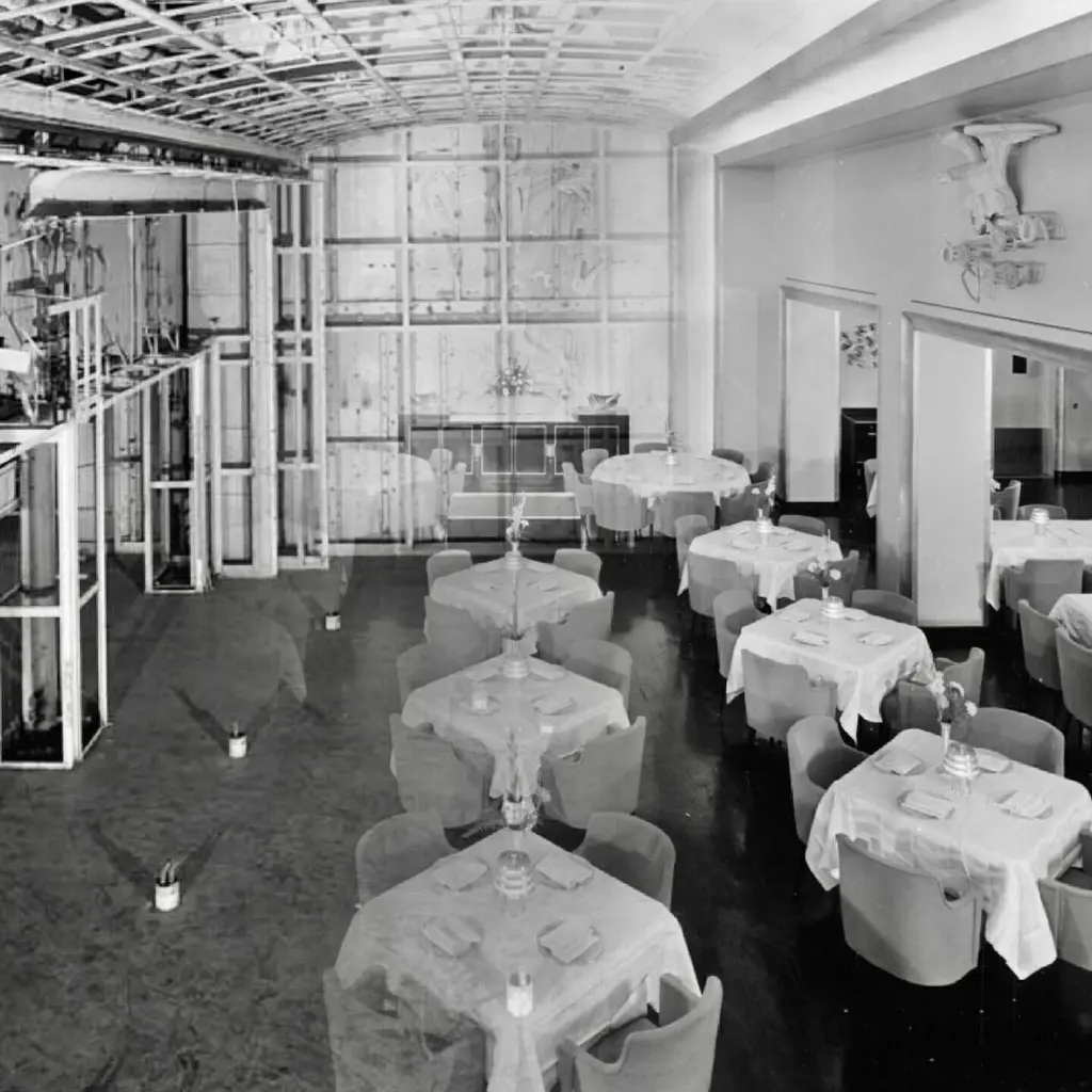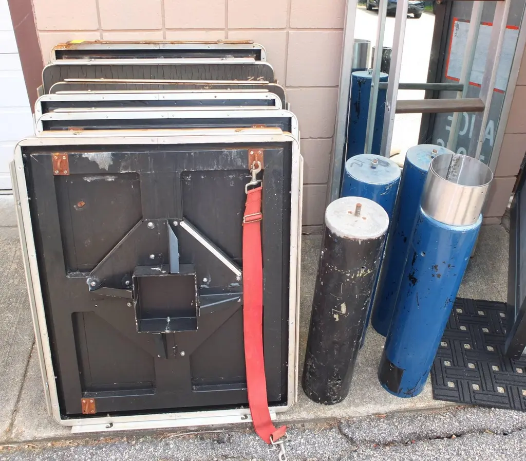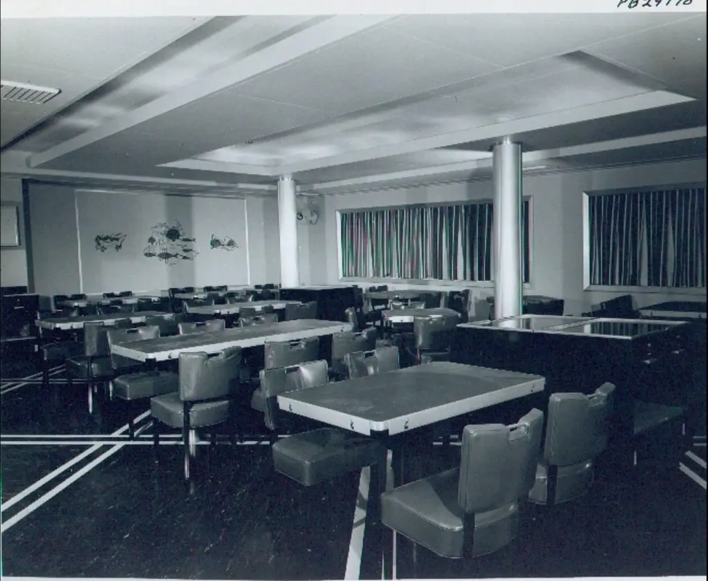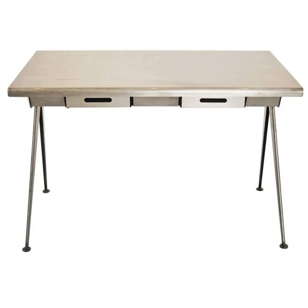 BG GALLERIES END OF SUMMER SALEWe have five original rectangular pedestal dining tables from the first class dining room of the SS United States transatlantic ocean liner.Note the adjustable aluminum guard rails on each side which would be raised to prevent your dinner plates from flying off during rough seas.On the underside are four metal D hooks to which would clip a safety strap to go around the back of each chair to hold it secured.One of the six tables is mounted to a four-star steel bases which allow the tables to be freestanding.Four of the five have a single threaded bolt for screwing the table bases securely to the floor. Image 11 shows the floor mounts in the 1st class dining room of the SSUS. These are available from a good marine supply store.The tops of all these tables are a sheet of black micarta or bakelite which has by now crackled throughout. In most cases table linens would always have covered the tops. If desired it would be possible to replace the top with black Formica laminate or apply a self-leveling epoxy coating. Another idea would be to use a sheet of glass or plexiglas.The pedestals are tubular aluminum which were enameled either black or blue. We can re-enamel these the color you choose.SS United States is a retired luxury passenger liner built in 1952 for United States Lines. Built at a cost of $79.4 million ($733 million in today's dollars) the ship is the largest ocean liner constructed entirely in the US and the fastest ocean liner to cross the Atlantic in either direction. She was designed by American naval architect William Francis Gibbs and could be turned into a troopship should the need arise. The United States never was involved in any wars but was operated uninterrupted in transatlantic passenger service until 1969. In the following two decades she went through several different owners, all of whom tried unsuccessfully to make the liner profitable. Over time the ships fittings were sold at auction, and repairs were made that left her almost completely stripped by 1994. Two years later she was towed to Pier 82 on the Delaware River in Philadelphia where she remains today.Since 2009, a group called SS United States Conservancy has been trying to raise funds to save the ship. The group ended up purchasing her in 2011 but has had a few of its plans fall through which included a "multi-purpose waterfront complex". As the group ran out of money in 2015 it began looking at potentially scrapping the ship, but more donations came in which extended fundraising. This has happened more than once since as the group continues to look at redevelopment plans. The United States still retains the Blue Riband for crossing the Atlantic Ocean as a passenger liner in regular service with the highest average speed.These can be used as single bistro cafe tables or grouped together. The Big U. #oceanliner #ssus #ssunitedstates