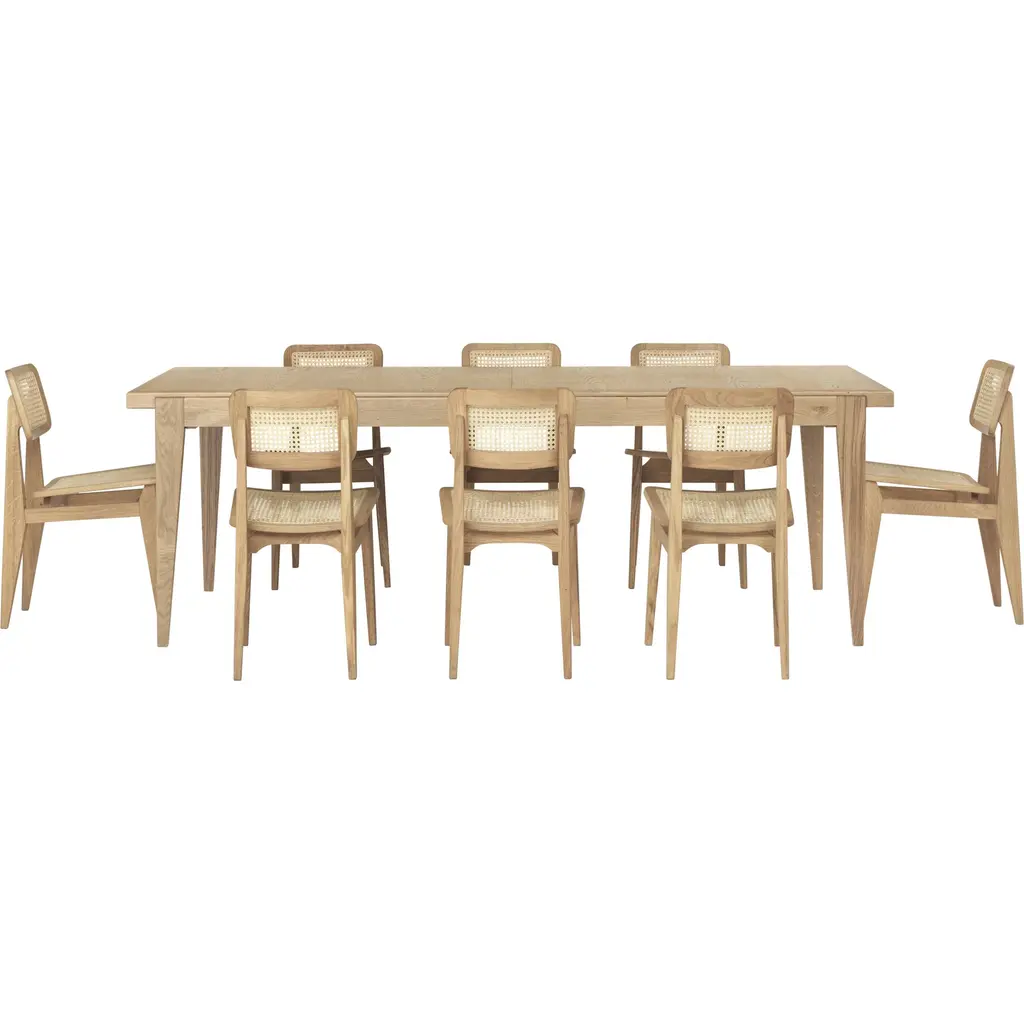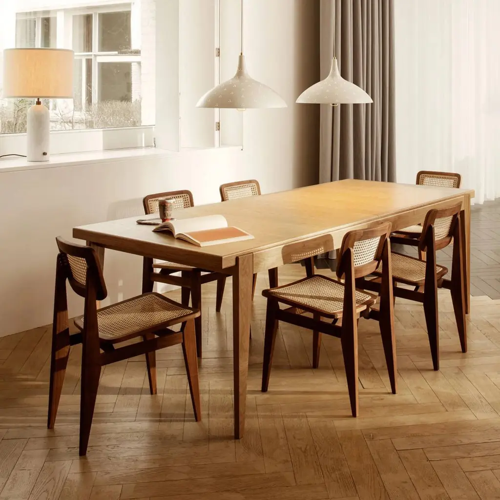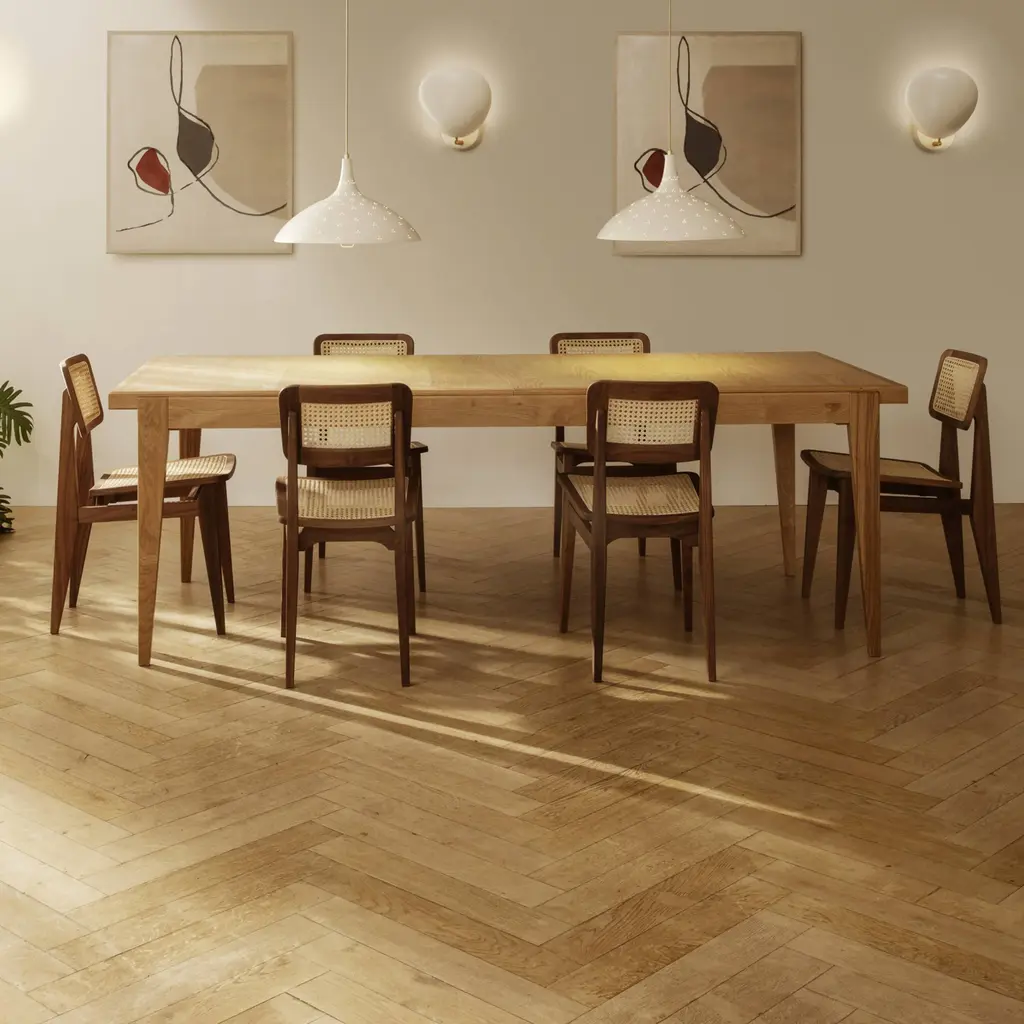Originally conceived for NATO’s residential headquarters in post-war France, S-Table reveals midcentury designer Marcel Gascoin’s mastery of self-effacing style. Characterized by its lean, simple lines and elegantly tapered legs, the rectangular dining table is a model of precise craftsmanship in matte-finish oak or walnut. Seating up to 6 in the standard size, it also comes in an extendable version with 2 insert leaves (stored underneath when not in use) to accommodate 10 place settings.