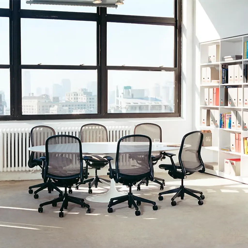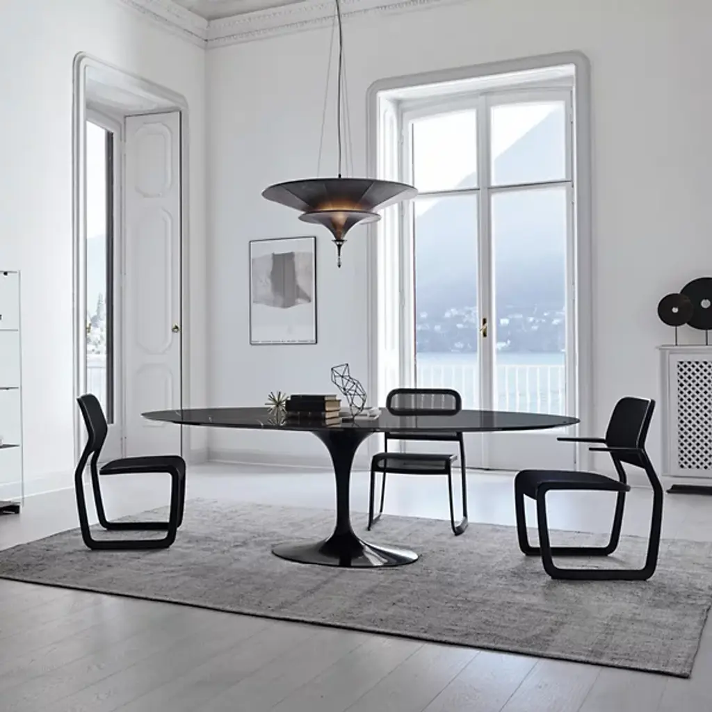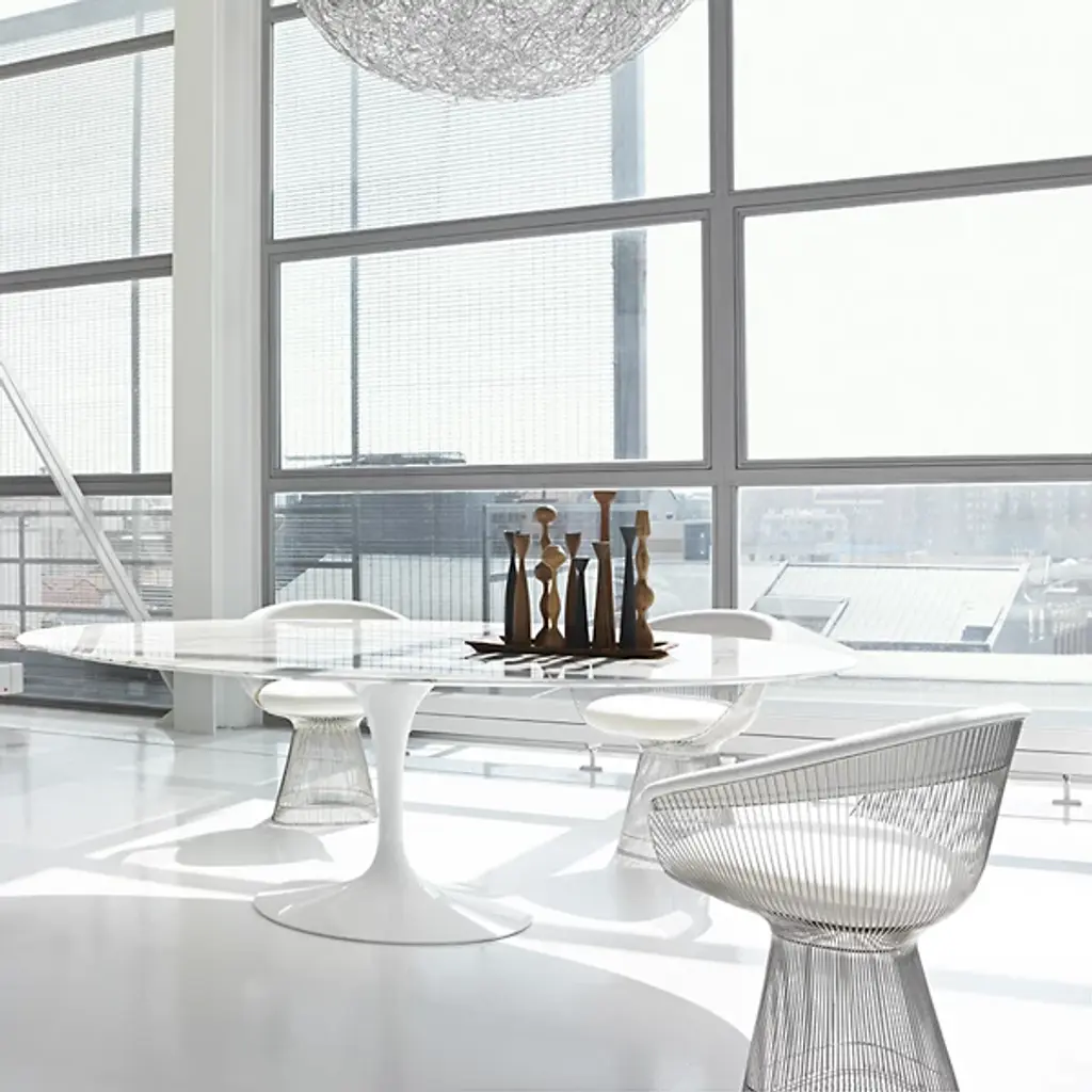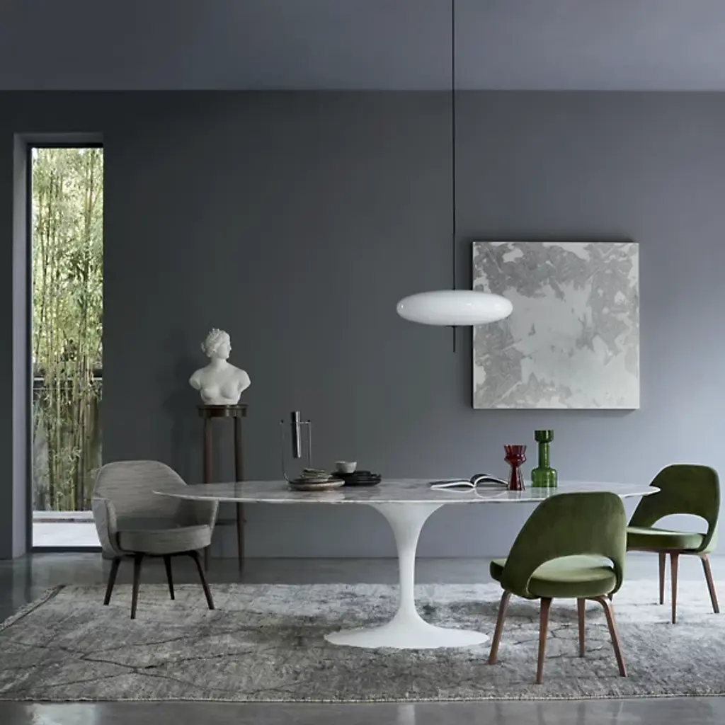 Legendary look since 1957. The Saarinen Oval Dining Table by Knoll was designed by Eero Saarinen to prove that a table base can be as elegant as its table top. The Saarinen Oval Dining Table creates a high sense of comfort, legroom, and ample space for seating. Its tulip shaped base is crafted in molded, cast aluminum that is polished and coated in an abrasion-resistant Rilsan finish. Its top is created from your choice of 1.06” thick satin smooth laminate, .75” transparent polyester coated marble, with a polished or satin finish, or 1.25” thick veneered medium density fiberboard wood. 96” seats 8 guests comfortably. 78” seats 6-8 guests.
