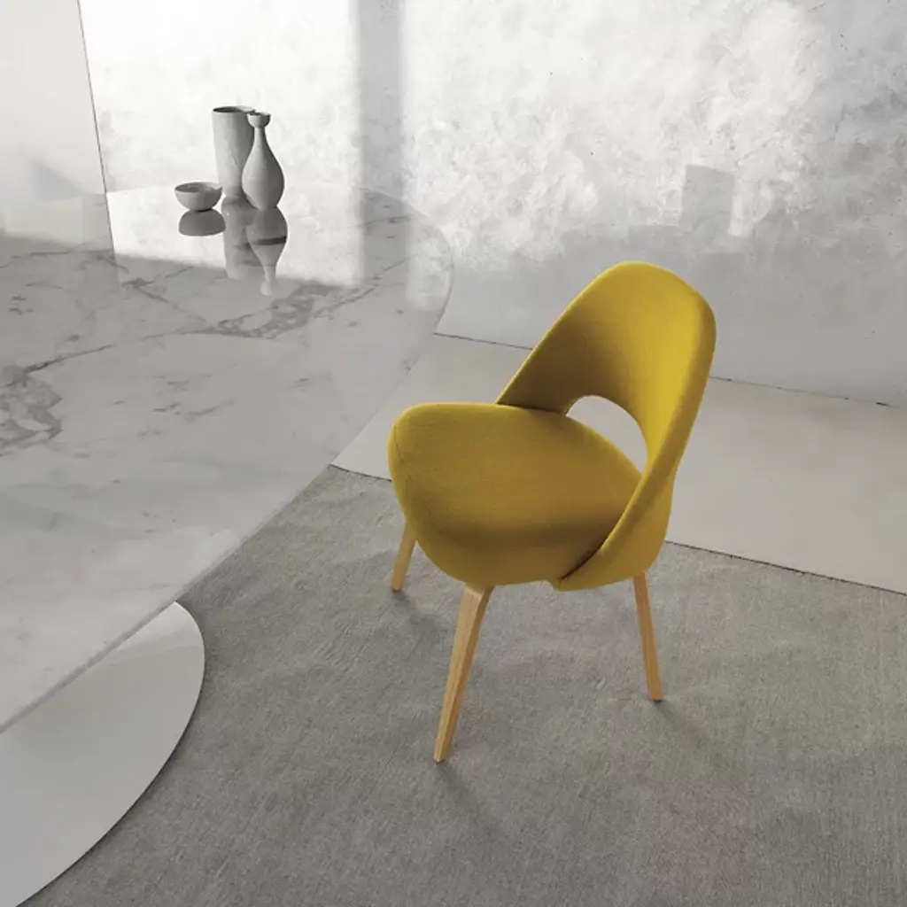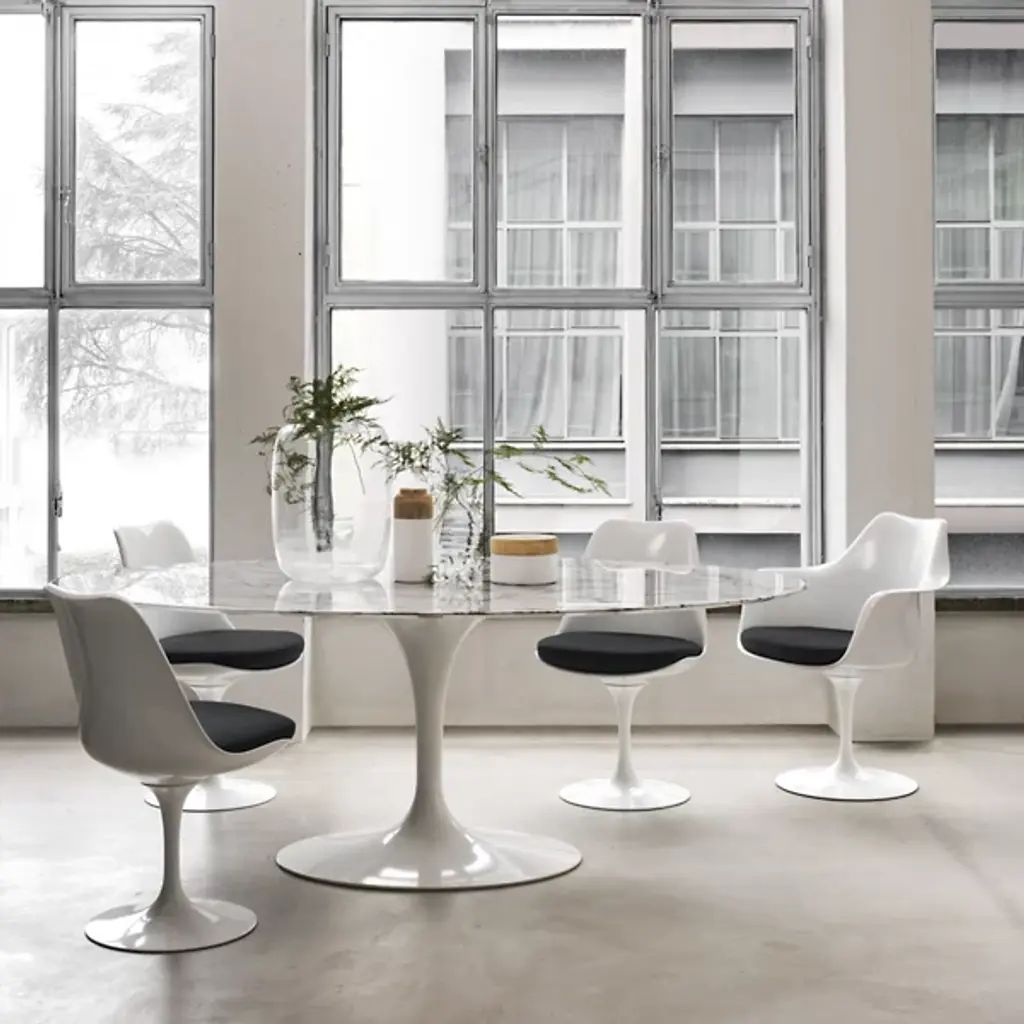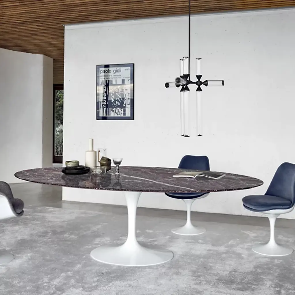Legendary look since 1957. The Saarinen Oval Dining Table by Knoll was designed by Eero Saarinen to prove that a table base can be as elegant as its table top. The Saarinen Oval Dining Table creates a high sense of comfort, legroom, and ample space for seating. Its tulip shaped base is crafted in molded, cast aluminum that is polished and coated in an abrasion-resistant Rilsan finish. Its top is created from your choice of 1.06” thick satin smooth laminate, .75” transparent polyester coated marble, with a polished or satin finish, or 1.25” thick veneered medium density fiberboard wood. 96” seats 8 guests comfortably. 78” seats 6-8 guests.