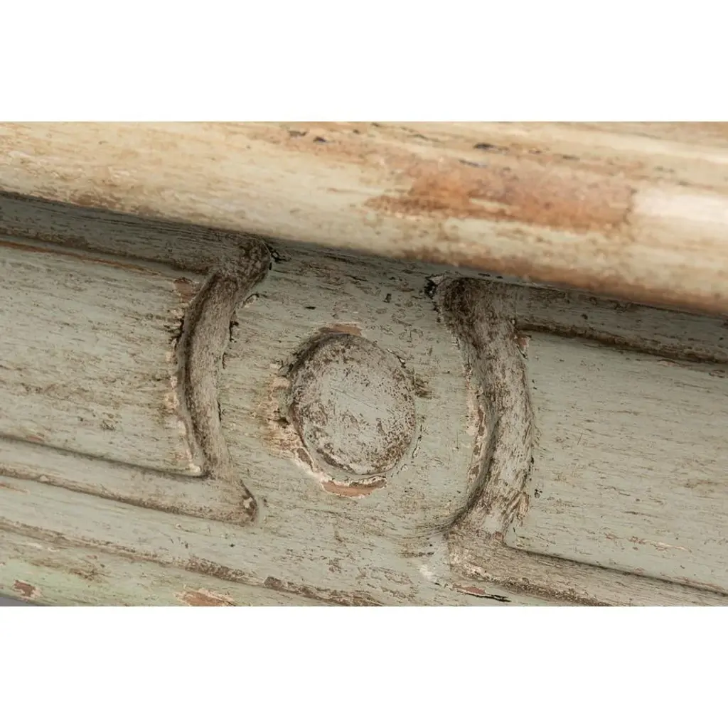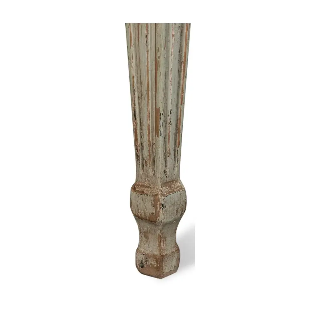 The table exudes a refined charm with its classic lines and well-loved distressed finish. The natural wood top showcases a weathered patina, seamlessly blending rustic warmth with sophisticated craftsmanship. A sage-painted base, featuring a distressed painted finish, enhances its antique-inspired allure. The molded apron and square tapered fluted legs complete the piece, adding an air of Parisian grace to any dining space. This exquisite table serves as both a functional dining surface and a striking design statement, making it the perfect centerpiece for a stylish yet inviting home. Whether placed in a formal dining room or a relaxed country setting, its vintage character and artisanal detailing bring an unmistakable sense of heritage and elegance. Dimensions: 79" W x 37" D x 30" H