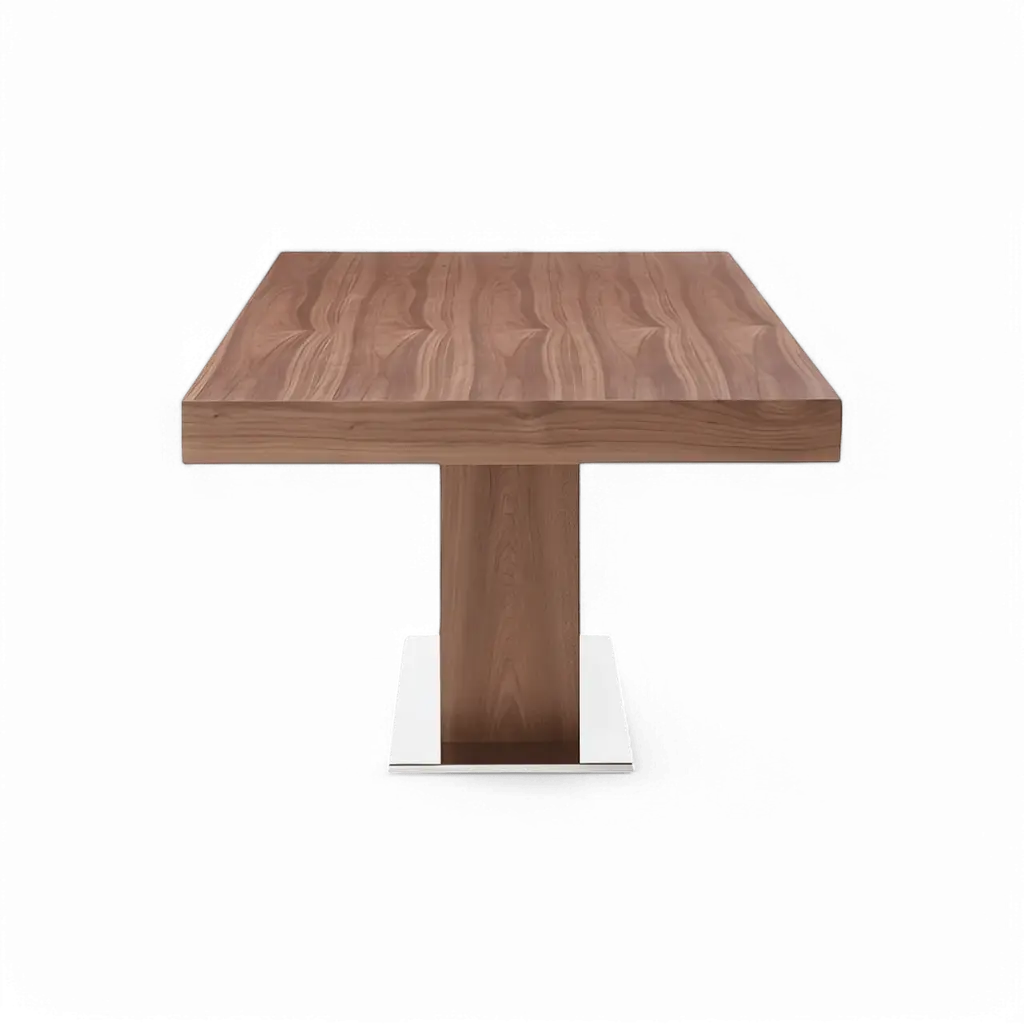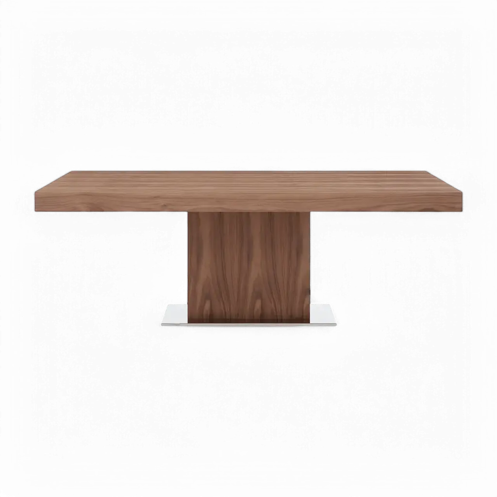 Make mealtimes even more memorable with our stunning Salerno Dining Table. Available in high-gloss white-lacquered wood or walnut-wood veneer, this bold, stately piece will be the focal point of your dining room with its clean, strong lines and sharp angles. It accommodates up to 8 people, making hosting a breeze. Many of our pieces are hand-crafted from natural materials. The beauty is in the natural variations, and will make your piece timeless, authentic, and unique. Top & Pillar Material: Engineered Wood Covered With Walnut Wood Veneer | Base Material: Polished Stainless Steel | Seating Capacity: 6-8 people | Weight Capacity: 220 lbs.