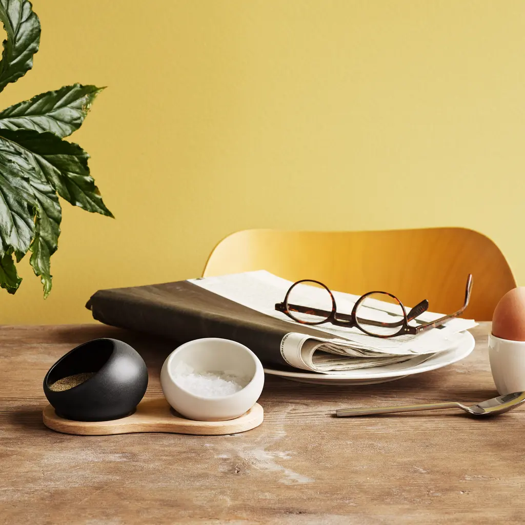 Salt and pepper give life flavor, but with the Rosendahl ceramic salt and pepper cellar you can also enhance your kitchen décor. Perfect for everyday use and special dinner parties in equal measure, these two small vessels bring the refined sophistication of Nordic design into your home. Made of quality porcelain, these ceramic salt pepper containers are durable and simply beautiful. They also come with a wood stand crafted from untreated European oak, offering an elegant way to set a fancy dining table or to make then most your breakfast. The black and white glazing sets the vessels apart, with the matte exterior adding an elegant accent to your dining table and the glossy interior making cleaning as easy as possible. Large openings provide an easy solution to take the right amount of salt and pepper to season dishes while also offering a convenient way to see when you need to fill the vessels. Perfect as a housewarming gift, the Rosendahl ceramic salt and pepper cellar transforms an everyday experience into an elegant gesture.