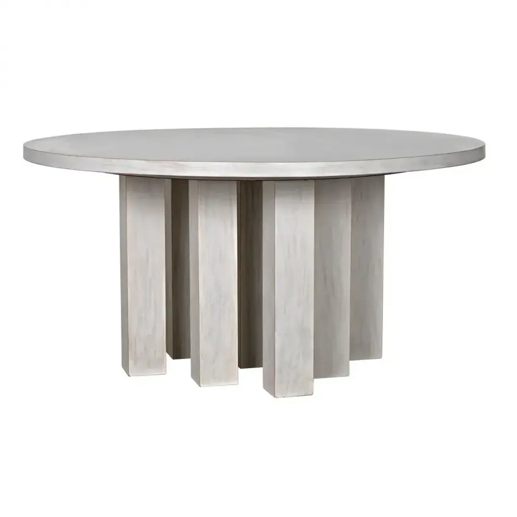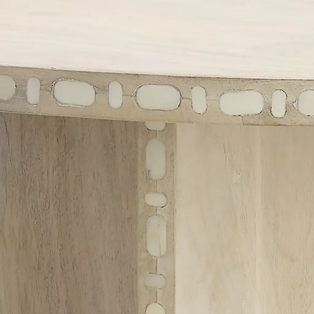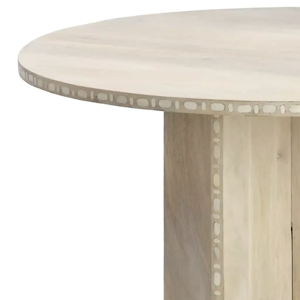 The Sama Round Bistro Dining Table from Jamie Young Co. unites sustainable mango wood with water buffalo bone inlay, creating an interesting visual display. Its rounded surface and surrounding structure are hand-finished with a patina that highlights the wood's natural traits, while the bone inlay border adds delicate detail without overwhelming the design. A perfect rustic addition to dining and kitchen spaces.